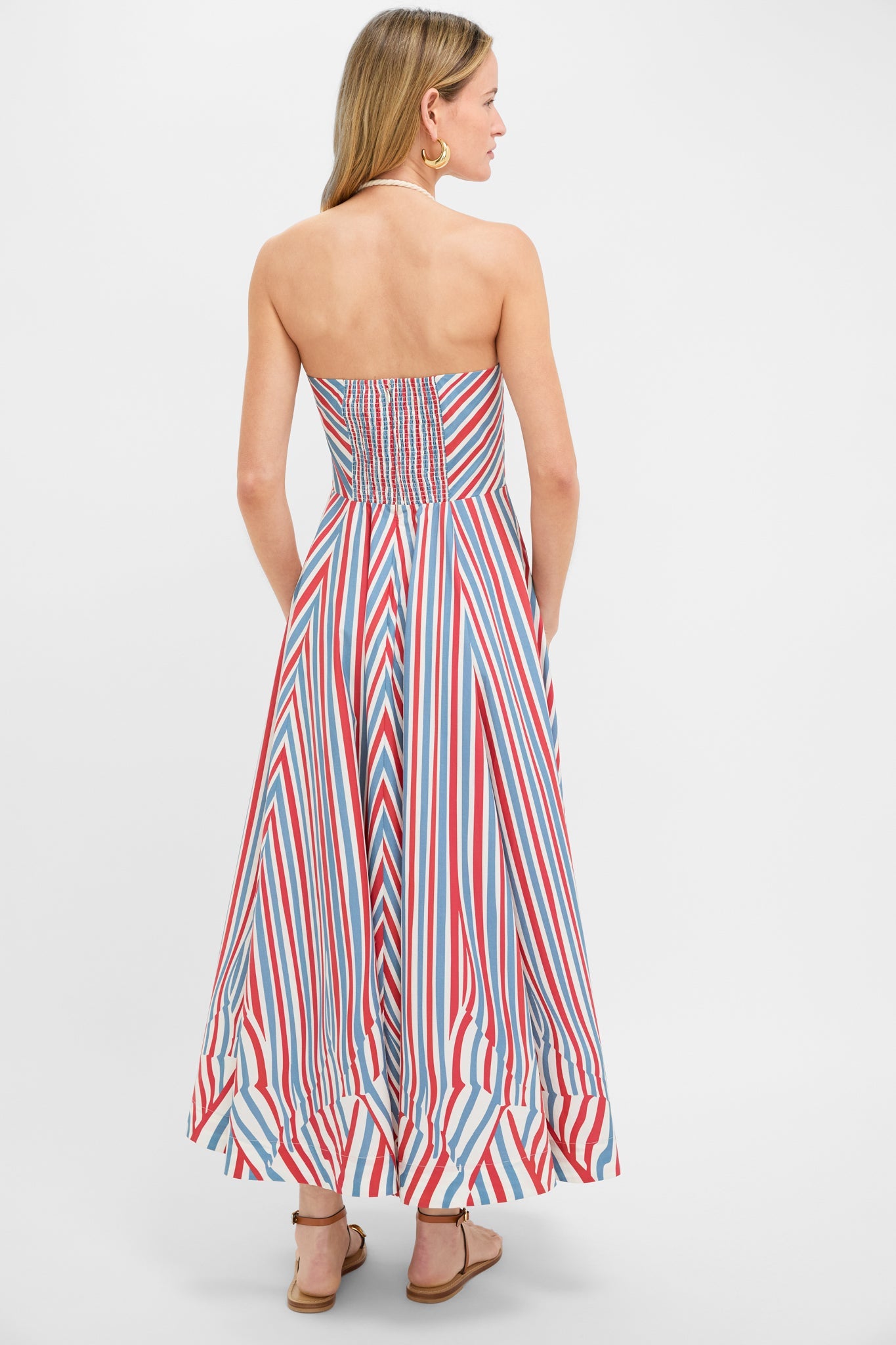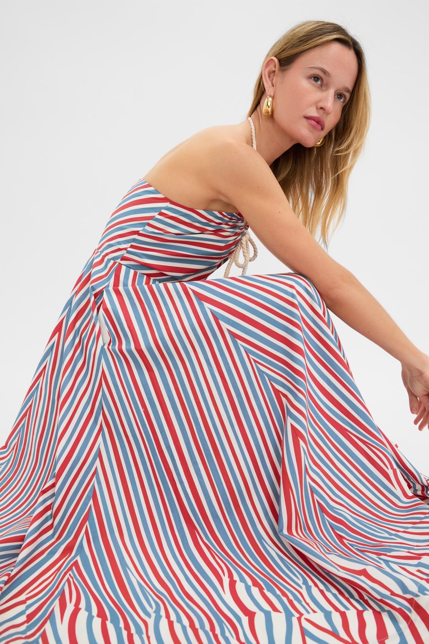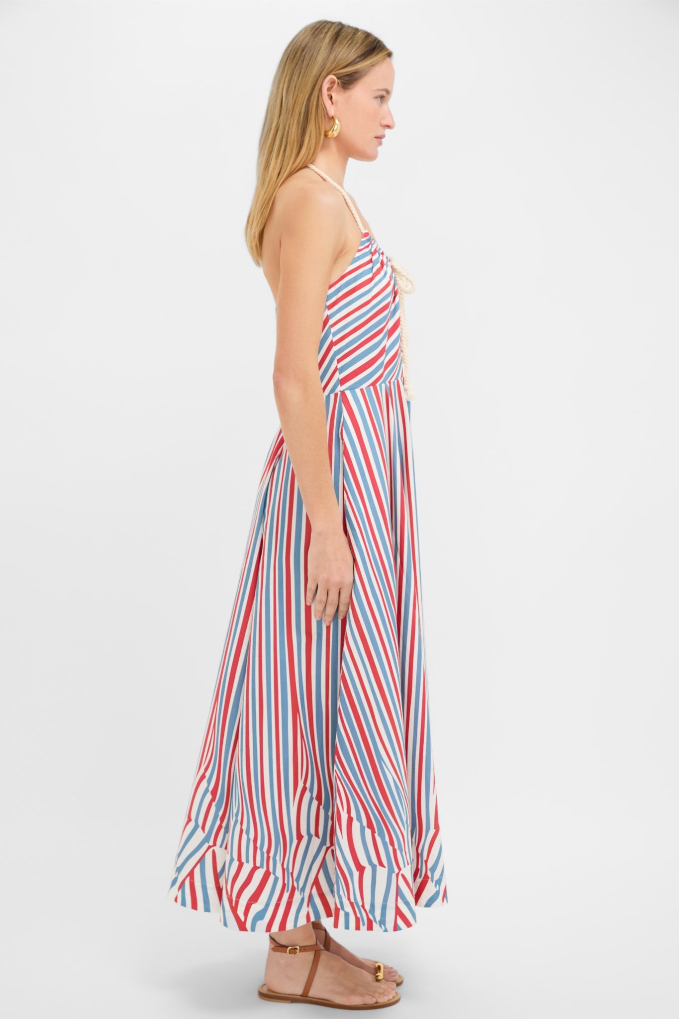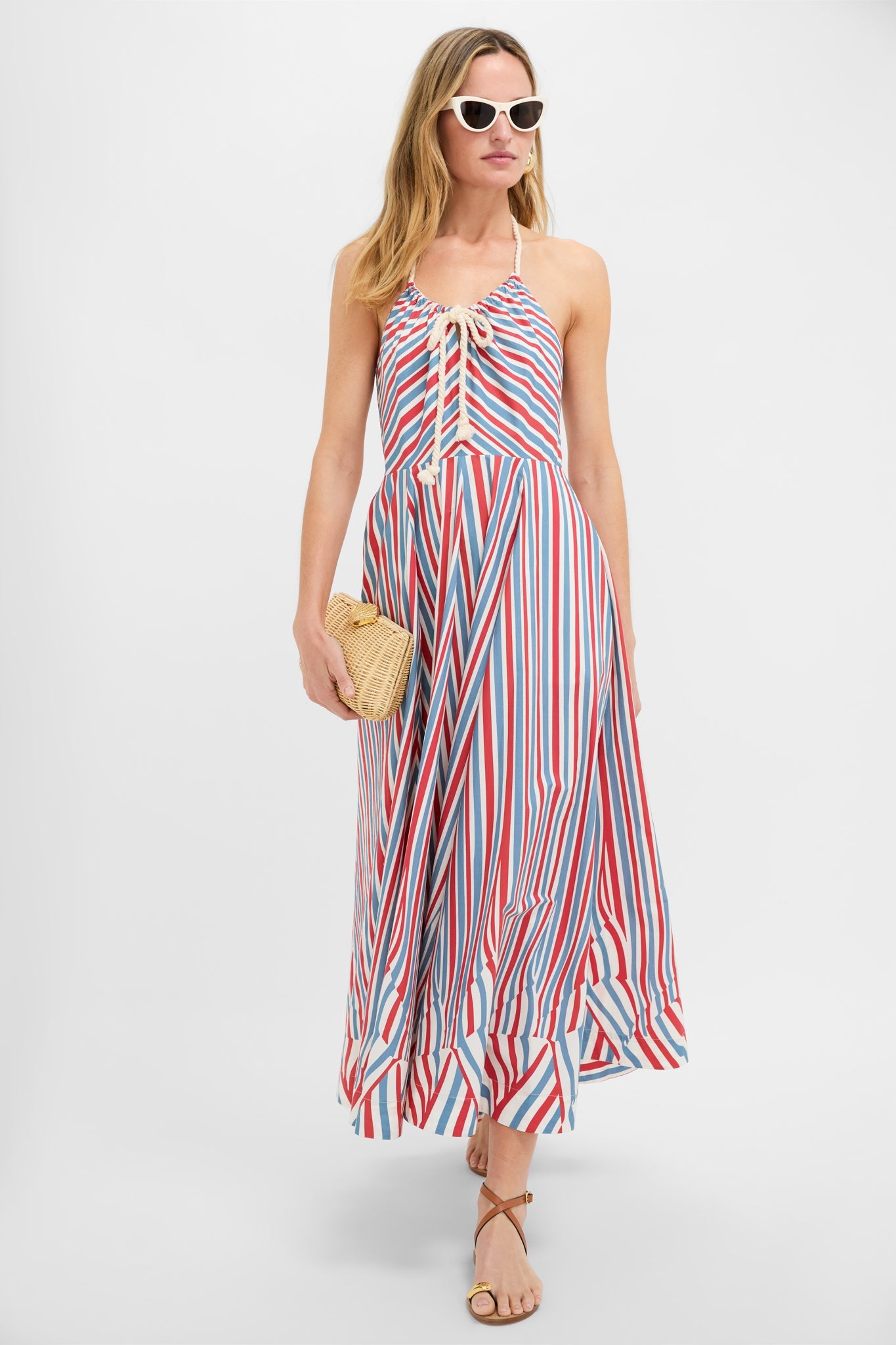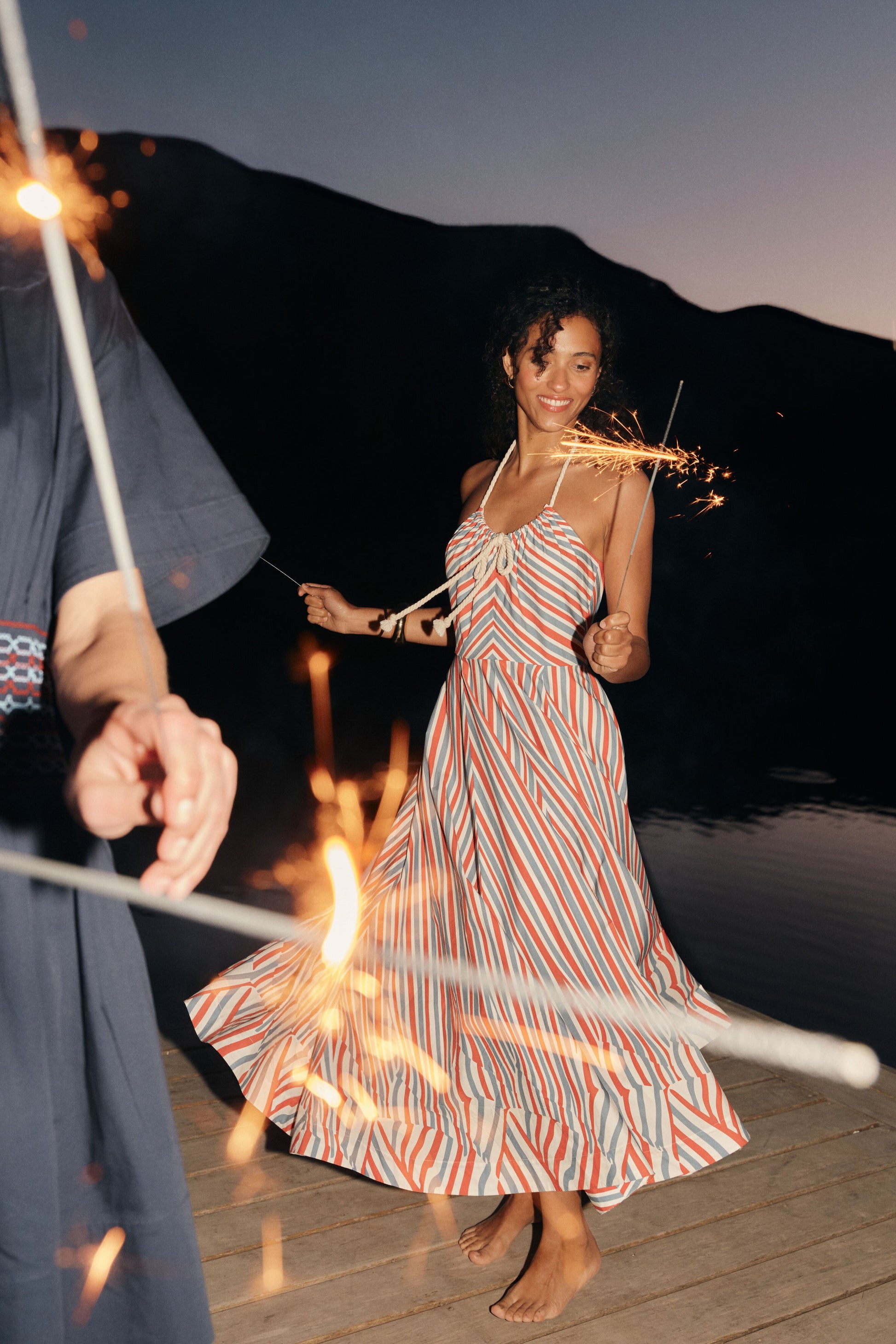 The Americana Stripe Sierra Dress is a festive halter maxi with a rope neck tie, full skirt, and nostalgic striped print. Perfect for backyard barbecues or evening cocktail parties, we are styling this with sandals or espadrilles!