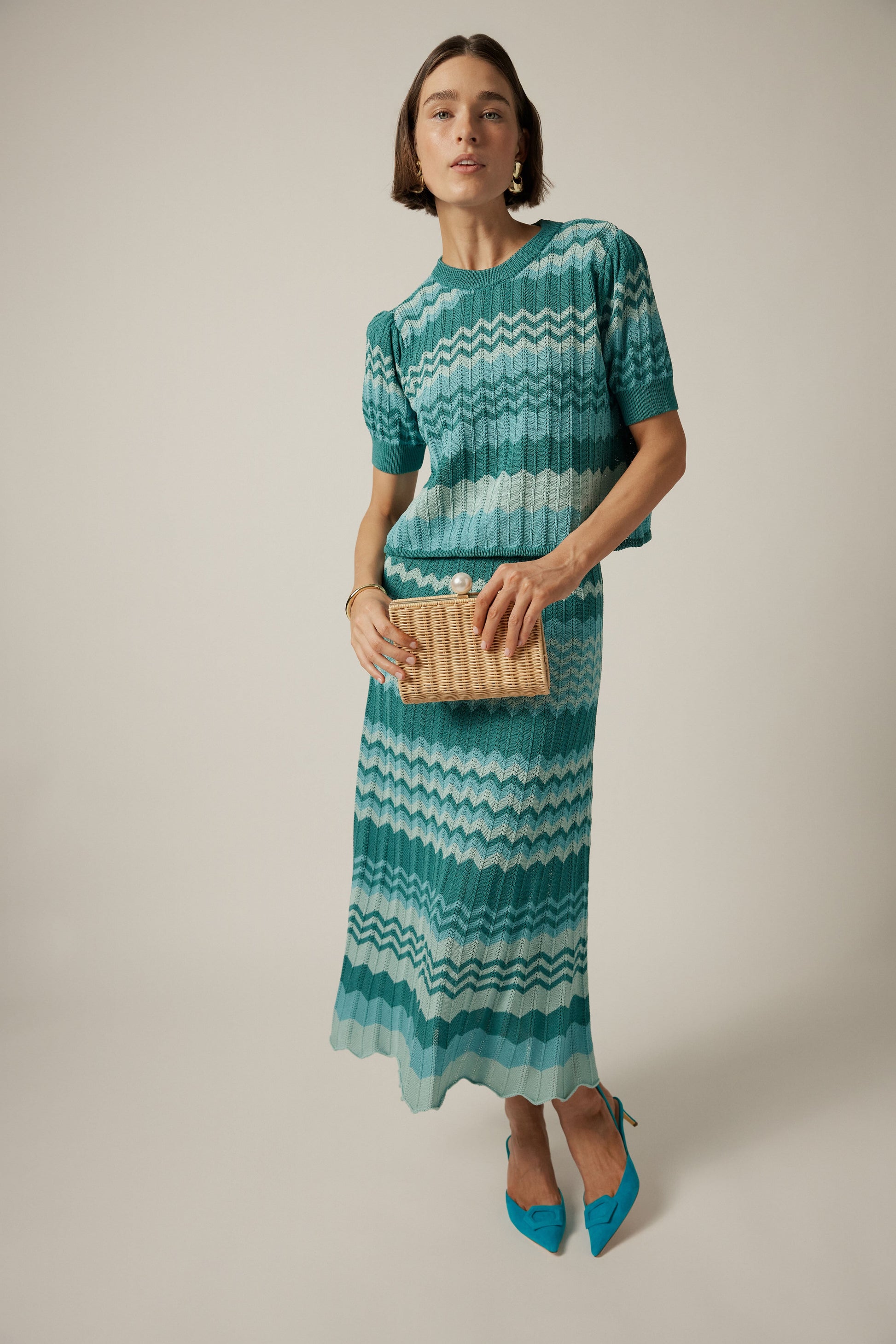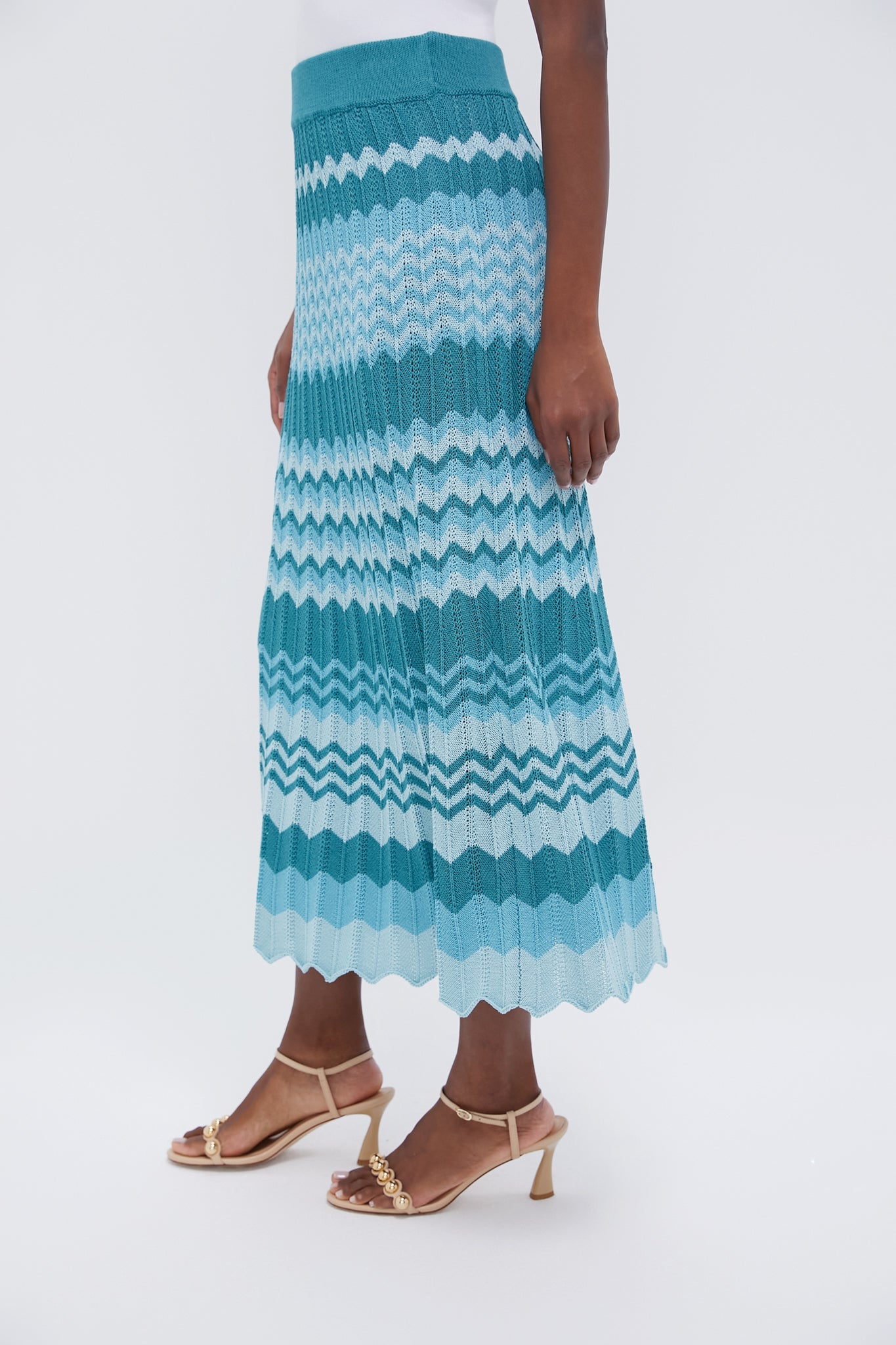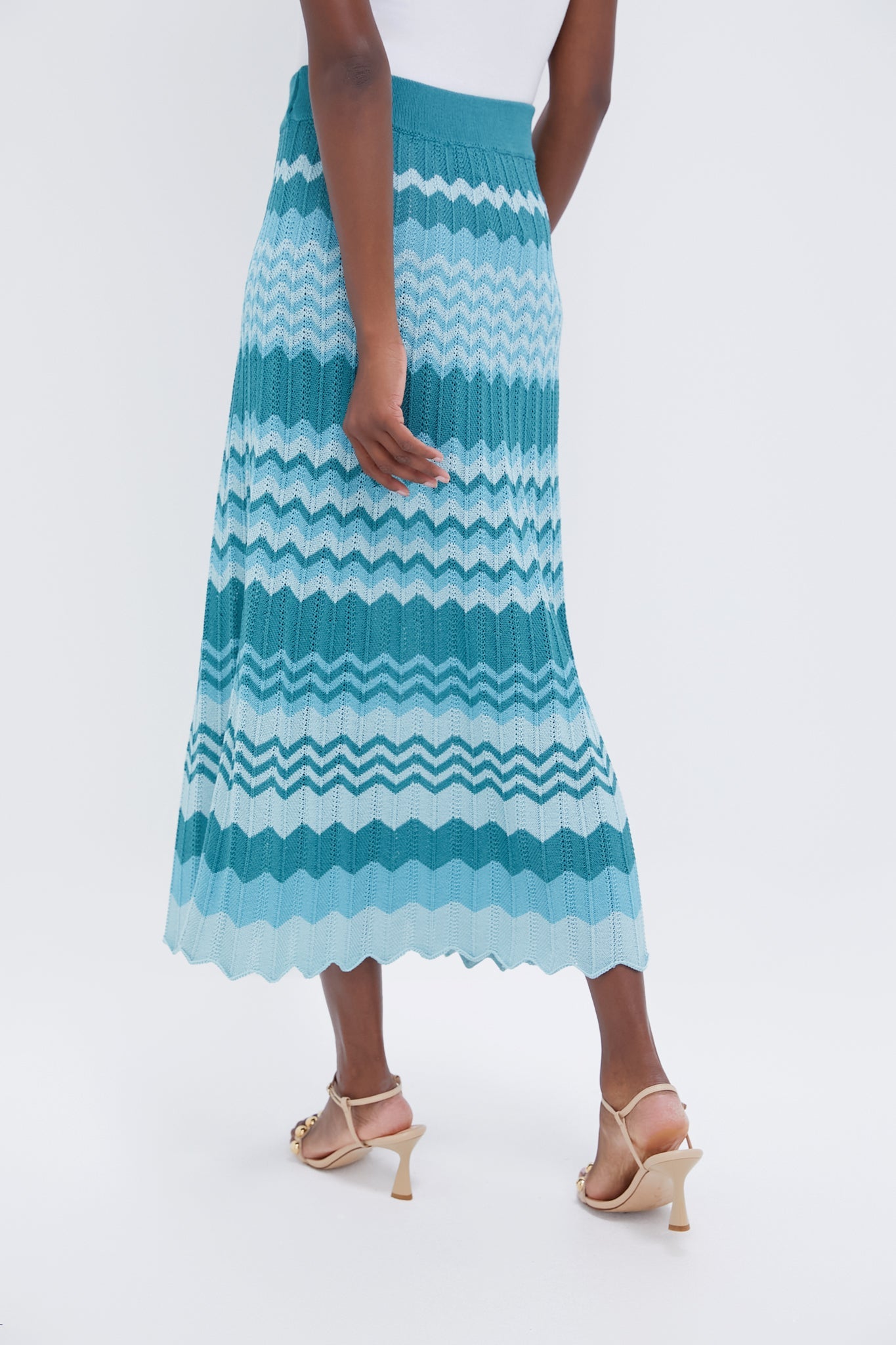Oh-so-elegant, this midi features a lightweight knit, chevron stripes, and a flattering slight A-line silhouette. Pair with a white blouse and sandals for a picnic, or with the matching Aqua Crochet Stripe Sylvie Top for a chic luncheon set.