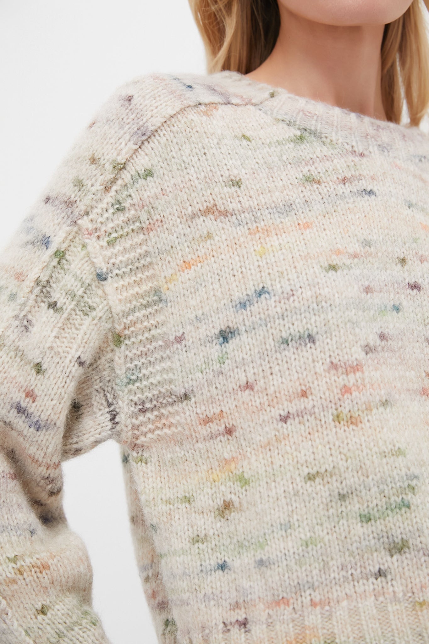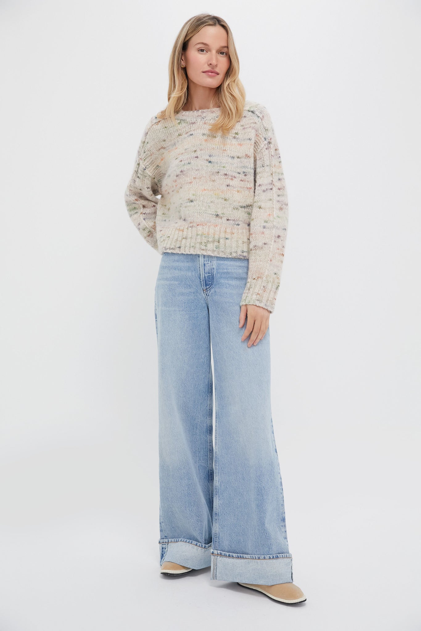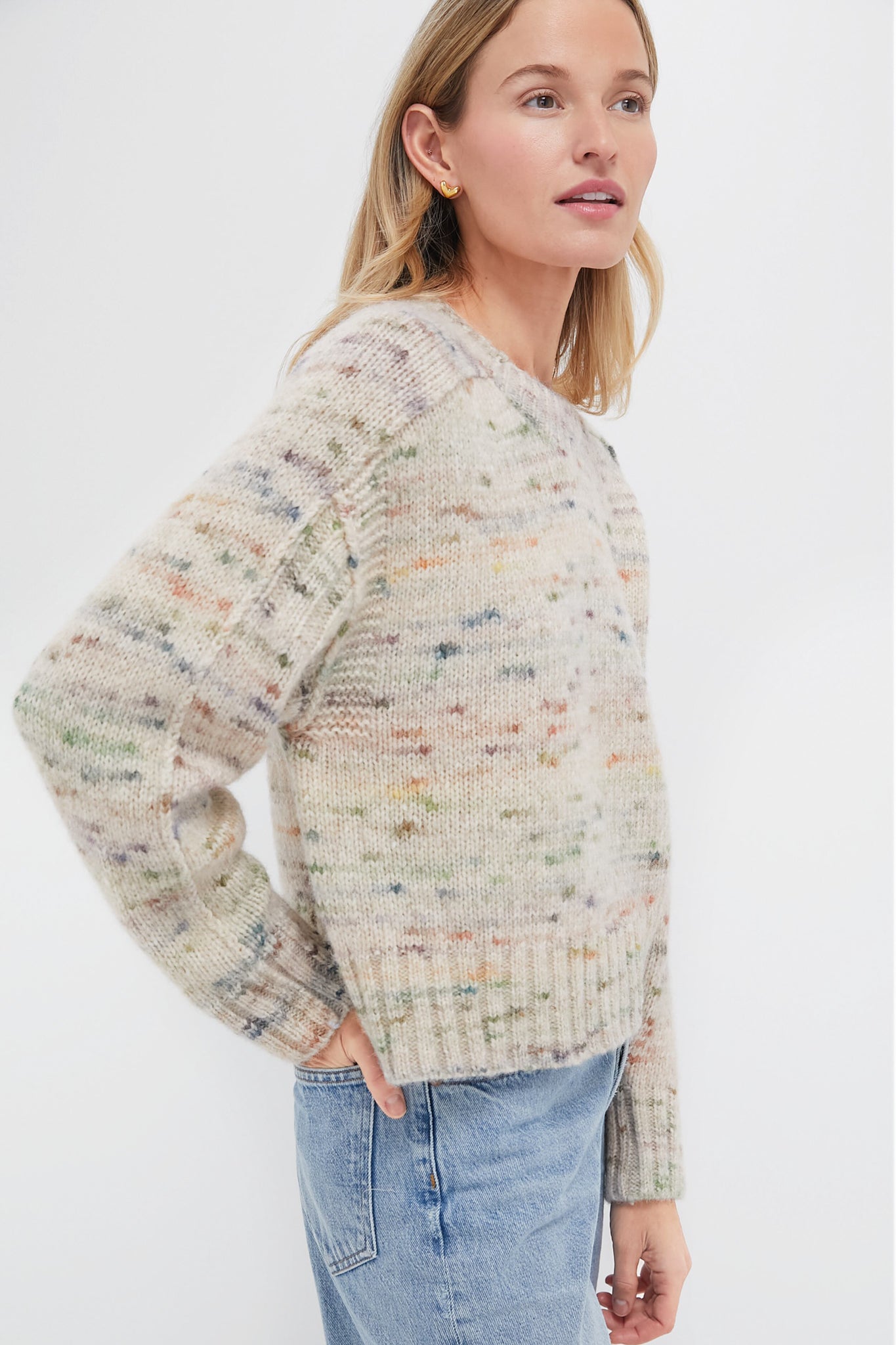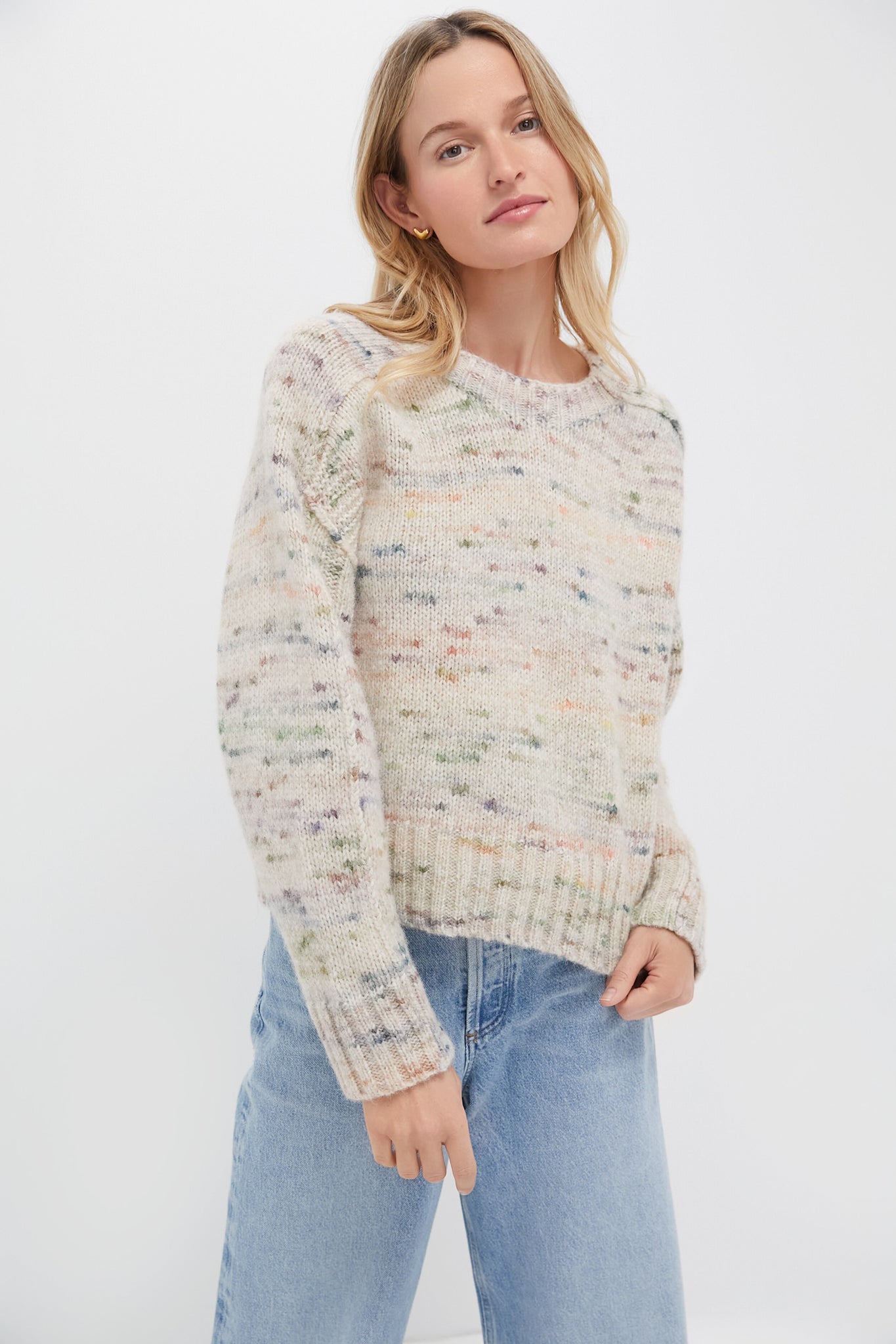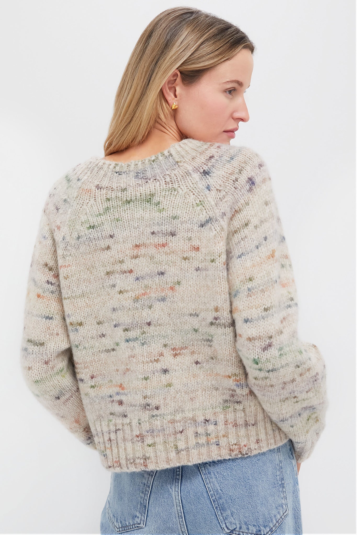 The Aquarelle Elmer Sweater has soft, cozy texture with a multicolored mottled effect on a light beige knit. Its loose, slightly oversized cut, combined with long raglan sleeves, makes it an ideal piece for your chilly days while staying on trend. Pair it with wide leg denim, flats, and a suede handbag for a cozy look!