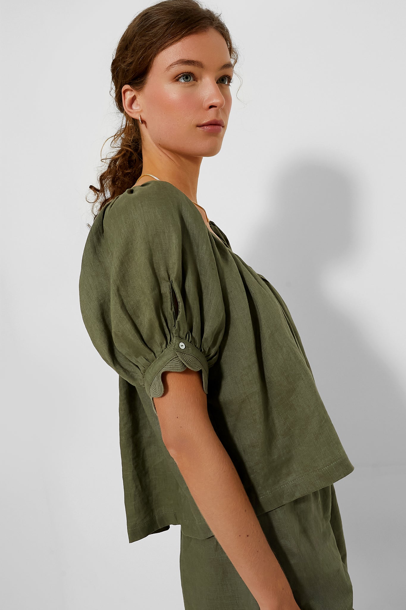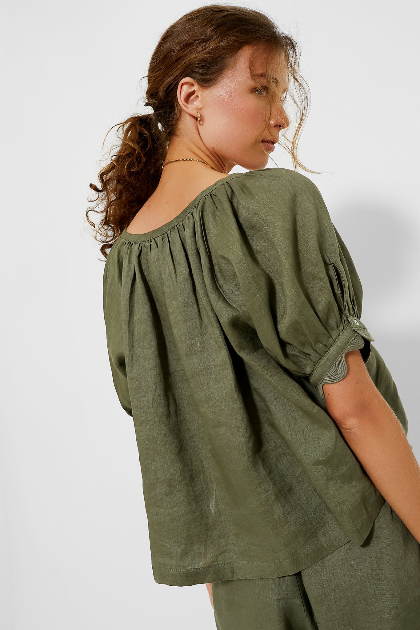 The perfect linen top is a summer essential. Good thing we’ve got just the one you need. The Army Green Linen Tully Top features a scoop neckline, short puff sleeves with scalloped cuffs, and a boxy, slightly cropped fit. Wear with denim and sneakers, or with the matching Army Green Linen Ava Short and sandals for a chic set.