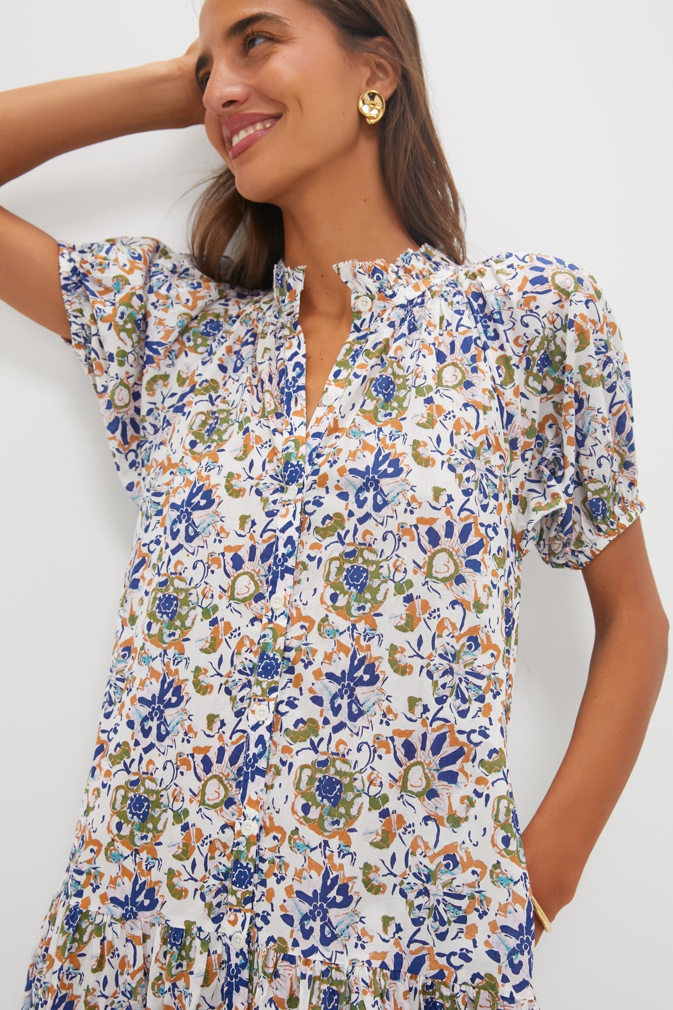 The Batik Floral Cream Mazza Maxi is an elevated everyday style. Boasting short puffed sleeves, a tiered skirt, and a self-tie waist belt, the flattering silhouette is complimented with an intriguing multi-colored print. Pair with heels or flats for an instantly put-together look!