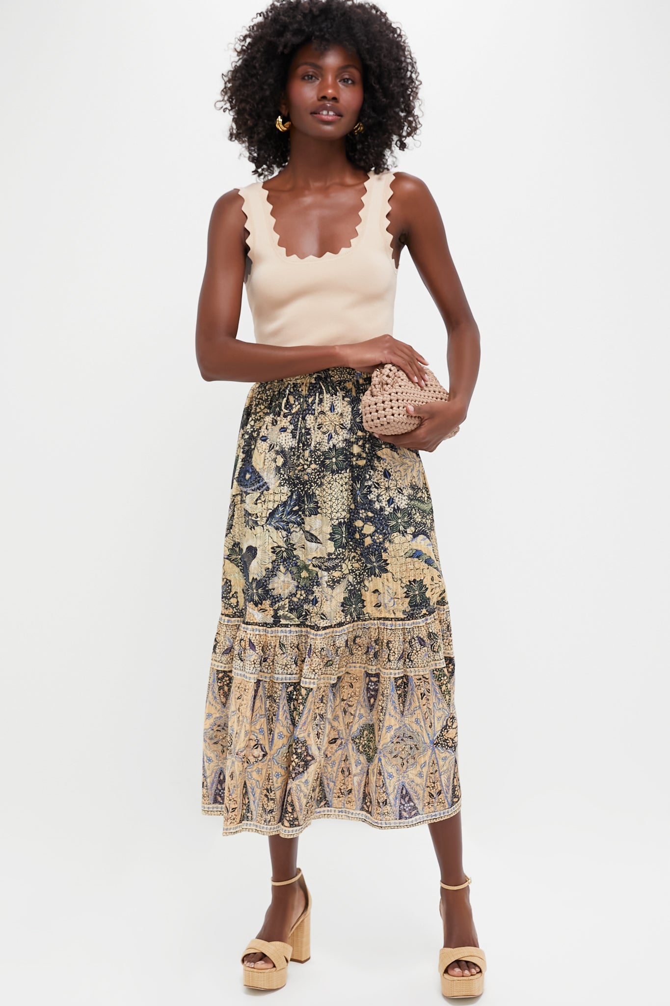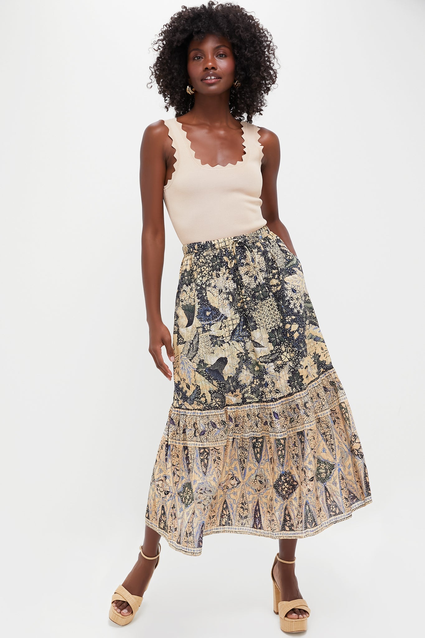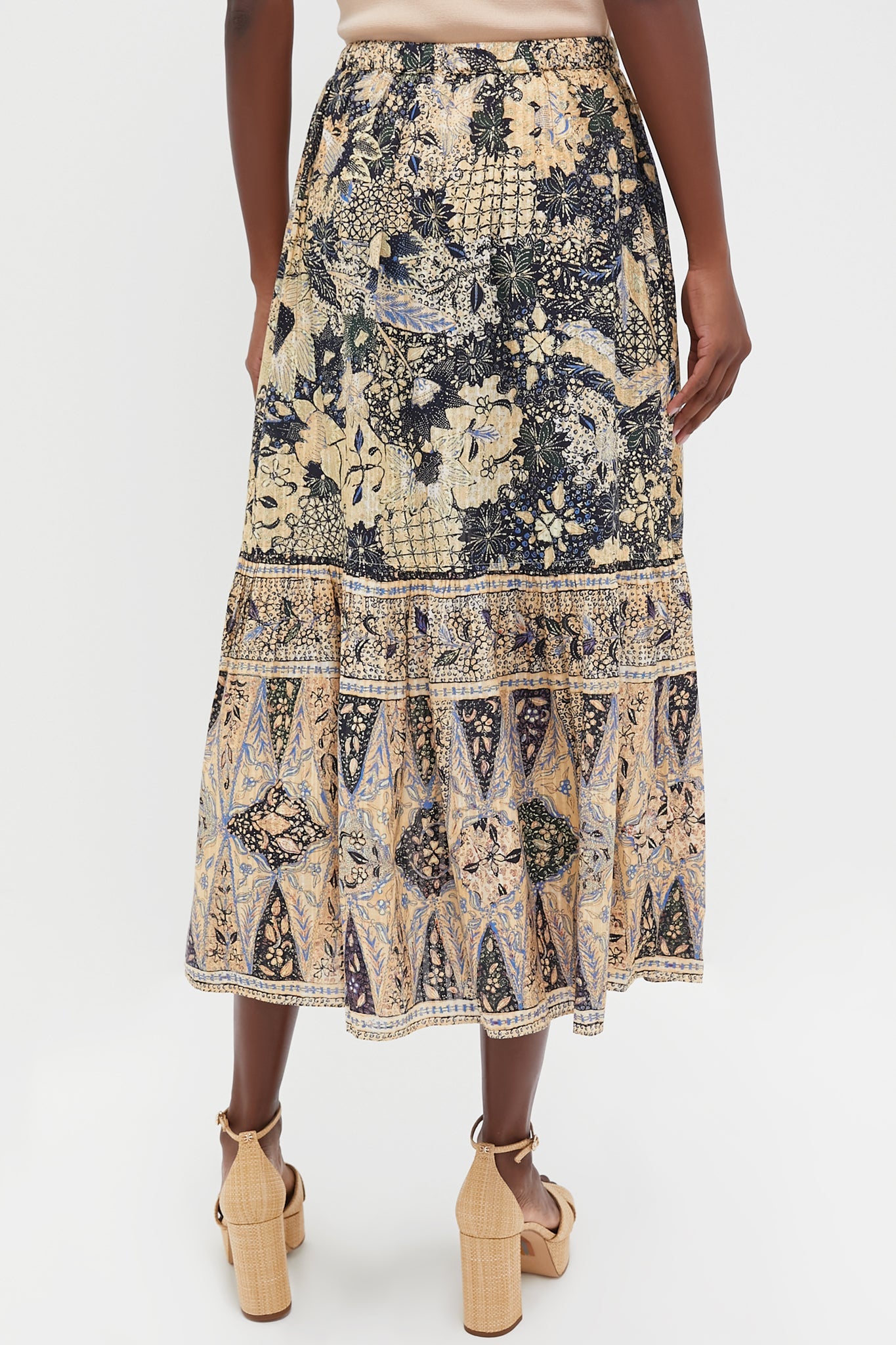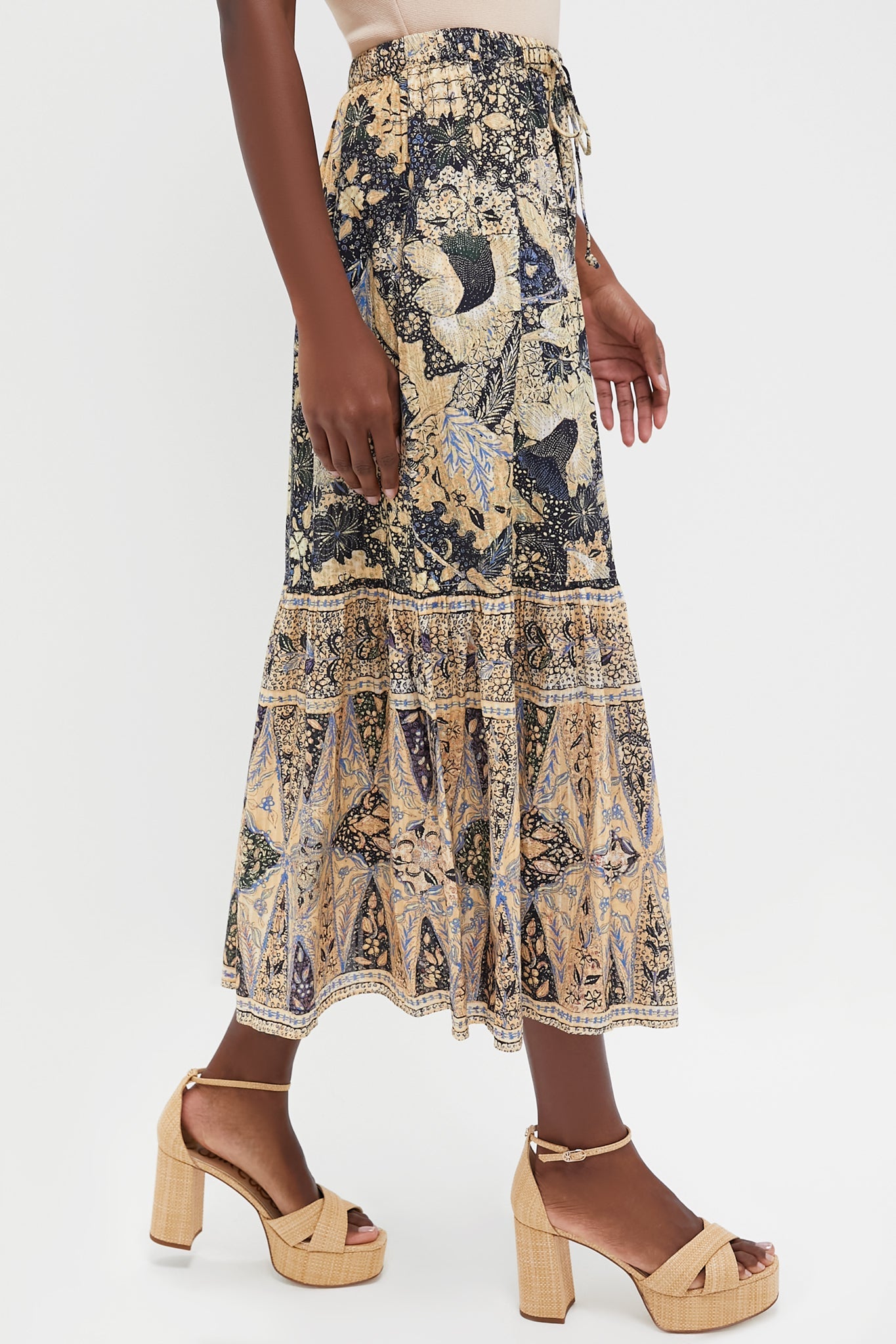 The Olina Skirt catches the eye with a dynamic mix of botanicals and graphics inspired by a vintage batik print, layered and whirled atop subtle stripes. Crafted from airy cotton blend, this multicolored skirt has an elastic drawstring waist for comfort, side pockets, and unfurls to a midi hemline full of poetic volume. Pair with a simple tank and sandals or a sweater and boots!