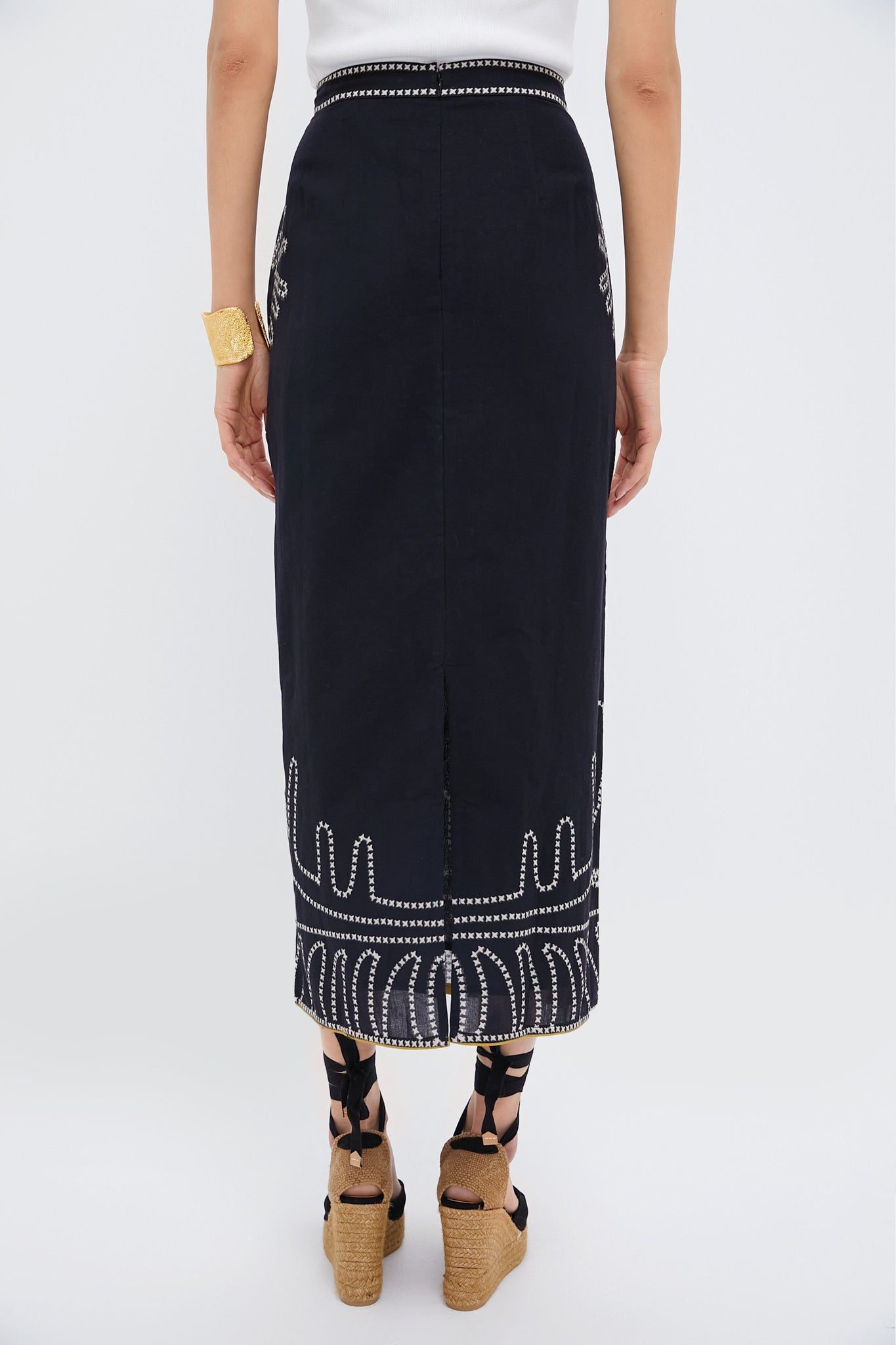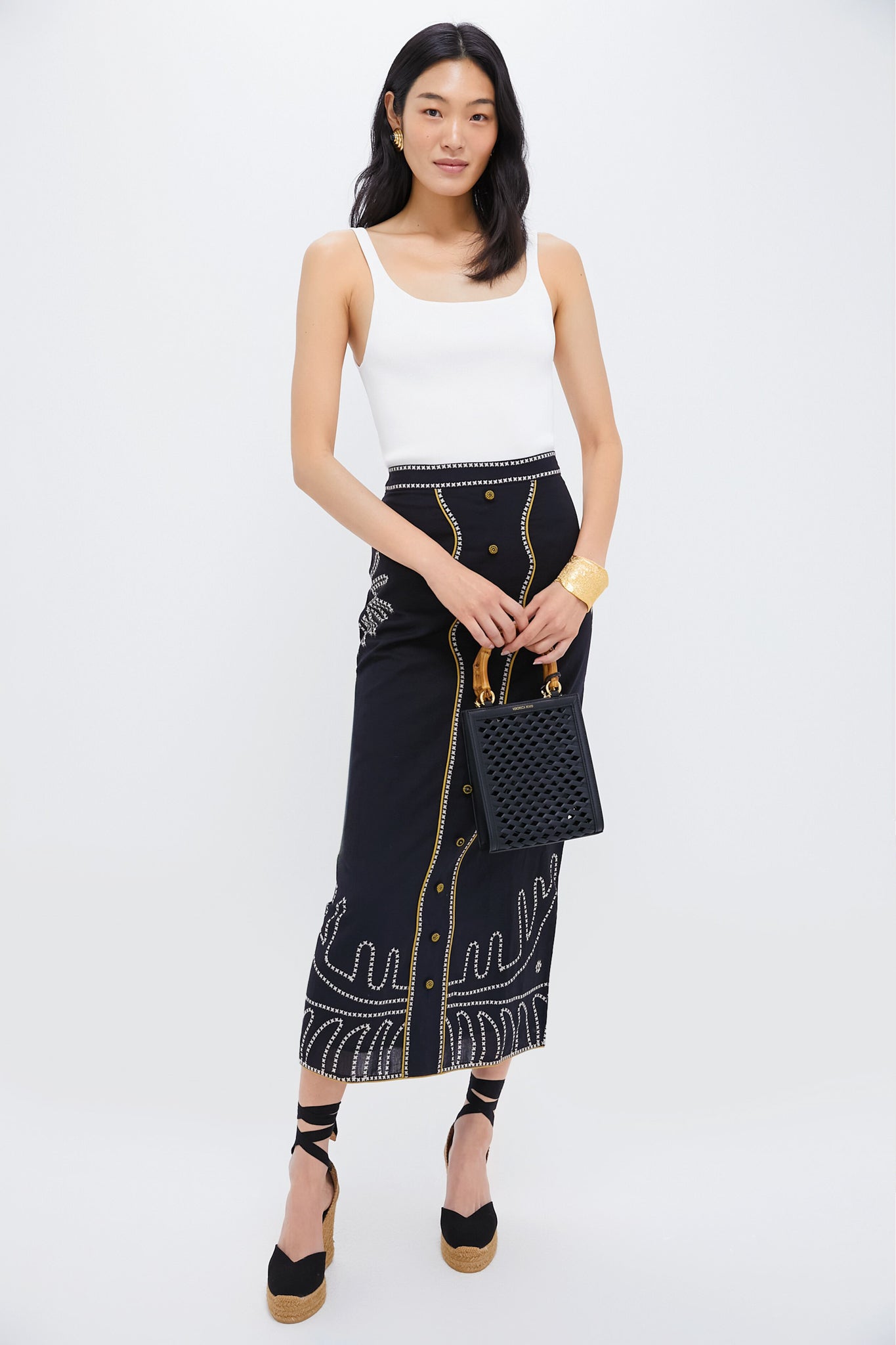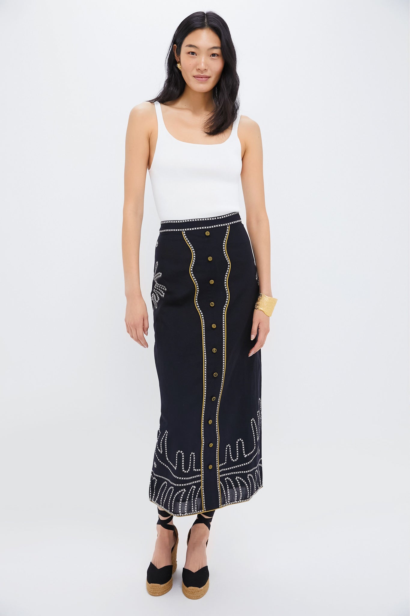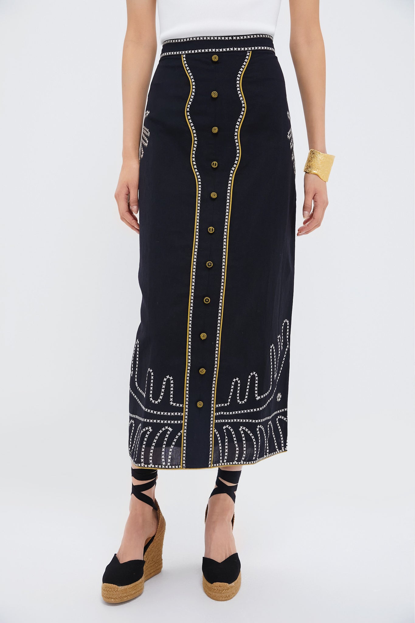The Black and Lime Stitch Portia Skirt features intricate contrast stitching and button detailing for a bold, artisan-inspired look. The flowing design and comfortable fit will make you feel confident and stylish. Pair it with a fitted tank, statement wedges, and gold accessories for a chic yet effortless ensemble.