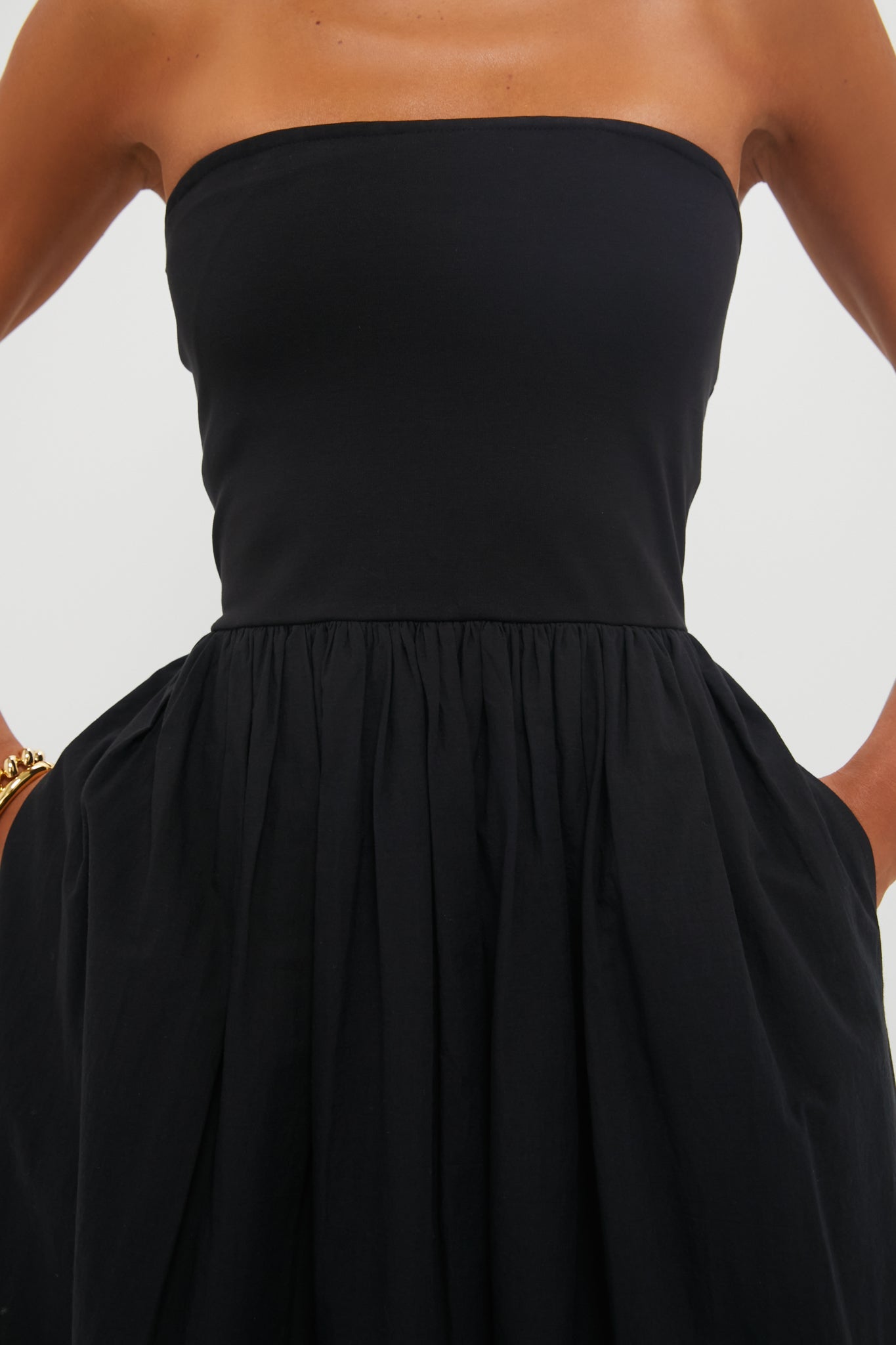 The Black Harper Dress is an effortless, elegant style perfect for summer weddings and al fresco dinners. With a stretch bodice, strapless neckline, and eyelet detailing along the hem, this easy throw-and-go style can be paired with heels or sandals for endless occasions!