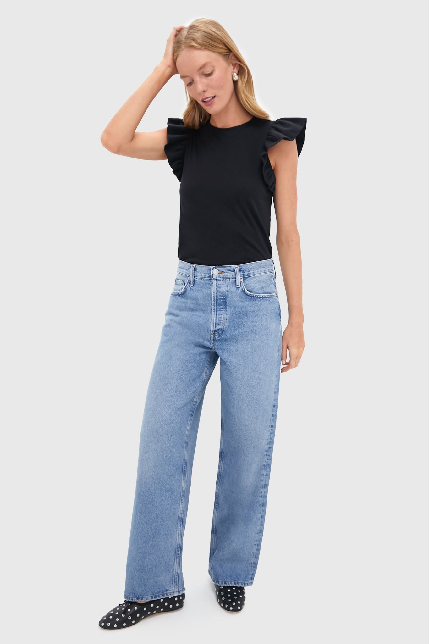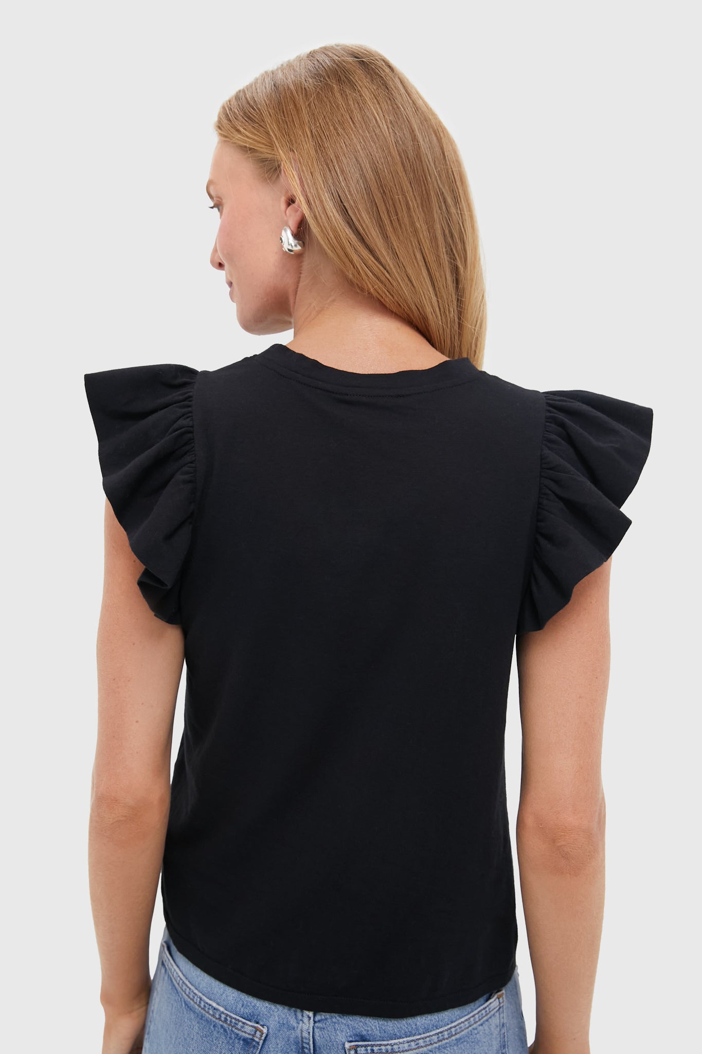 Bored of your regular-schmegular old tees? Introducing the Black Kaia Flutter Sleeve Tee — a feminine and fresh take on a classic. With a high crew neckline that brings an extra hint of polish, a lightweight stretch knit fabric that feels great on the skin, and those fun sleeves of course, there't nothing not to love here. We are wearing it with go-to denim, cool trousers, and breezy shorts all year long. It's really just that essential.