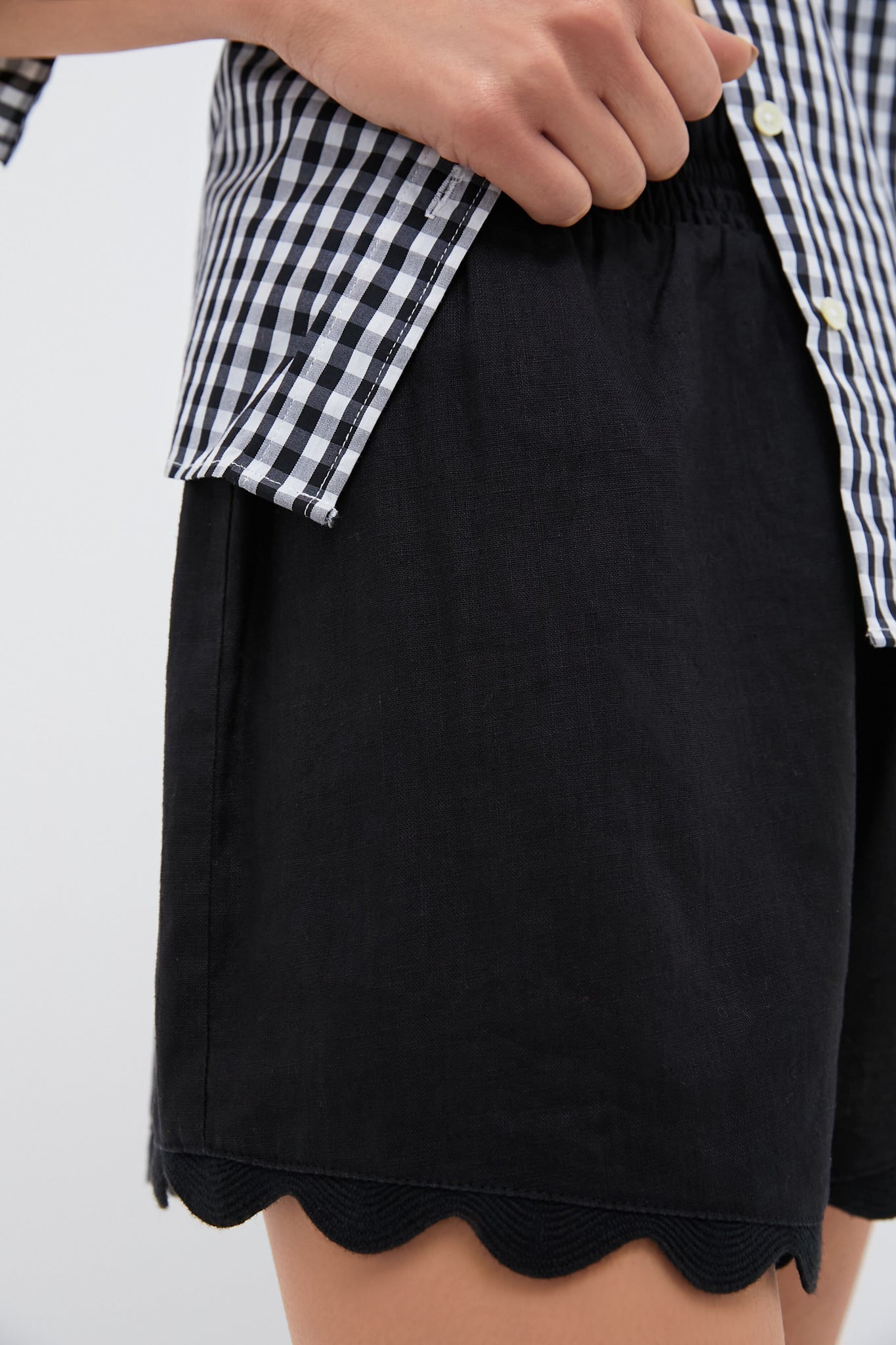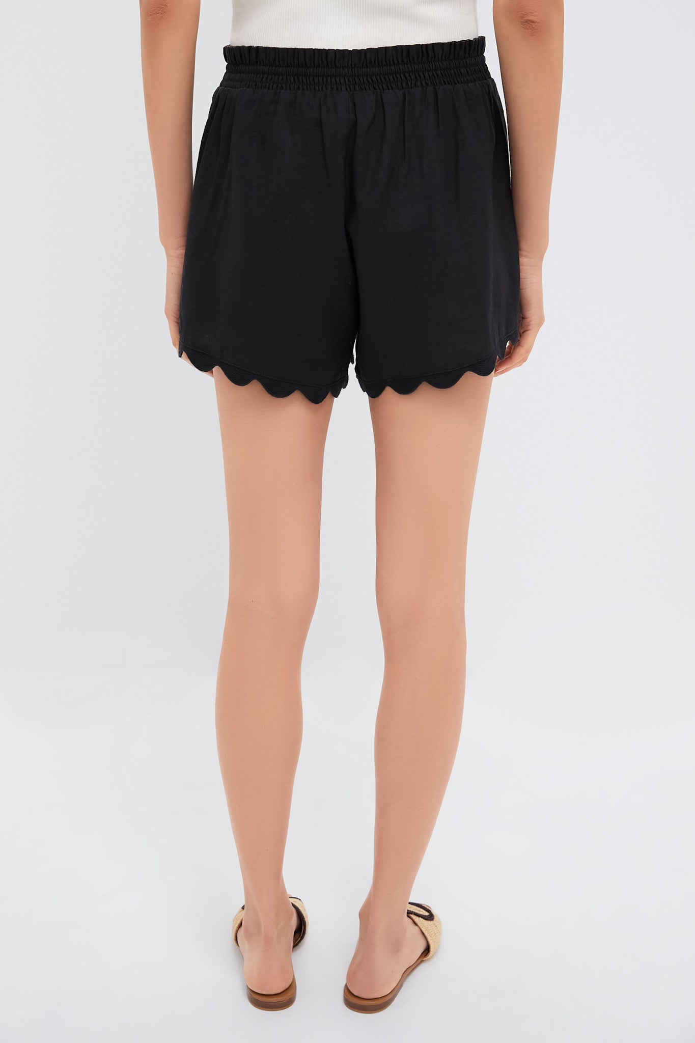 The Black Linen Ava Short make for an easy summer style that can be paired with just about anything. These breezy, neutral beauties feature a comfortable elastic waistband with a fun scalloped hem. Pair with a ribbed tank and sandals, or with the matching Black Linen Tully Top.