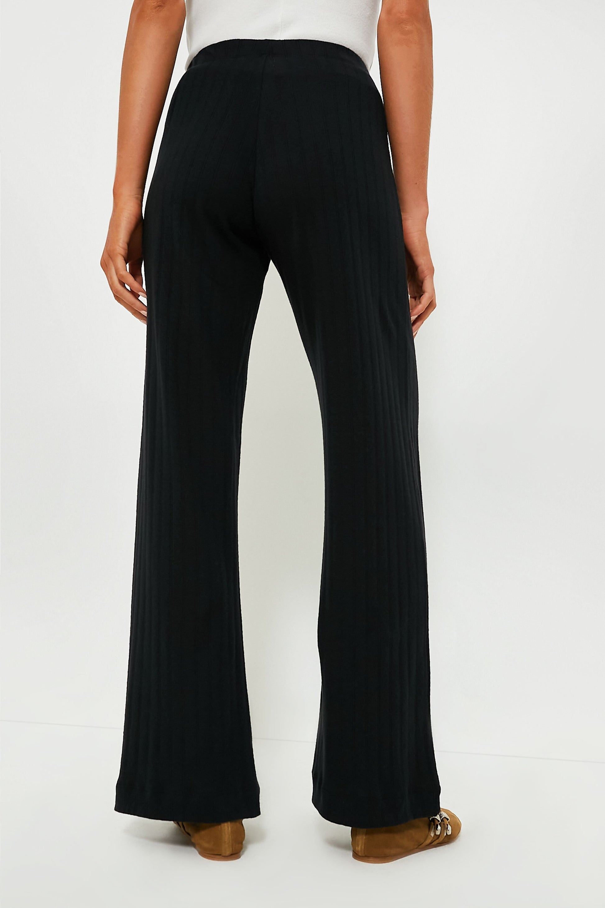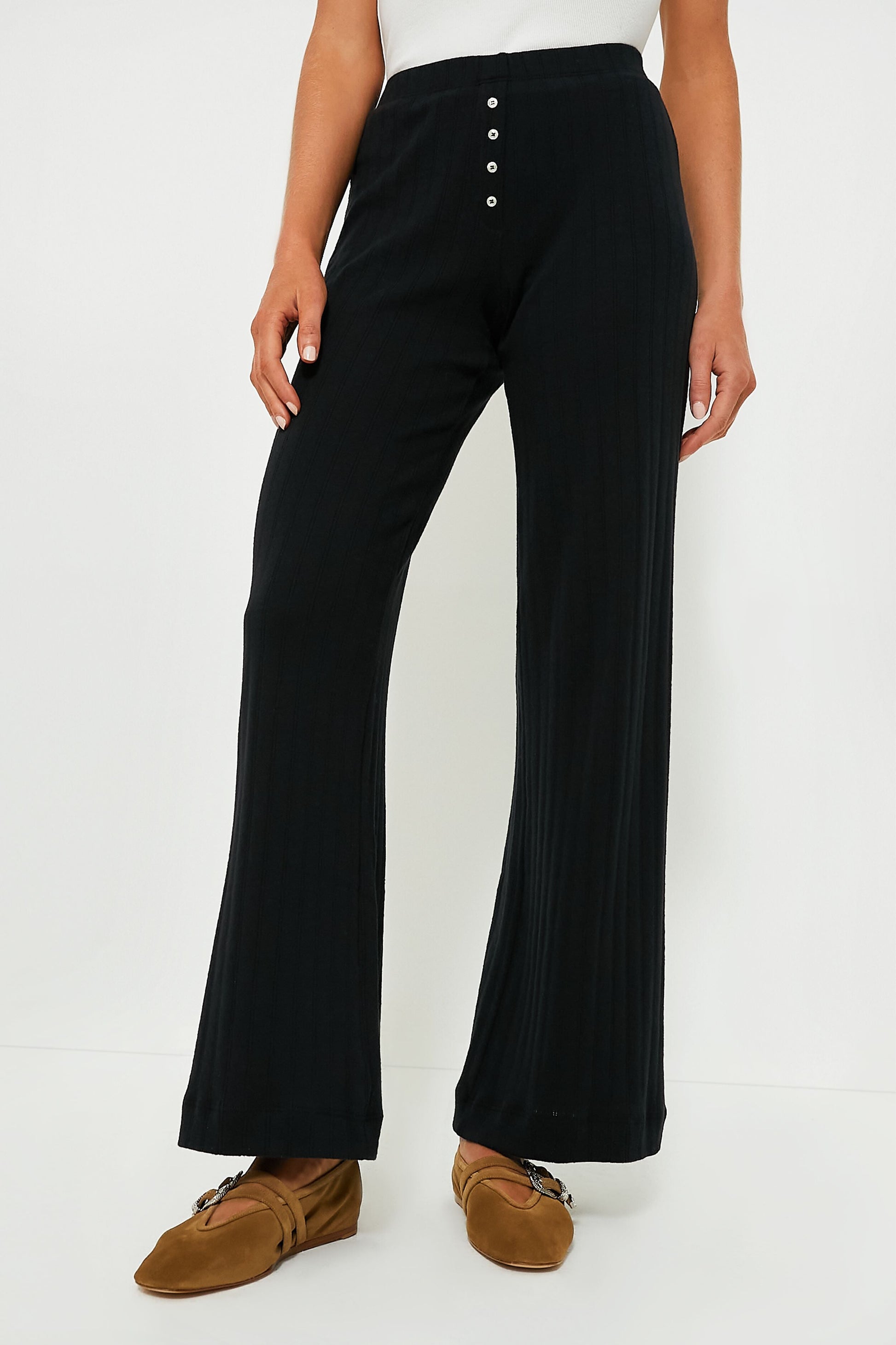Cozy and chic, the Black Pointelle Boxer Pant is a relaxed, wide leg silhouette, featuring pinhole stripes, dainty eyelets, henley buttons and a comfortable elasticized waistband that sits at the natural waist. From chic airport looks, to lounging around the house on a dreary Sunday, to grocery store runs, pair it with the matching Black Pointelle Classic Crew Cardigan for the perfect girl-on-the-go look all year long.