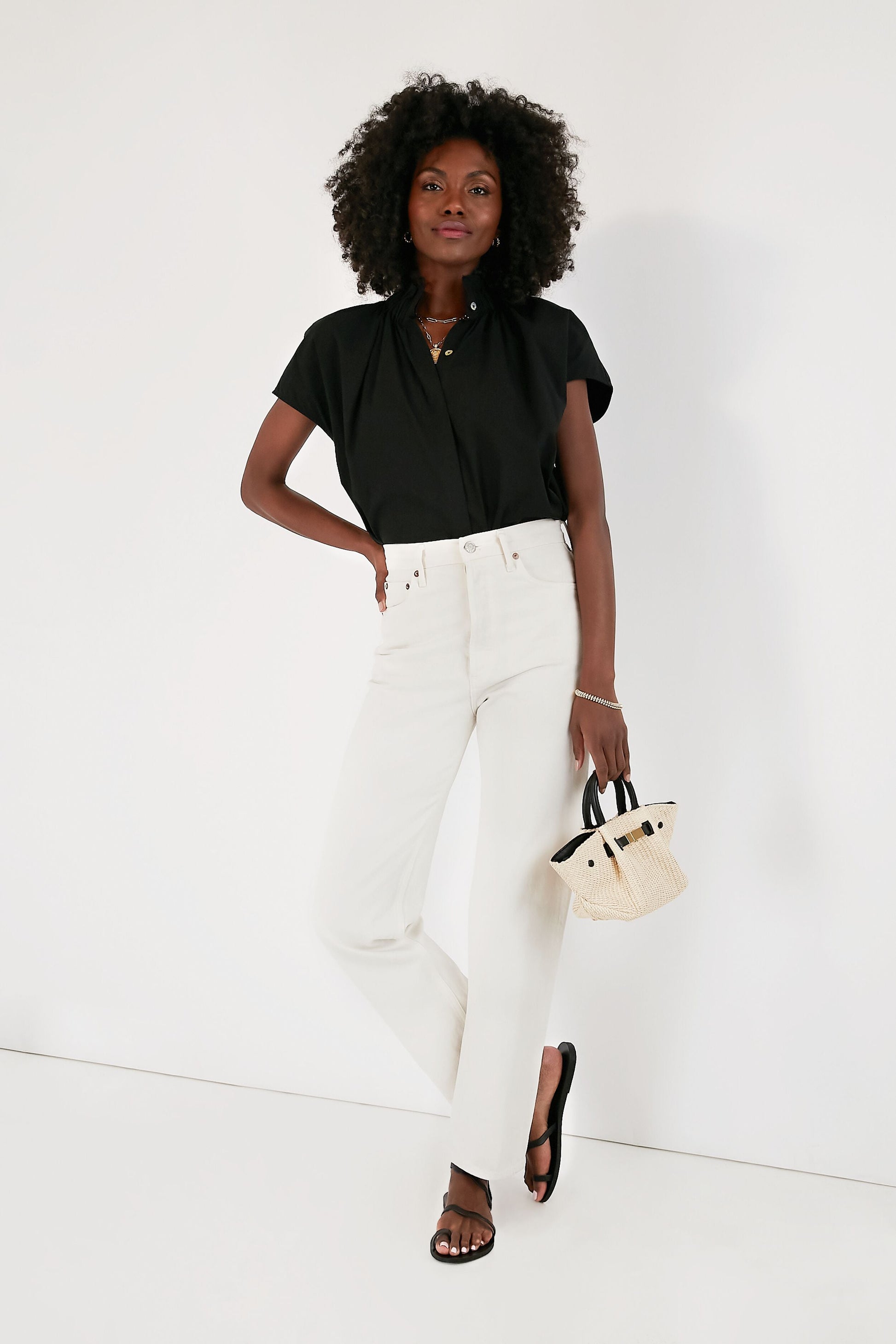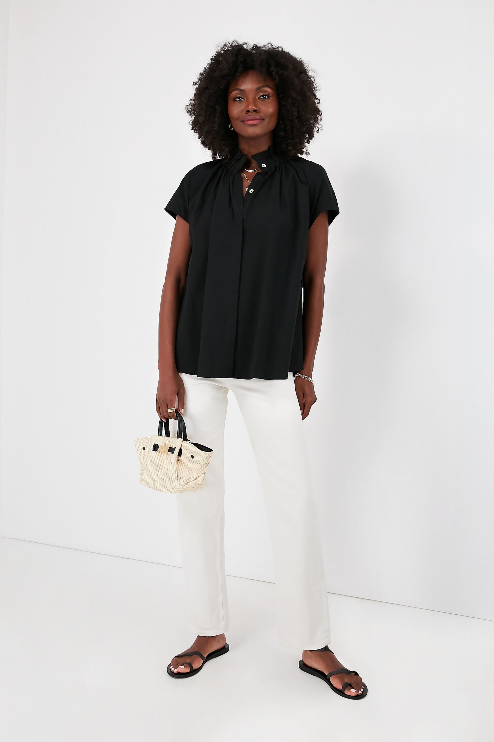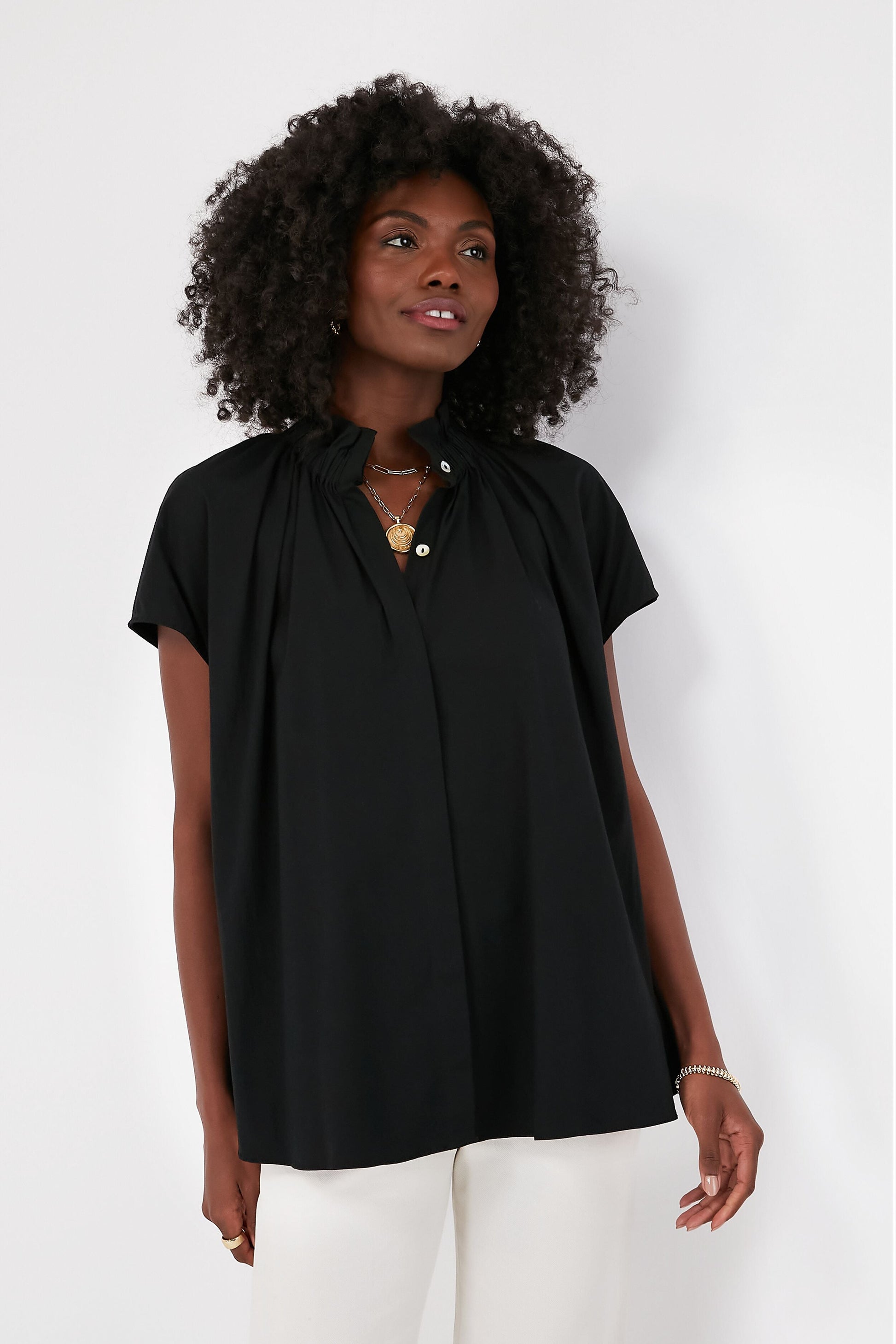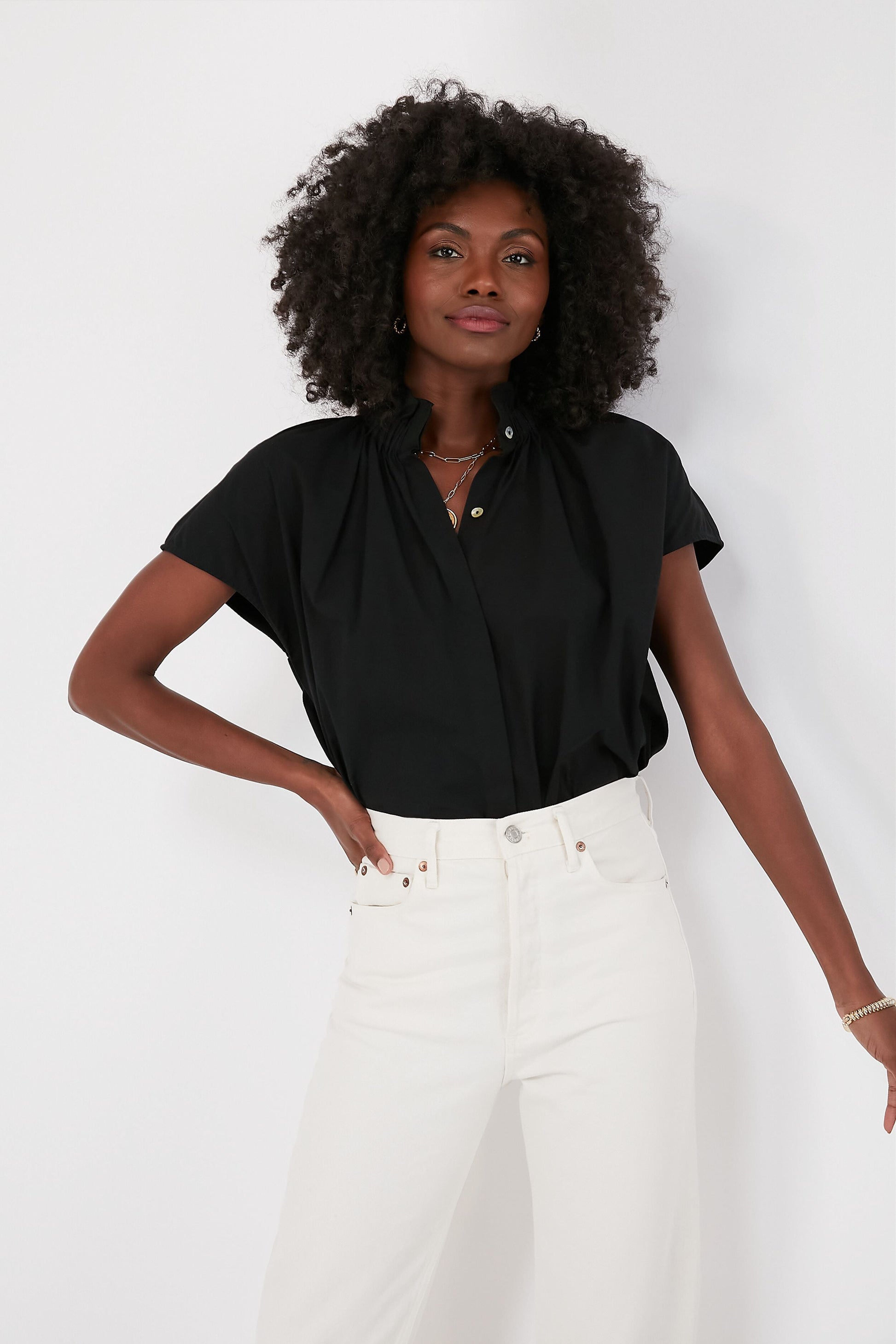 Effortlessly chic, the Rae Blouse takes everything we love about a classic button down and elevates it with fun, feminine details. Featuring a high neck ruffle collar, short cap sleeves, and a button front placket, this classic black shirt pairs well with denim of all colors and gold jewelry for an effortless day to night look from the office to dining out with friends.