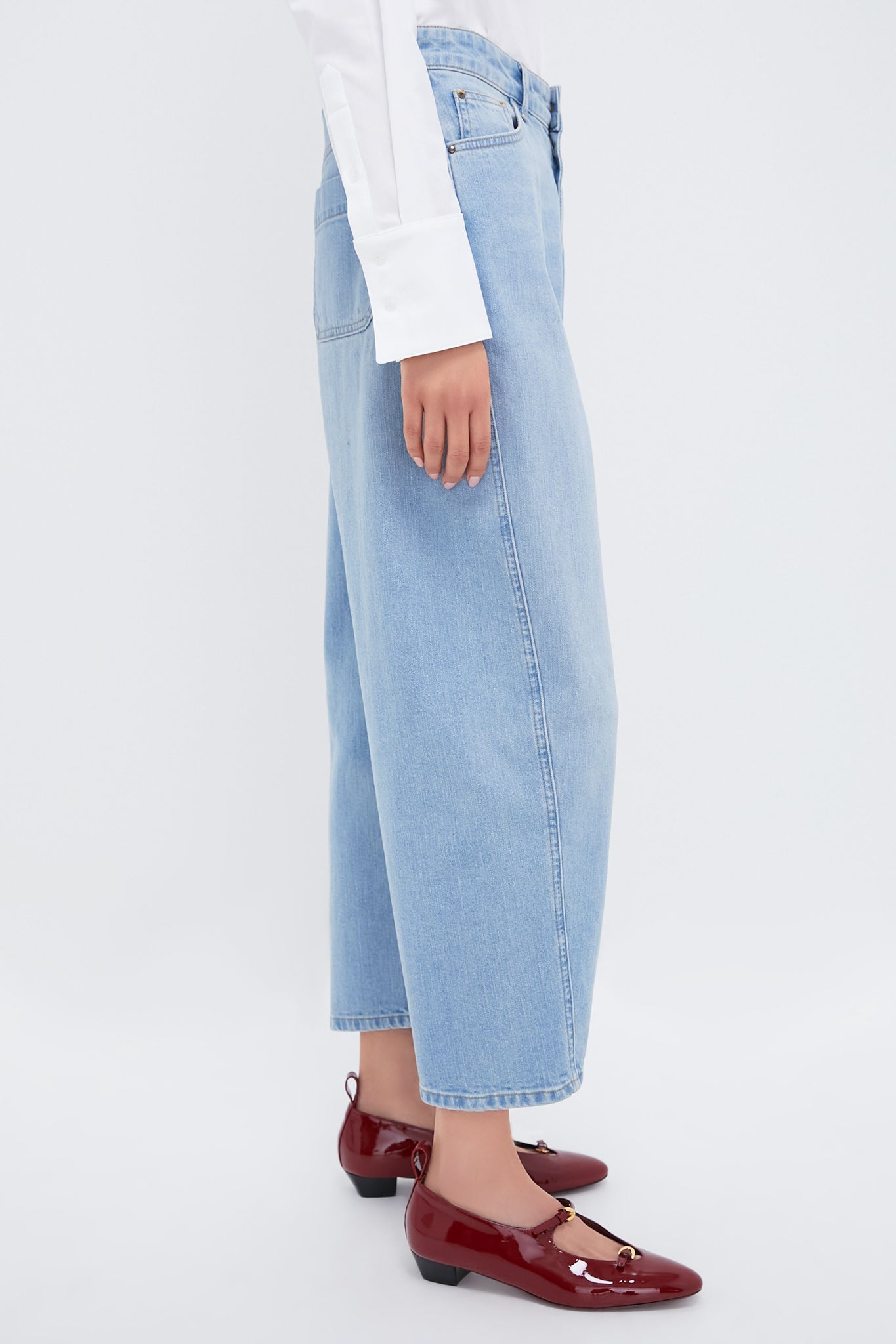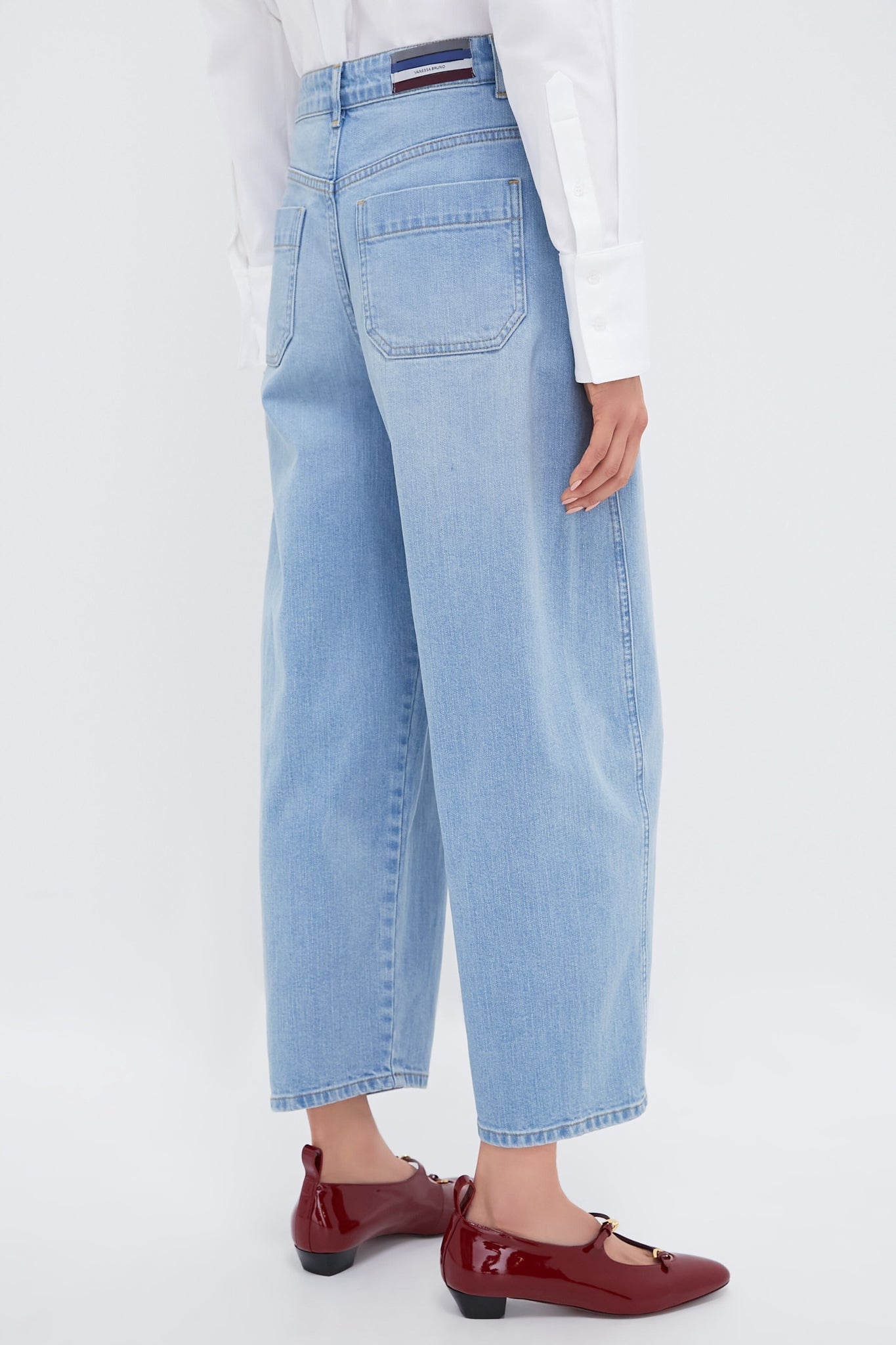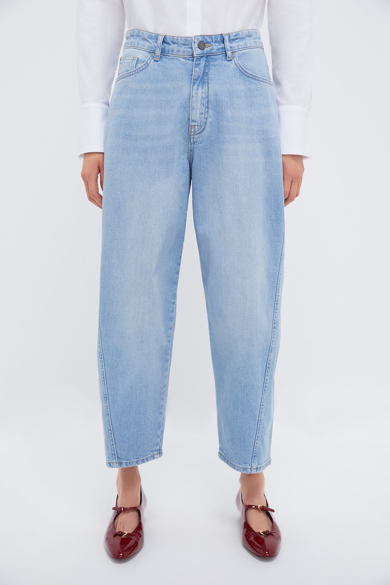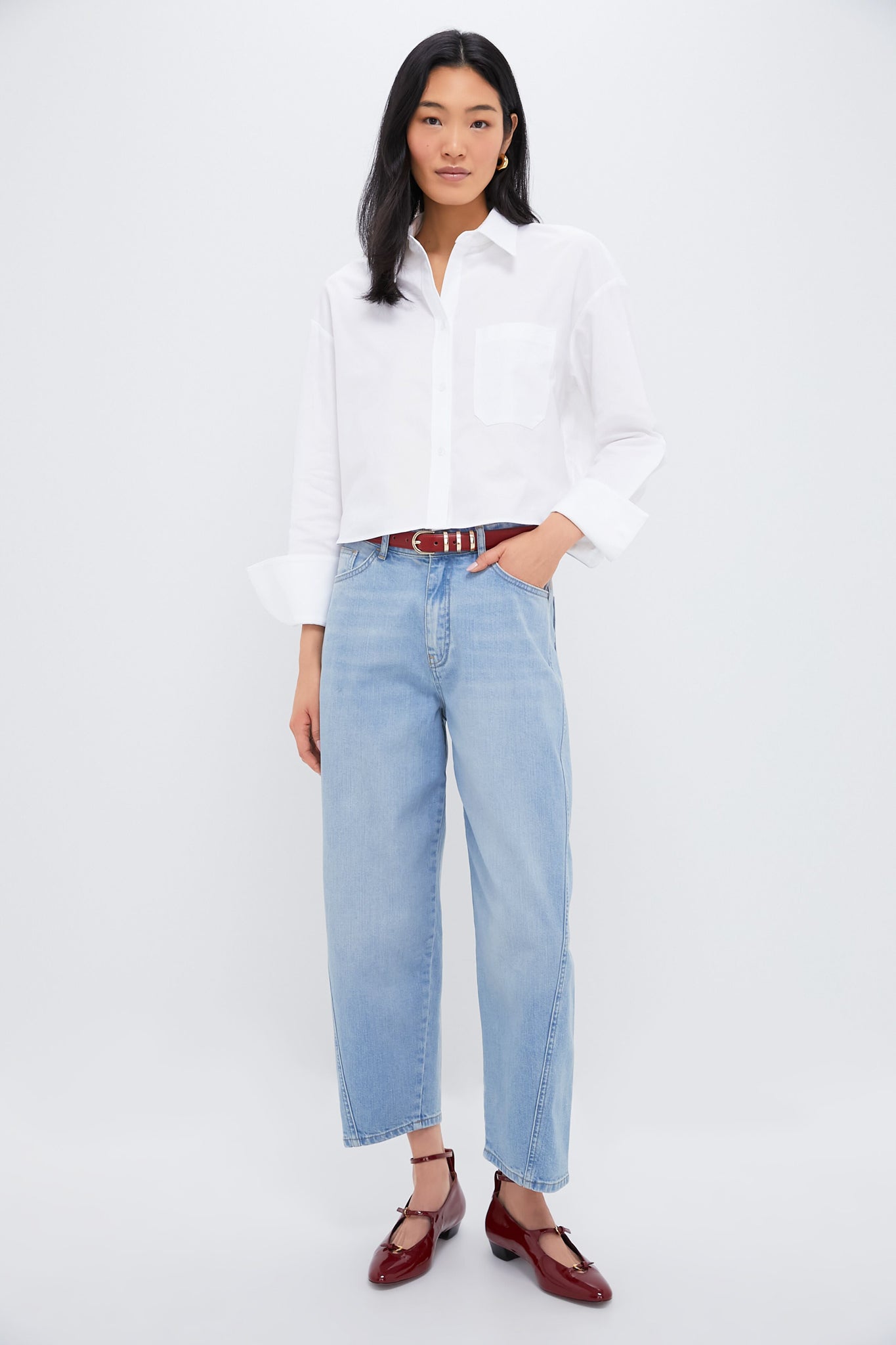 The Caleb Jeans feature a round, barrel leg silhouette, and cropped ankle length. Perfect for cool, casual looks, these versatile jeans can be dressed up or down! We styled them with a crisp white button down shirt, red belt, and flats for a chic, yet elevated daily look!