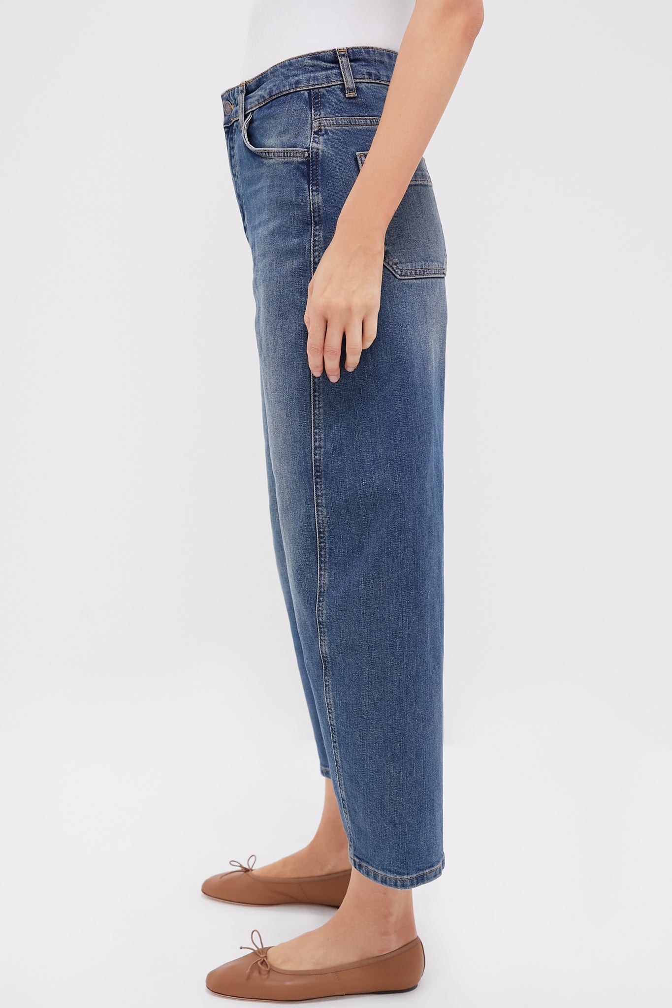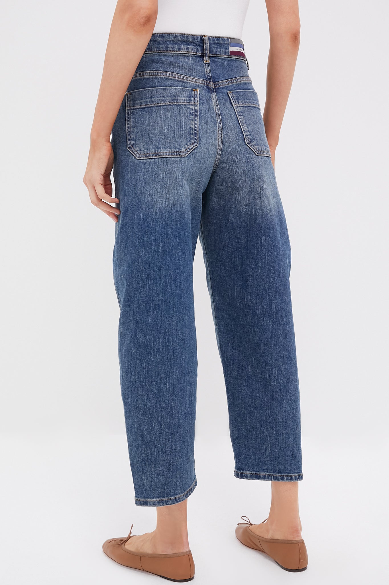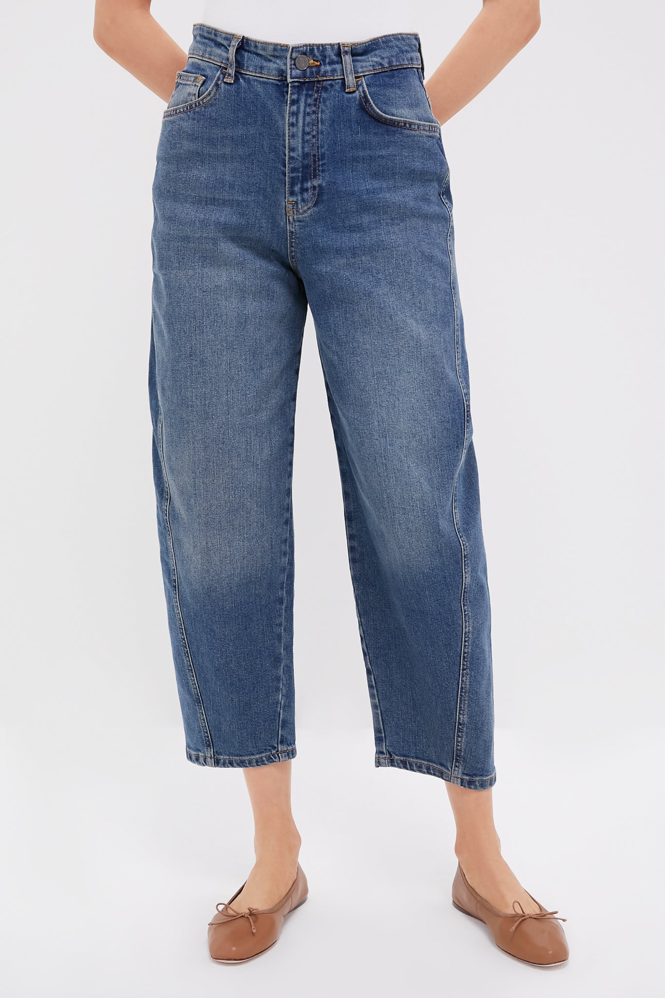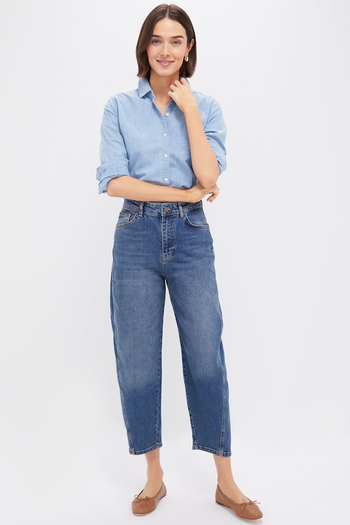 The Caleb Jeans feature a round, barrel leg silhouette, and cropped ankle length. Perfect for cool, casual looks, these versatile jeans can be dressed up or down! We styled them with a crisp button down, flats, and a tote for an elevated daily look!