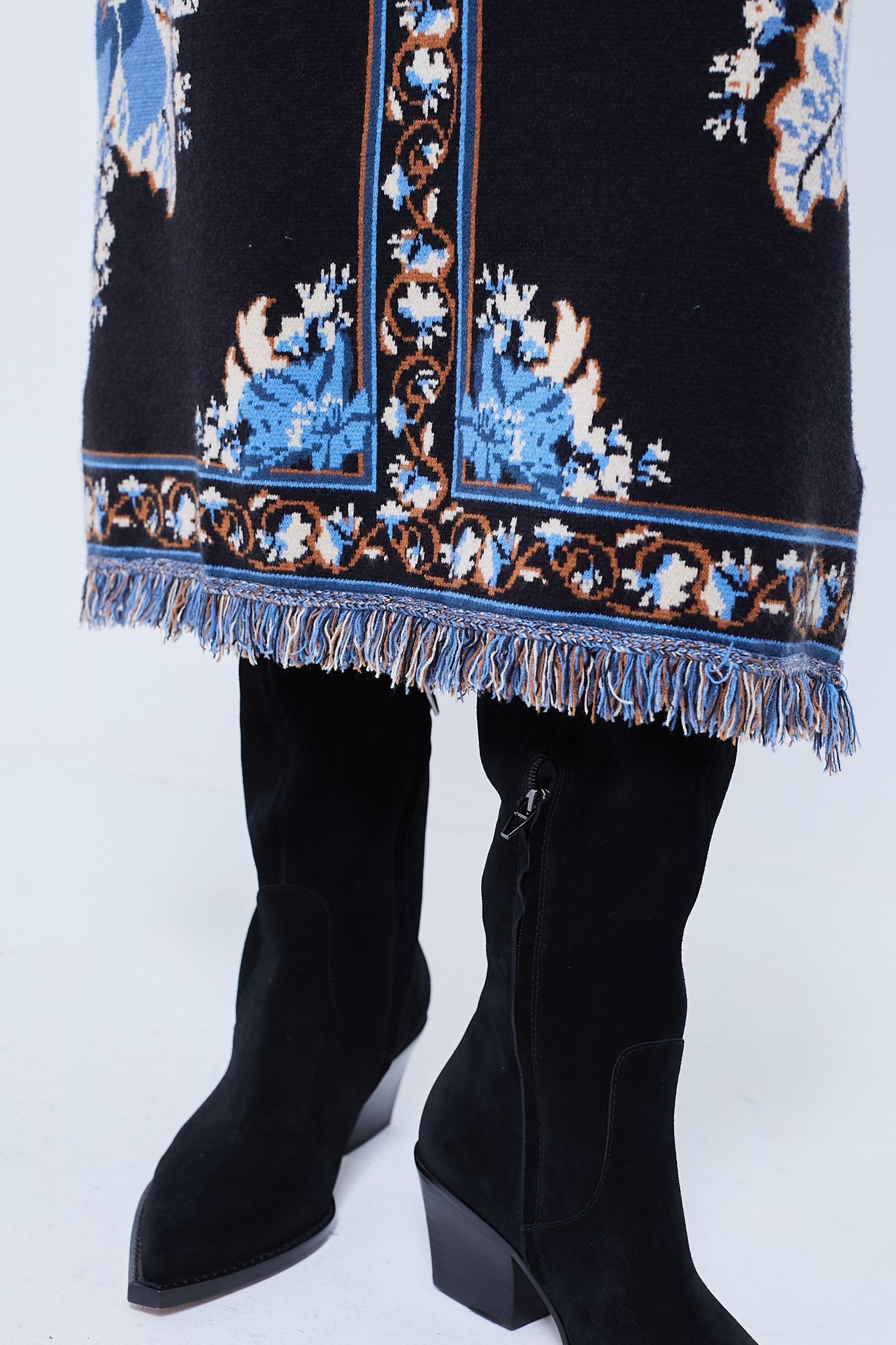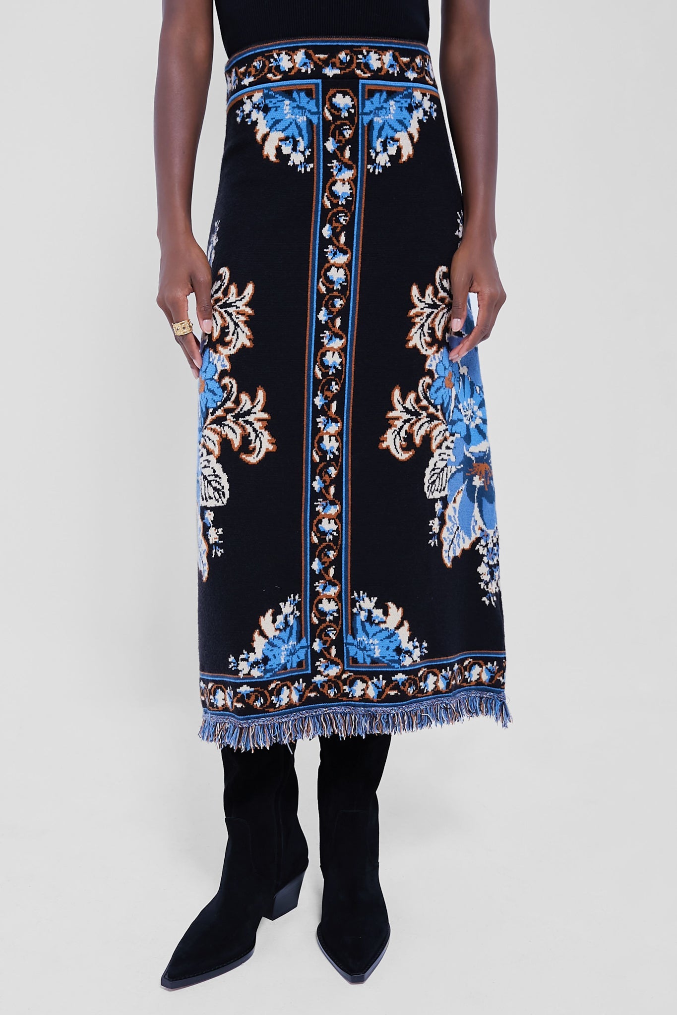 This skirt paints a striking image with its rich black backdrop adorned by vibrant azure and amber blossoms. Its body-hugging silhouette gently flares towards the hem, offering a graceful sway with every step. Perfect for transitioning from daydreams to evening elegance, it’s a piece that speaks to the soul of the whimsical at heart. Pair with the matching Blossom Tapestry Knit Wrap Blouse and heels for a chic set.