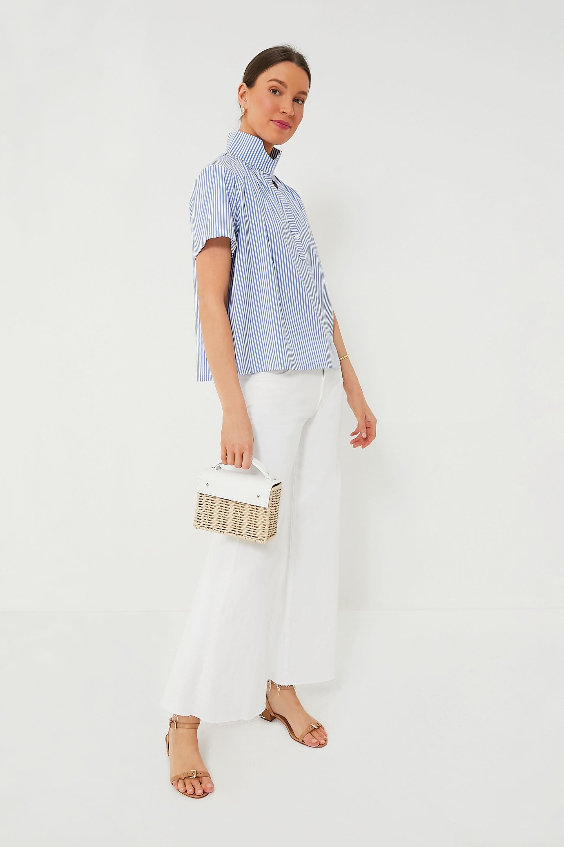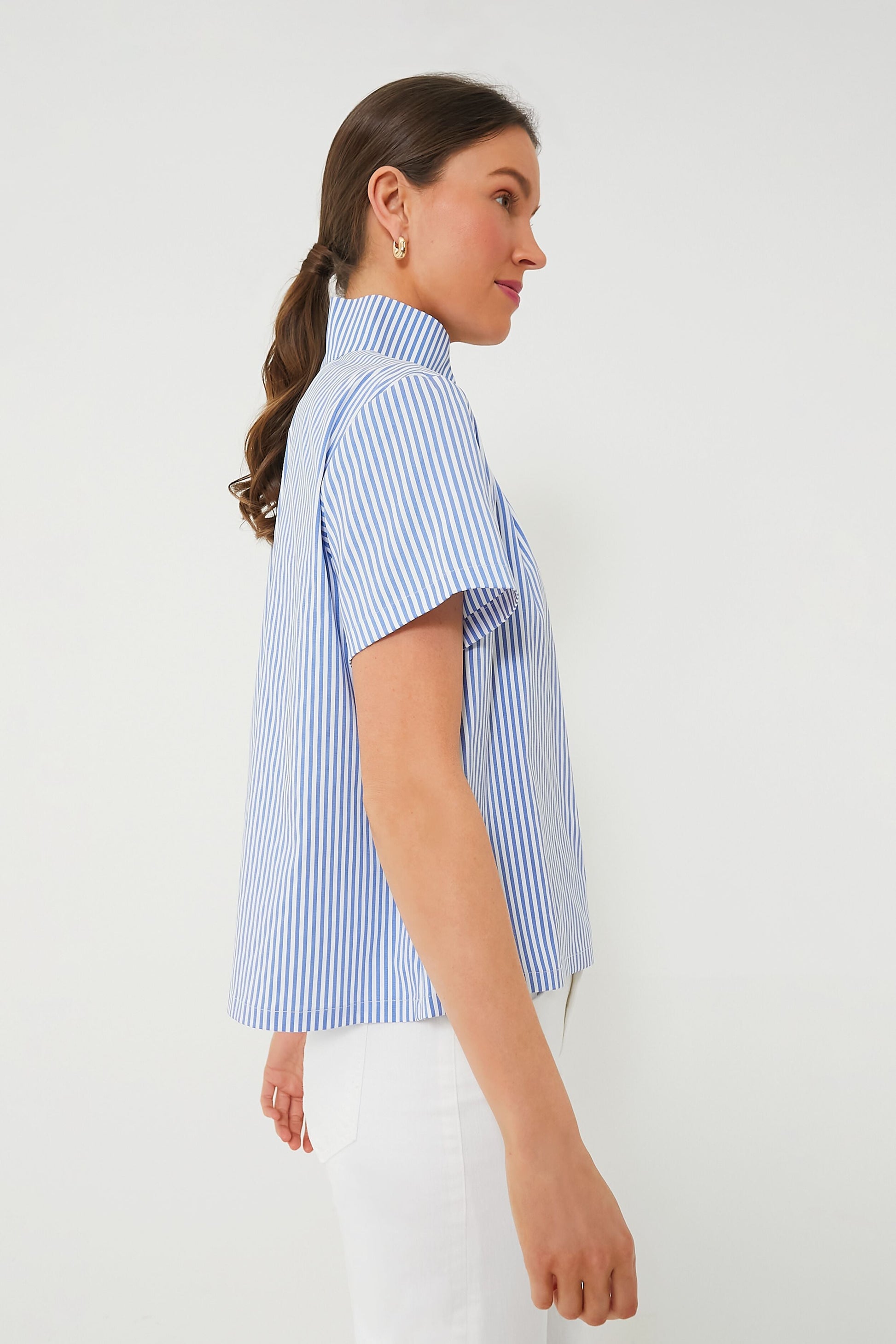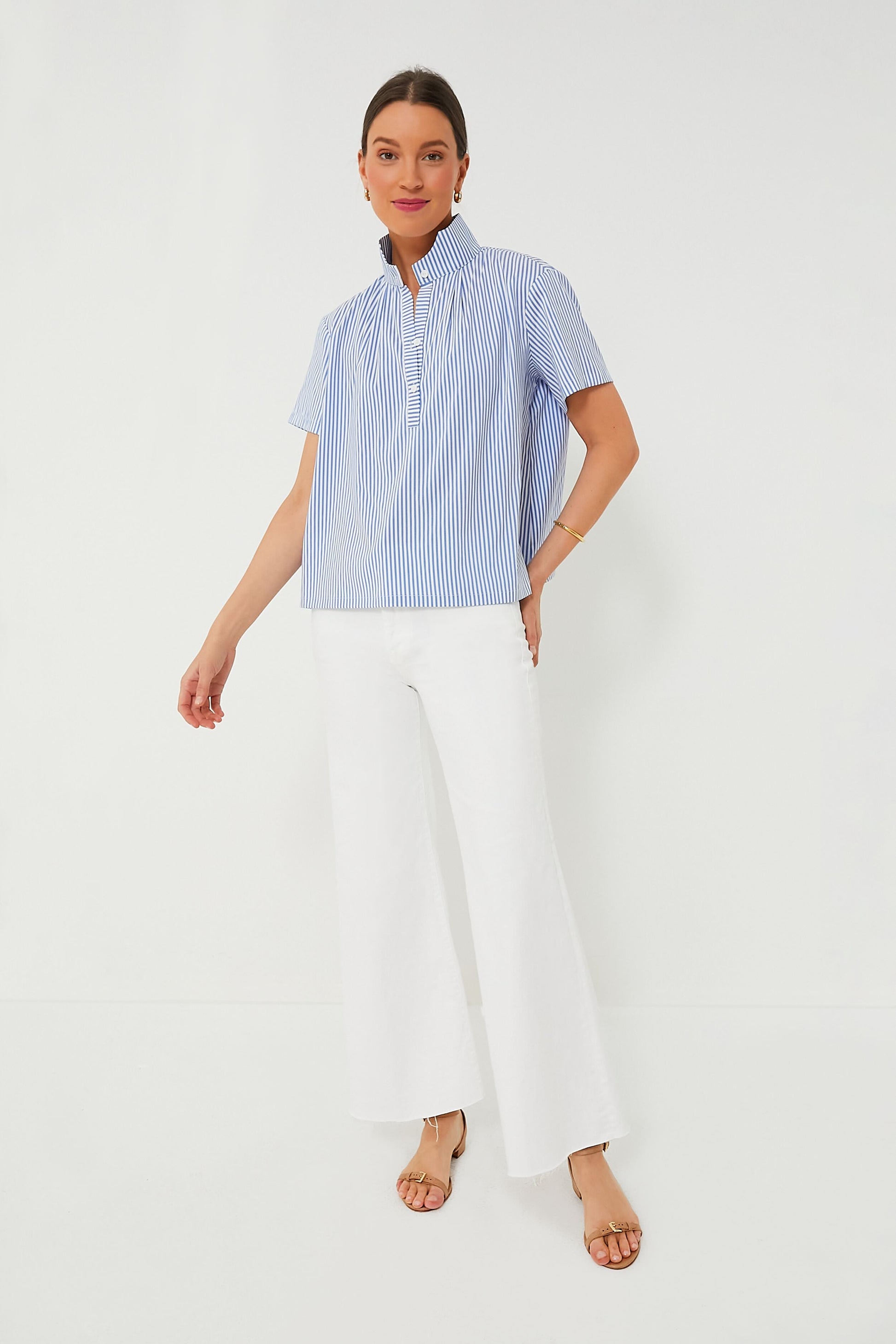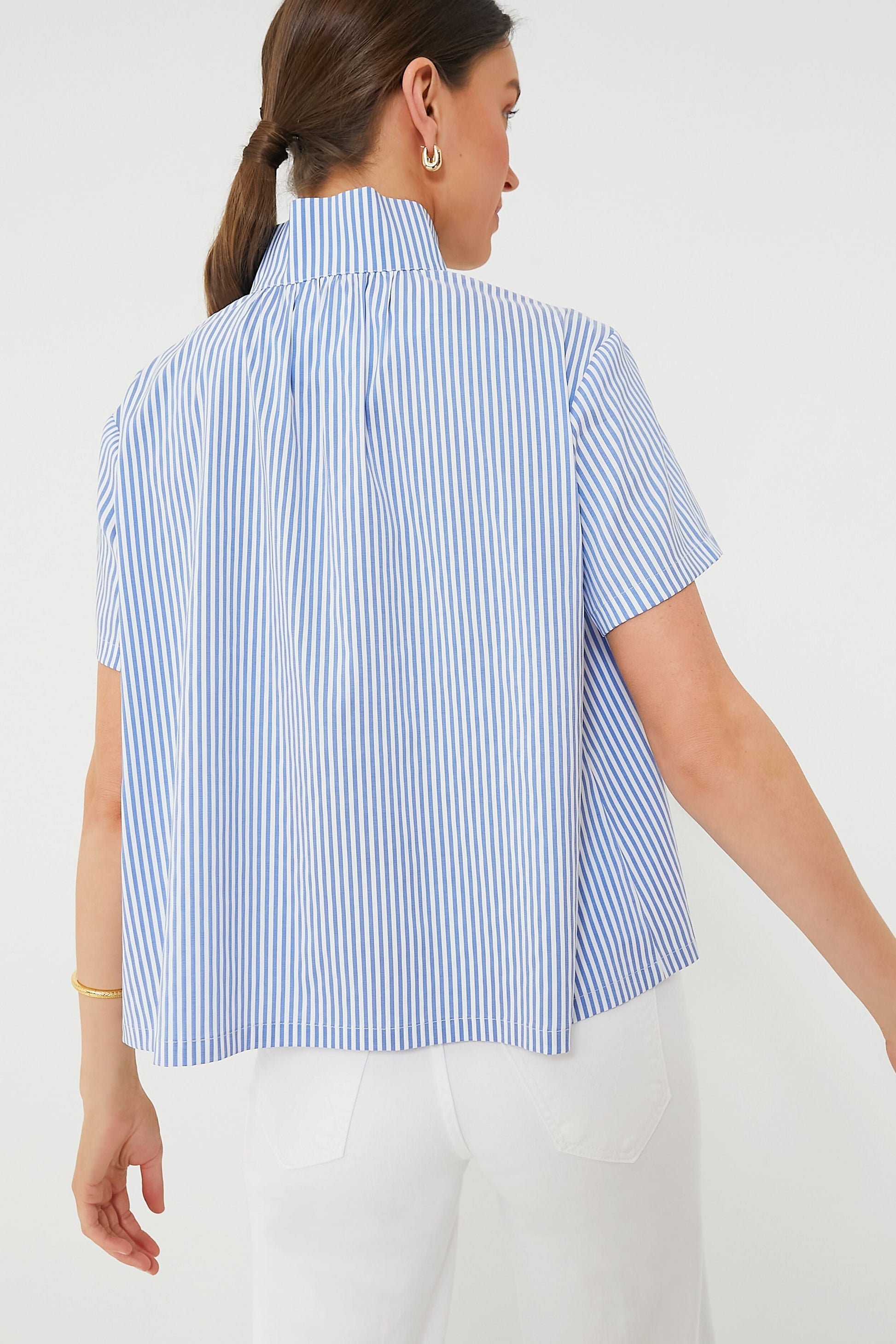 The Blue and White Stripe Finn Popover is a sophisticated, easy, and flattering style all wrapped into one. Featuring a stand collar, partial front button closure, and pleating along the shoulders, this classic silhouette can be worn over and over again. Pair with ballet flats for the office, or with denim and sneakers for a casual day out and about.