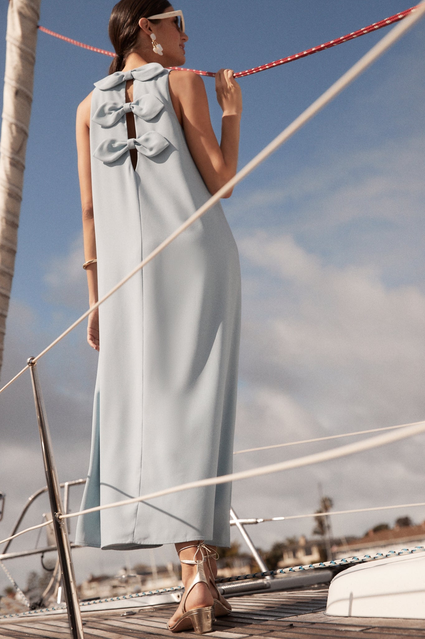 The Blue Fog Portia Dress is truly one of a kind. There are so many gorgeous details here that we don't know where to start! Our favorite might be the exaggerated yet elegant bow details on the back that adds a dramatic twist. With a flattering A-line silhouette that can work for every occasion and every body type, we love styling this maxi with heels and clutch for warm weather weddings and elevated events alike.