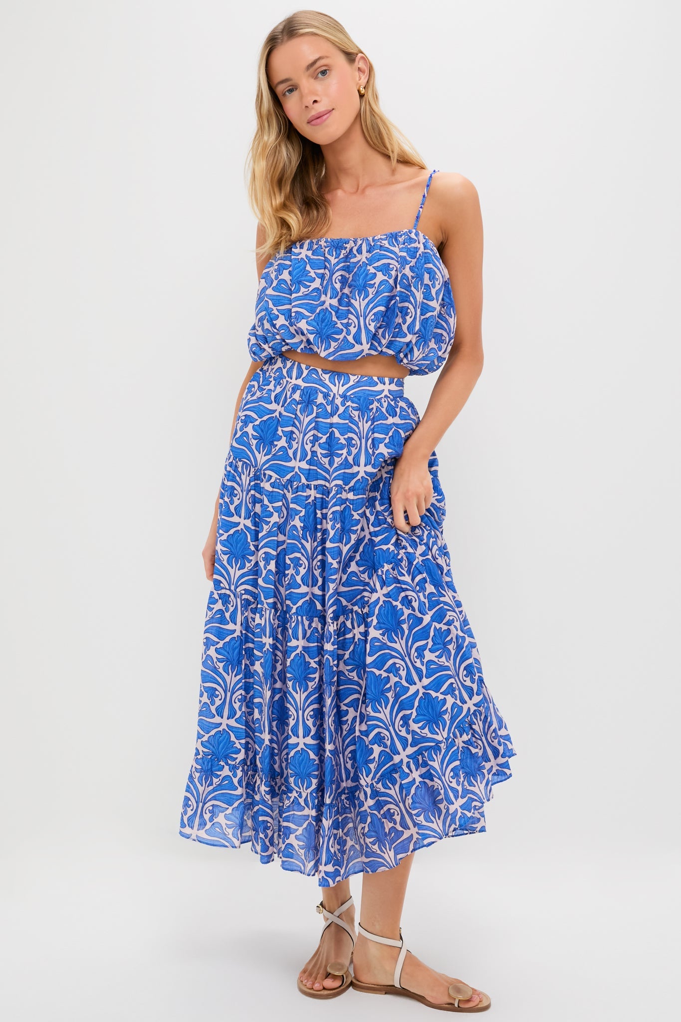 The Blue Geometric Floral Porto Midi Skirt is a warm-weather must-have. With a length that hits at just the right spot, an elastic waistband, and a flowy silhouette that moves with every step, it is dripping with details we love. Pair with an easy tank or with the matching Blue Geometric Floral Azores Bubble Blouse for a cute, coordinated set!