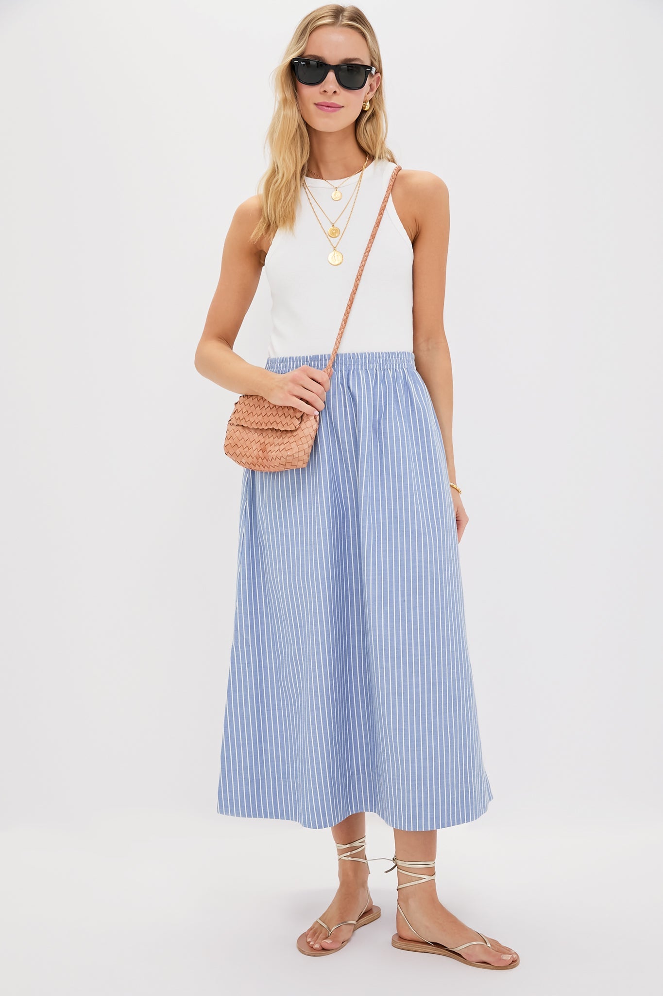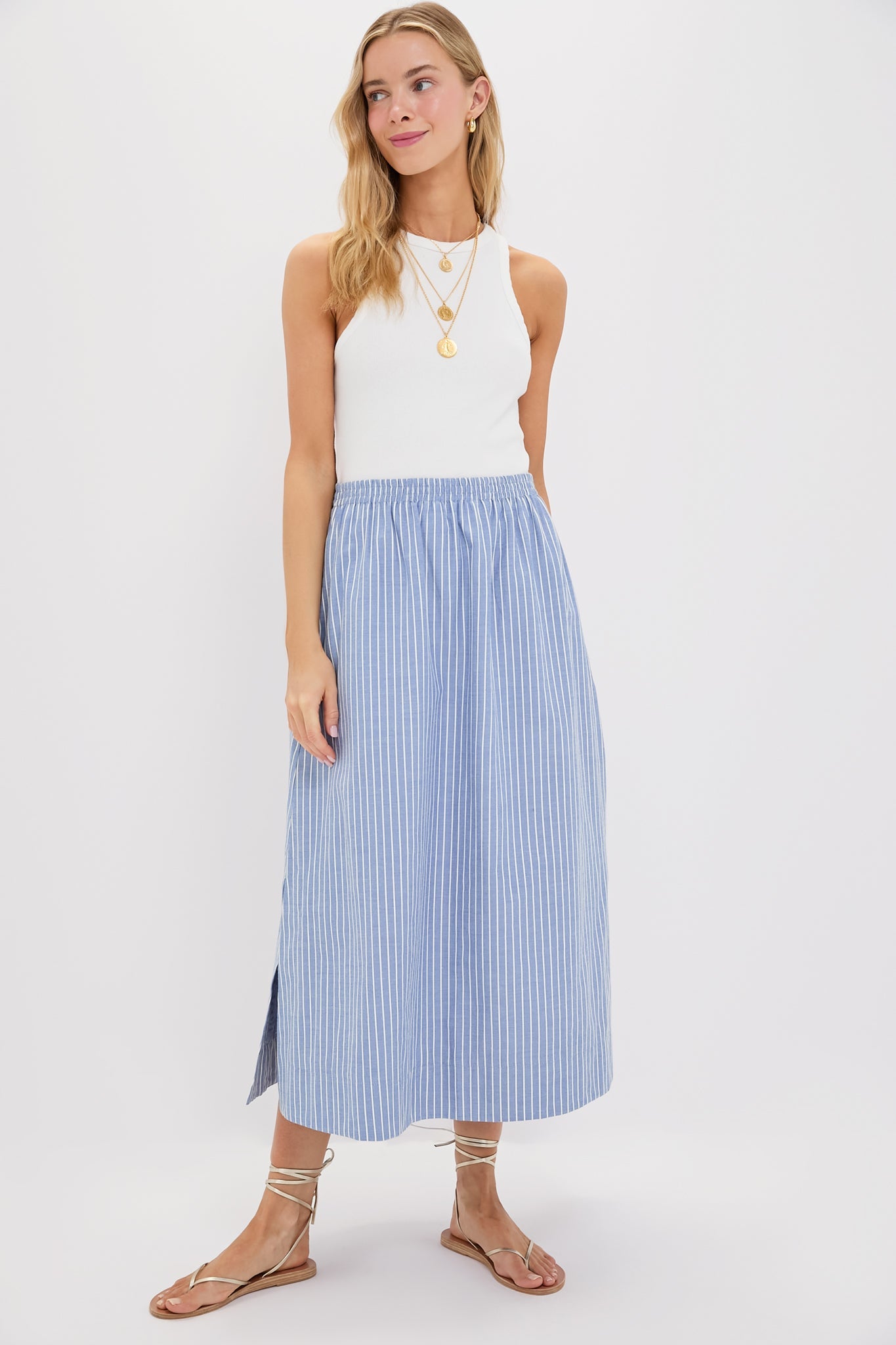 Easy, breezy, and endlessly versatile—the Blue Stripe Athena Skirt is a wardrobe essential. Featuring a lightweight, A-line silhouette with subtle side slits and classic pinstripes, it’s perfect for everything from casual days to seaside strolls. Pair with a fitted tank or blouse and sandals, sneakers, or flats!