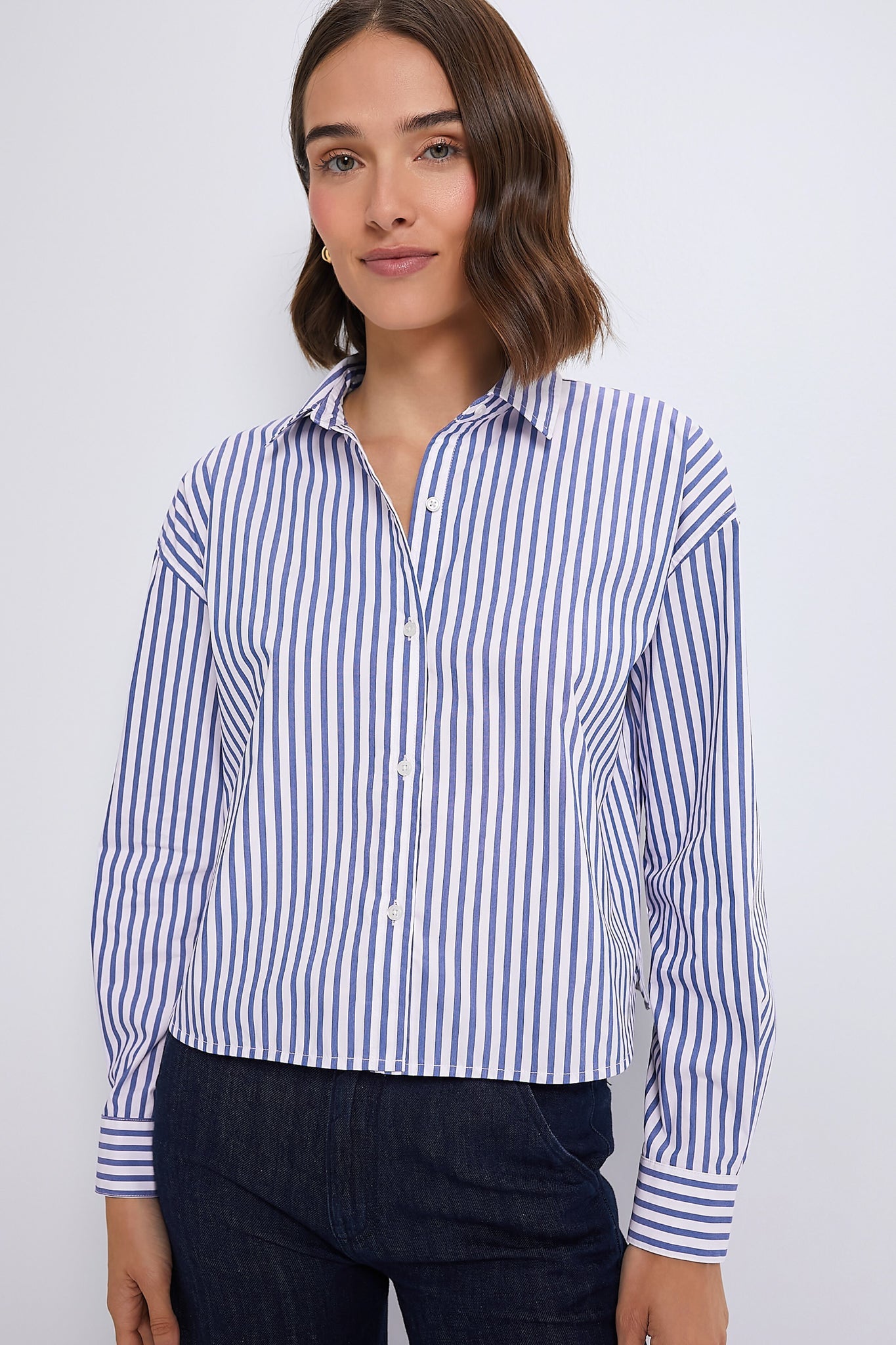 A classic shirt goes for miles in your wardrobe and this Blue Stripe Jasper Button Down is no exception. Polished details like double fused collar, scalloped side slit, center back box pleat, and long sleeves with cuff and placket for easy roll up, this cropped silhouette is a styling winner! For business or pleasure, wear it tucked or loose, this effortlessly polished piece is great for year round wear thanks to its versatile styling options.