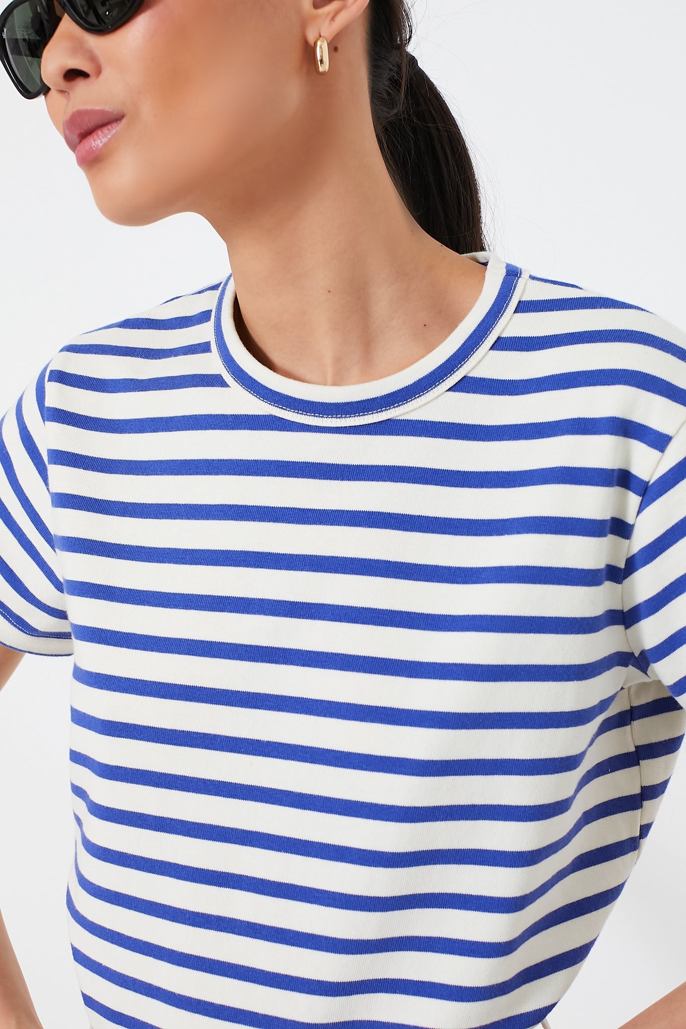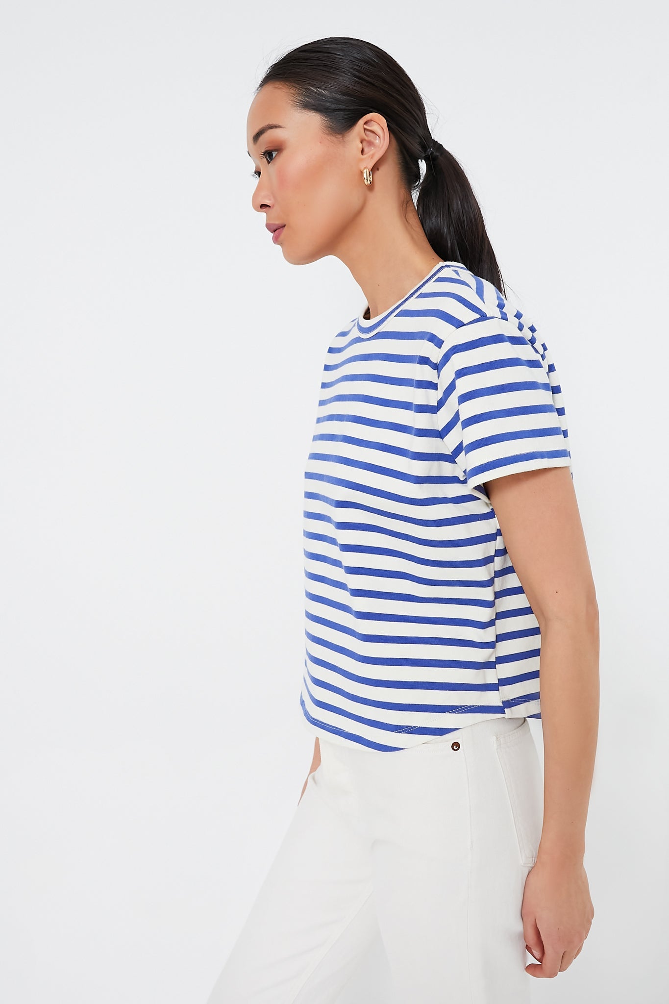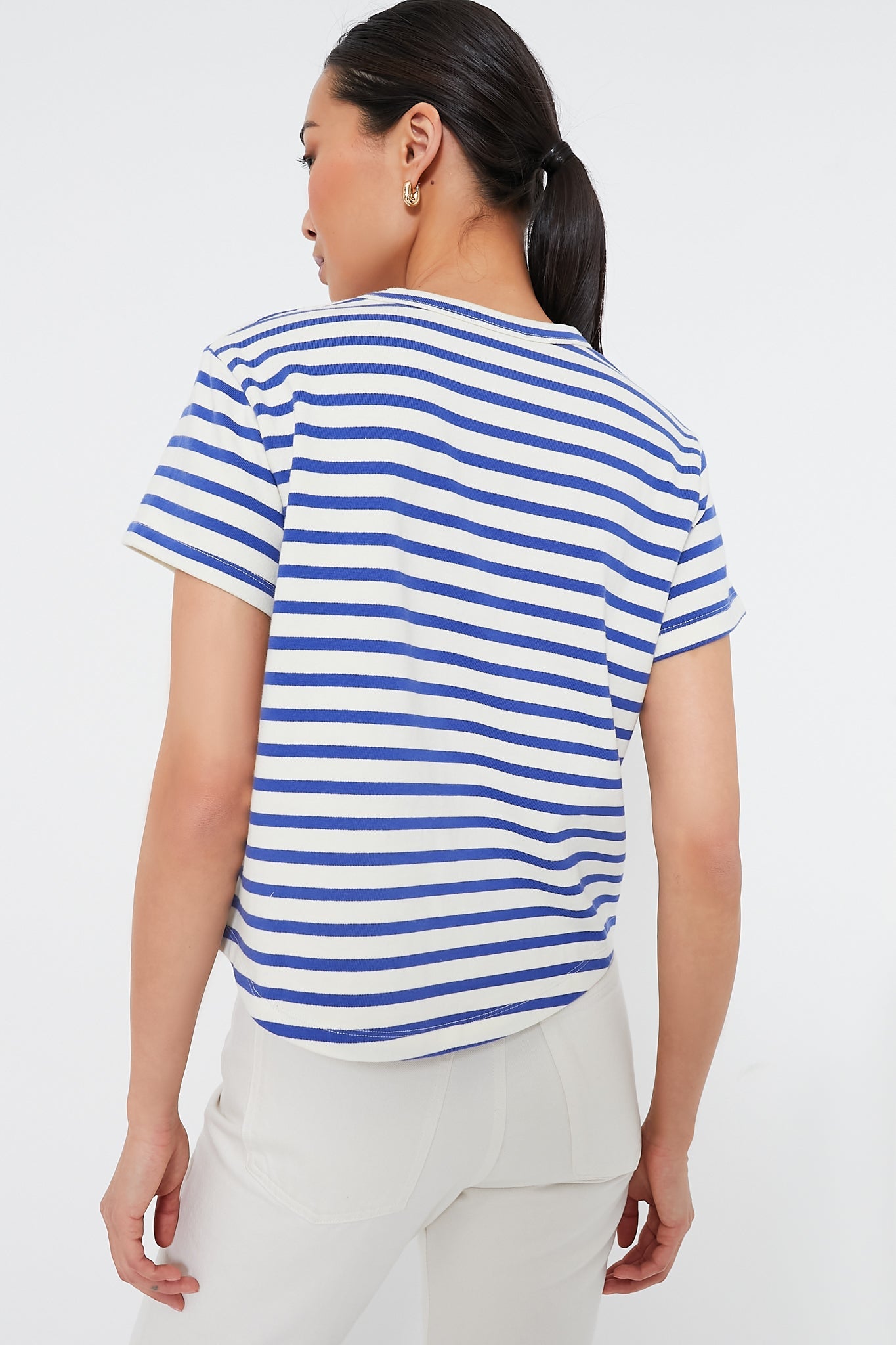 Perfect for casual-wear with an elevated feel, the Blue Stripe Devon Tee is sure to move to the top of your t-shirt pile. Thanks to small details that go a long way like the medium-weight cotton knit fabric, a banded neckline, and a slightly cropped rounded hemline, this silhouette is a necessity in any closet. Style it with white jeans and sneakers, with denim shorts and sandals, with a sweater thrown over your shoulders; it's sure to look cute no matter what!