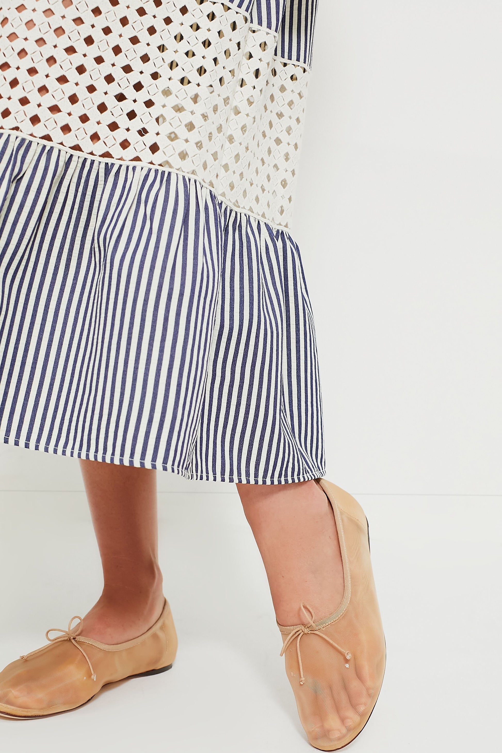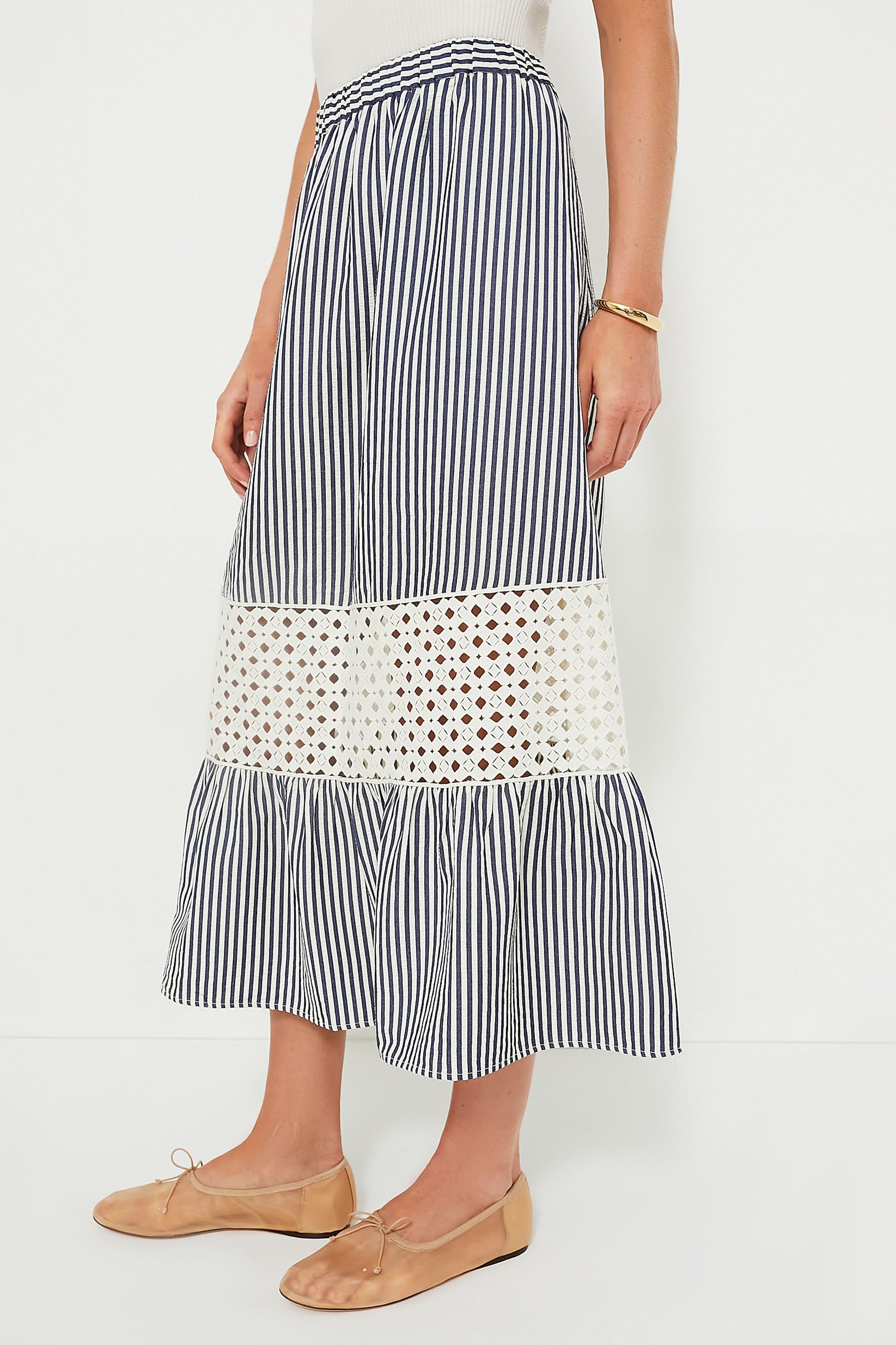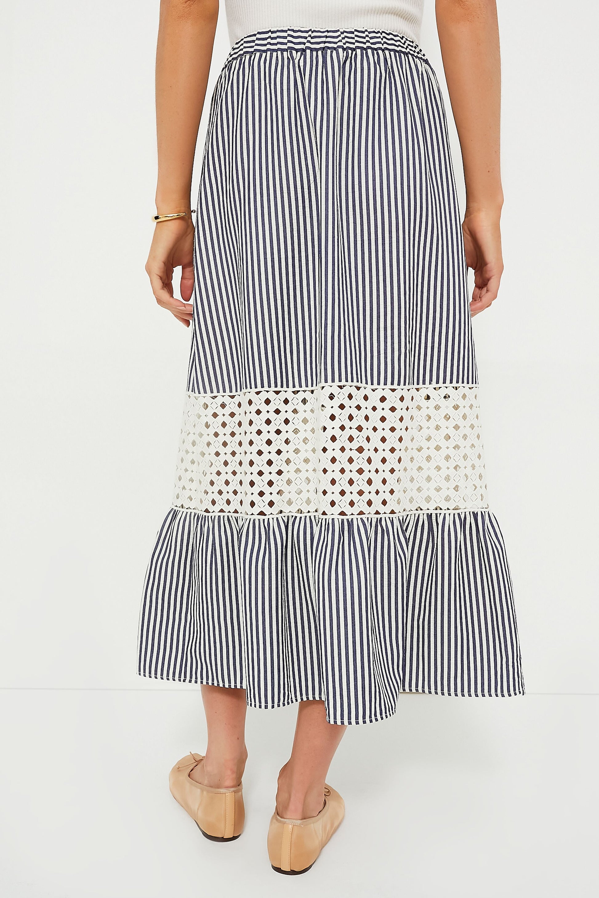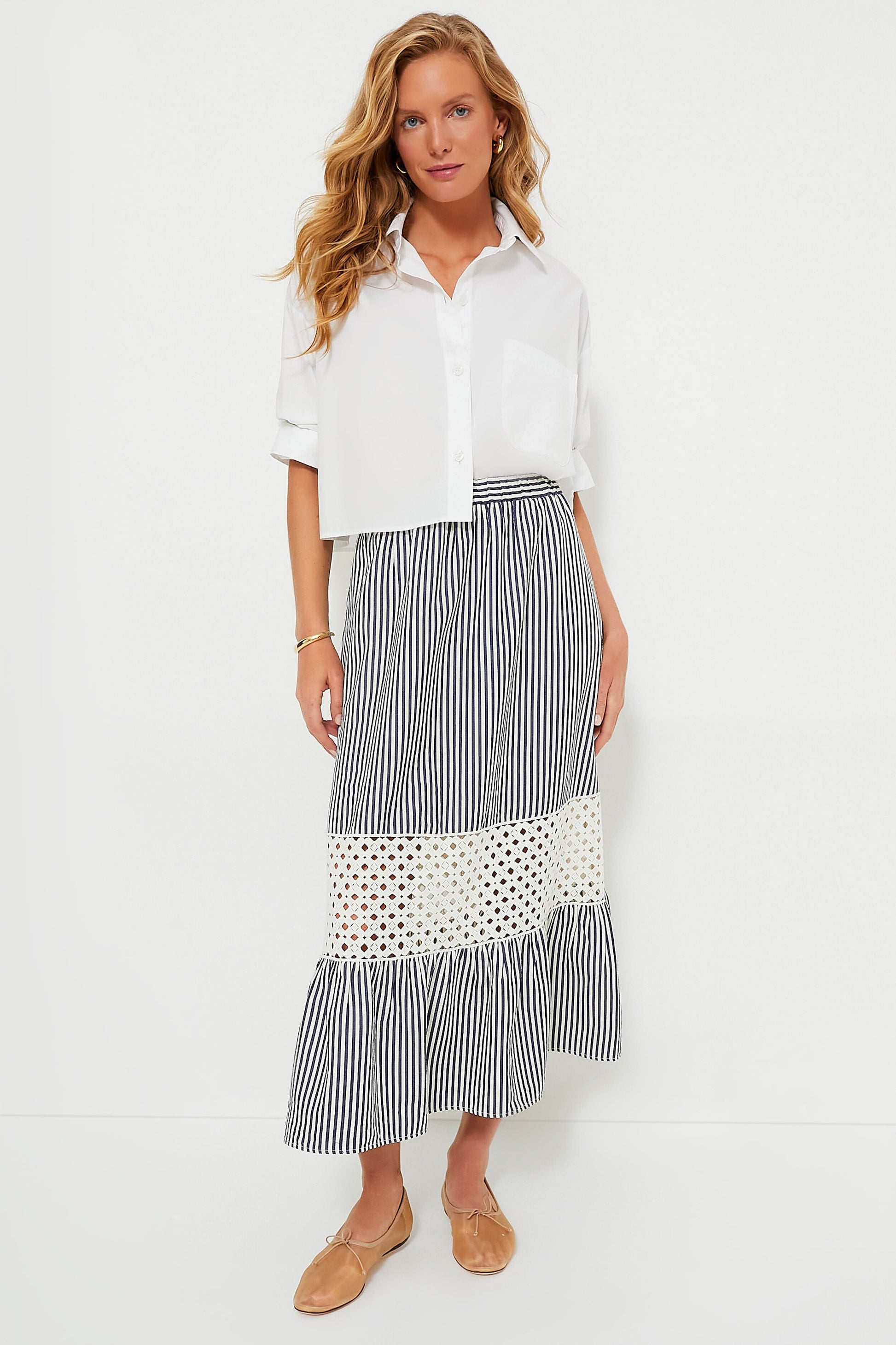 The Blue Stripe Eyelet Hana Skirt is the perfect transitional piece for your wardrobe. With an easy elastic waistband, A-line silhouette, flattering vertical blue and white stripe, and eyelet detailing, this light weight piece can be dressed up or down. We paired it with a crisp white button down, mesh ballet flats, and a tote for an effortless and chic springtime look!