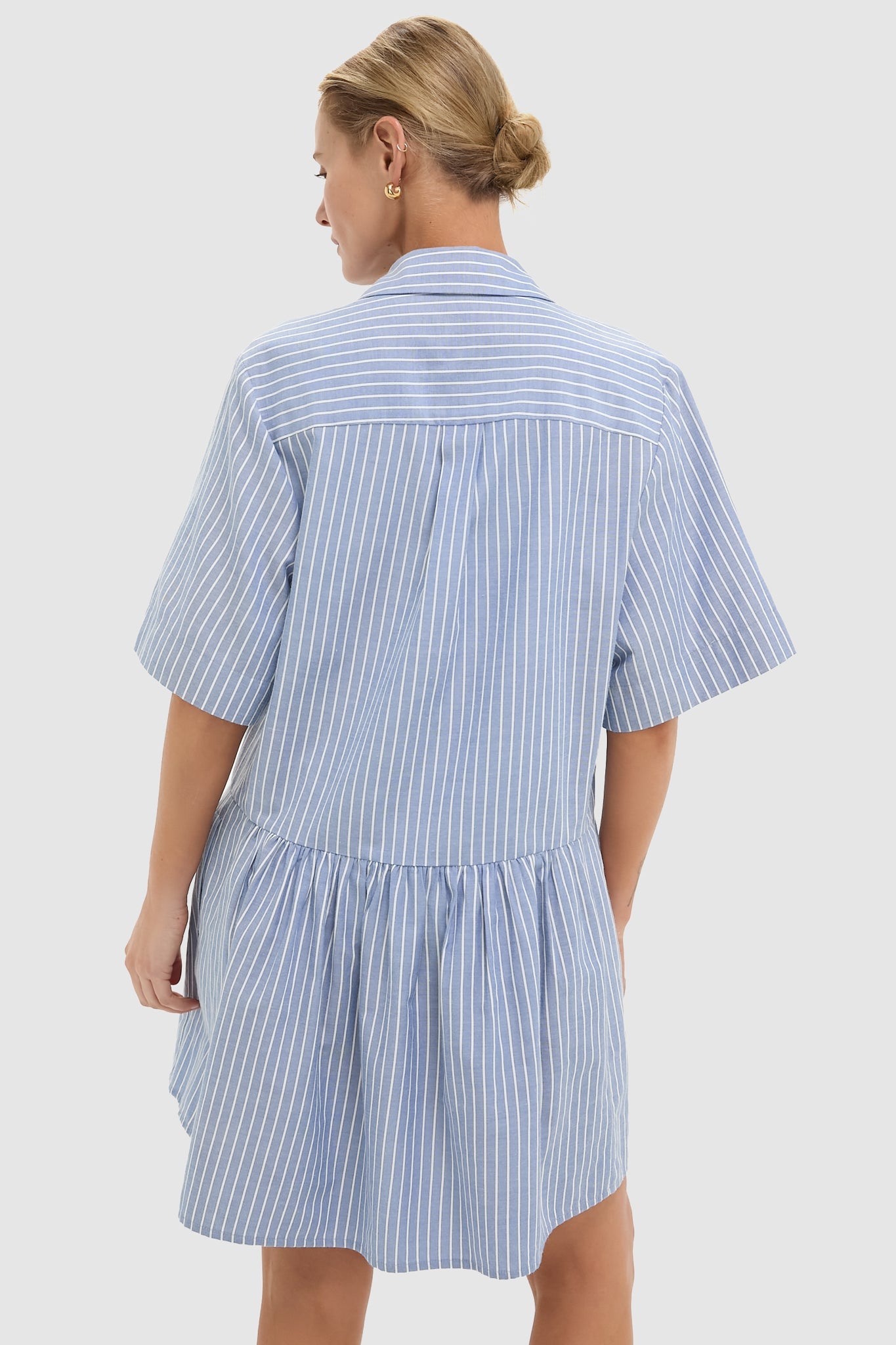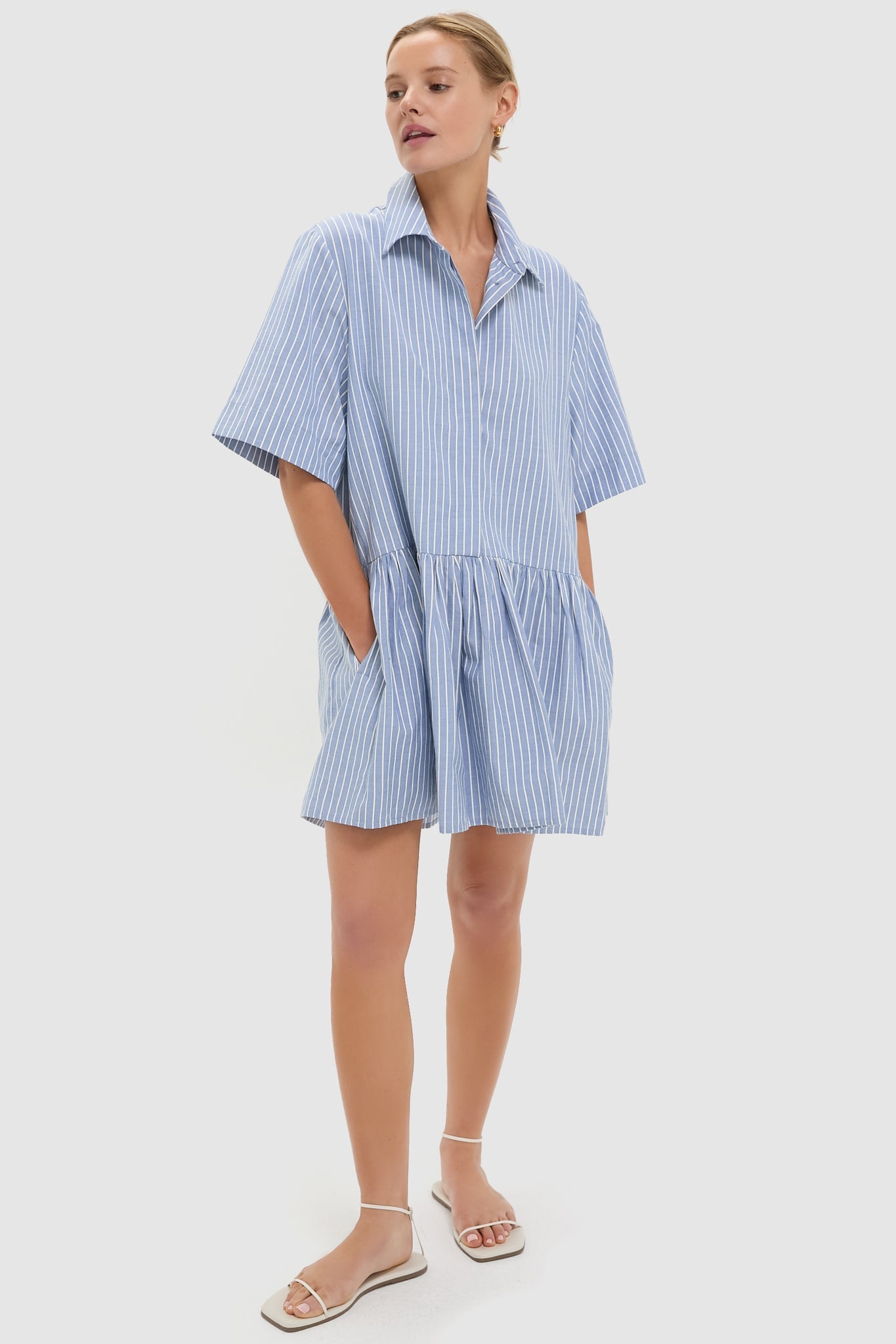 The Blue Stripe Piper Shirt Dress is a cool-girl take on a classic style. With wide half-length sleeves, a gathered skirt, and a relaxed A-line silhouette, this breezy mini is perfect for pairing with everything from sneakers, to sandals, to flats!