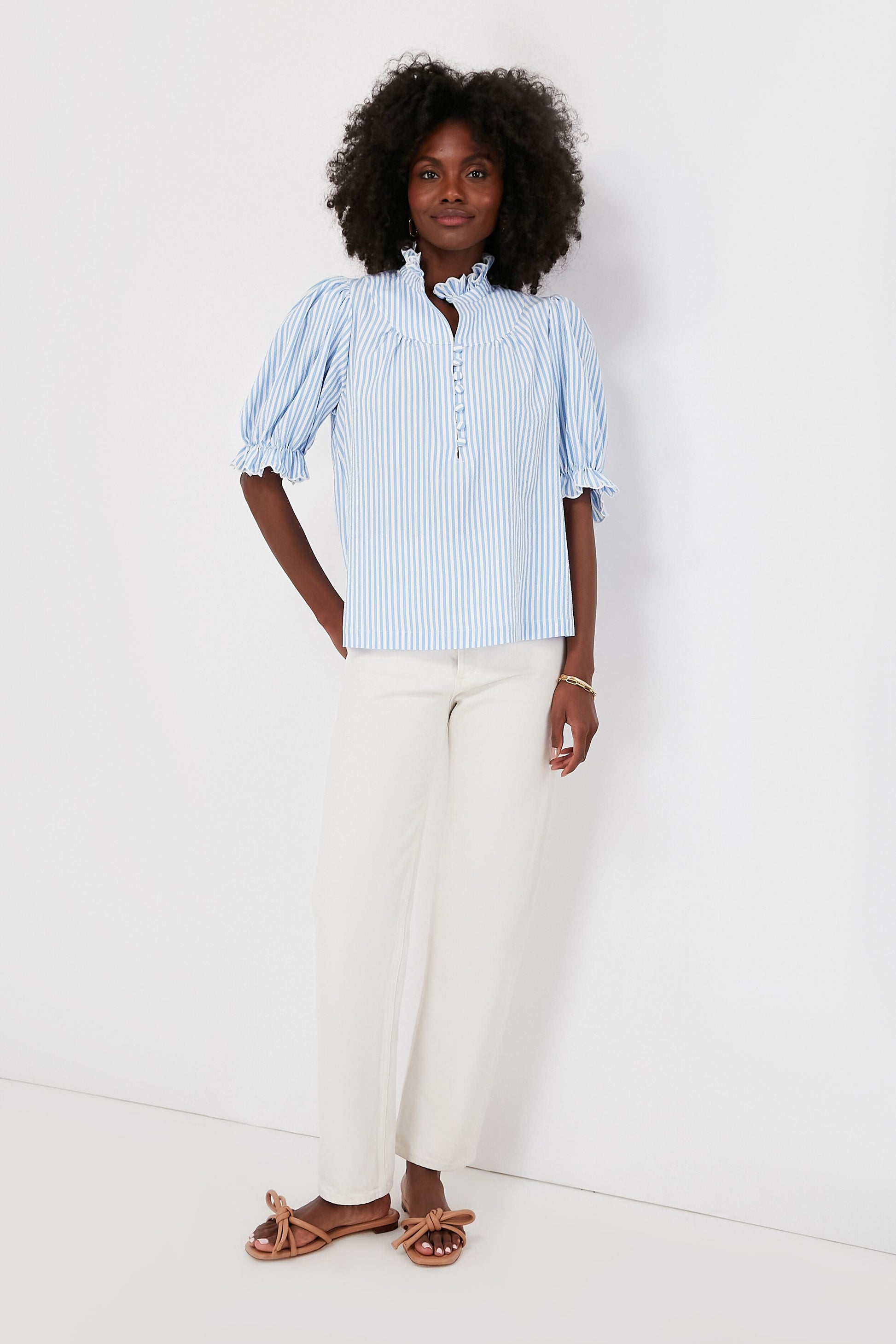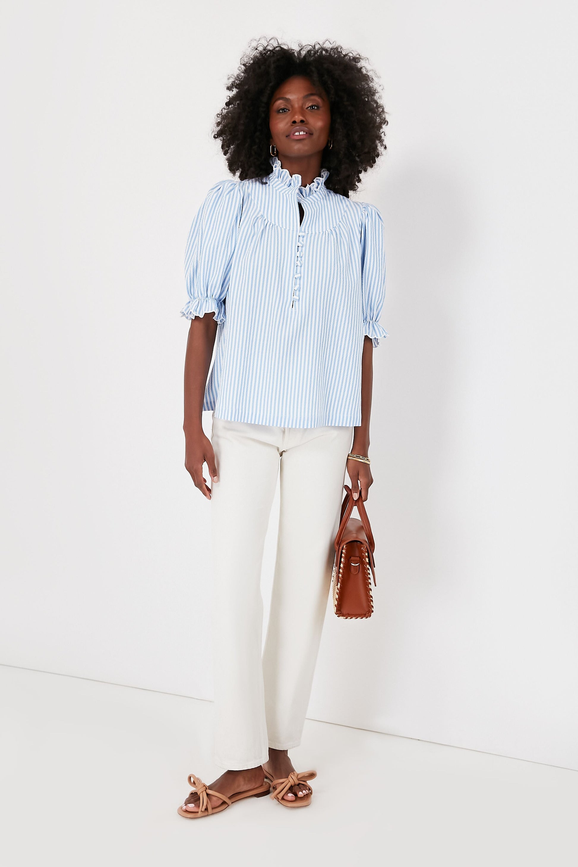Your favorite top gets a flirty update - meet the Selena Blouse. Effortlessly chic, we love the romantic details of this fun and feminine number. Featuring classic stripes, a ruffle stand collar, and quarter length front placket with covered buttons, this puff sleeve piece pairs well with light denim and sandals for daytime and can be elevated with trousers and gold jewelry for dining out.