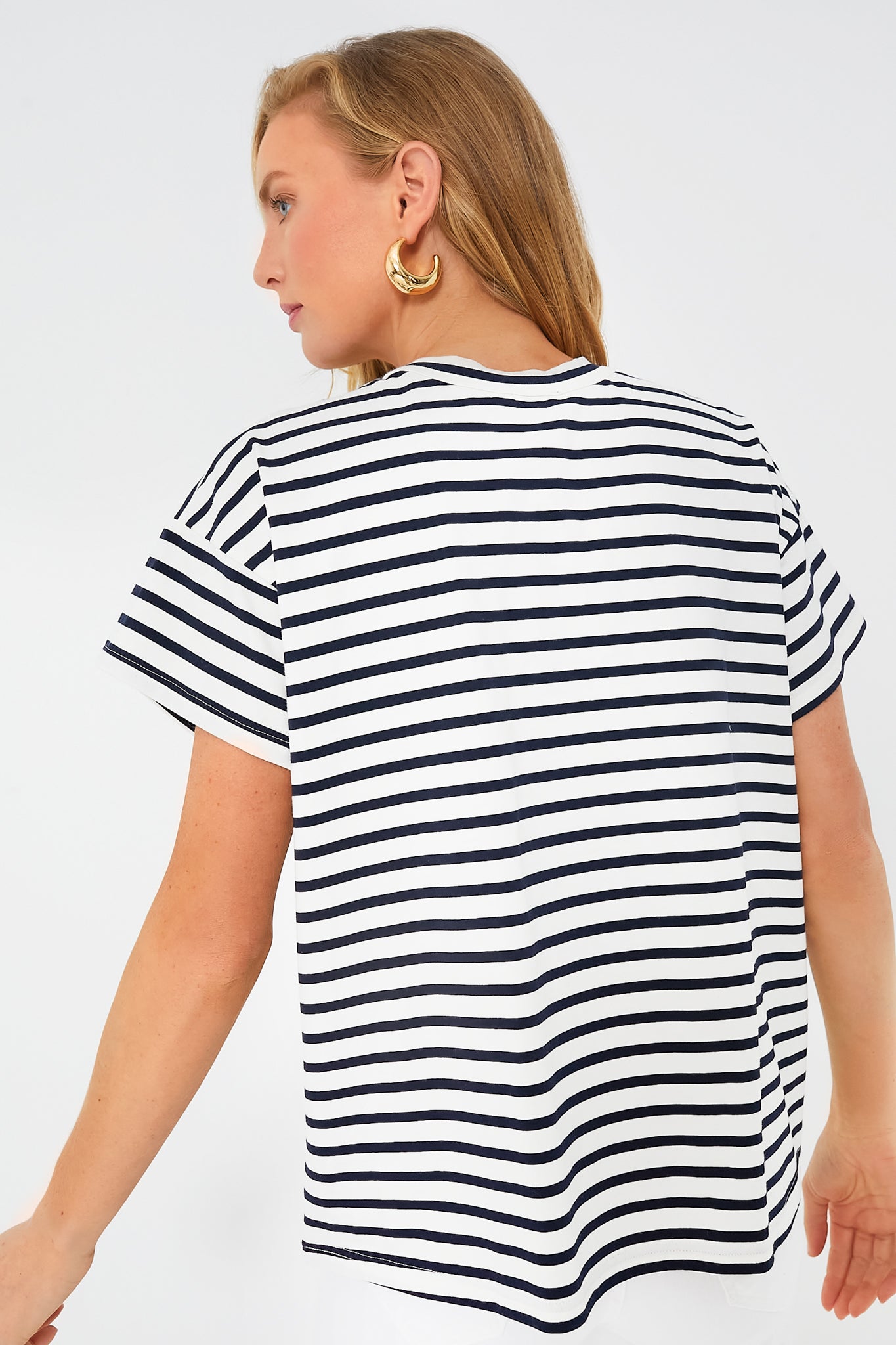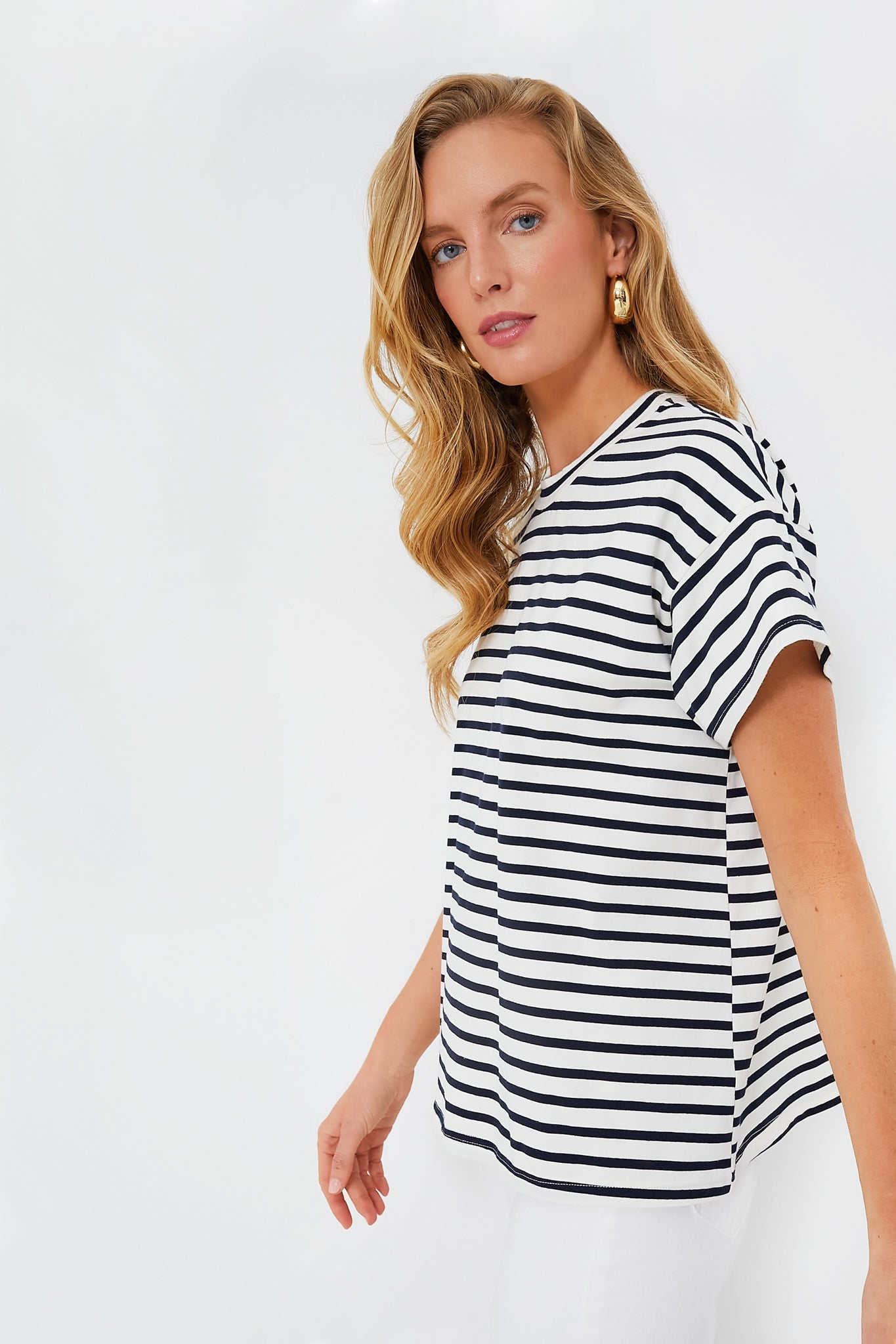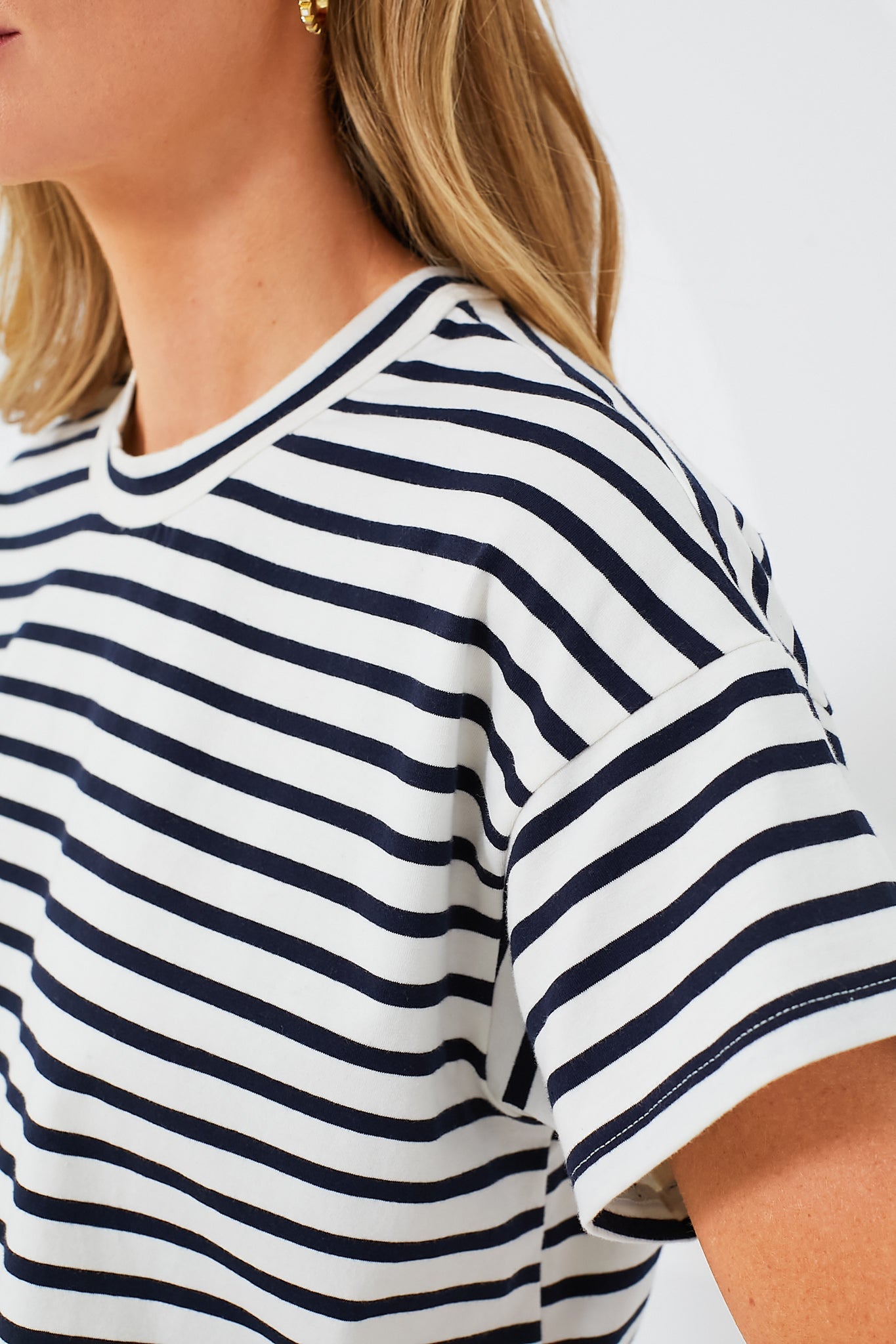 An easy everyday staple, the Blue Striped Presley Tee is the type of top you can't keep wearing. Featuring short sleeves with a slightly dropped shoulder, a contrast crewneck, and classic striped pattern, this top is casual yet put-together. Pair with denim in all lengths and washes.