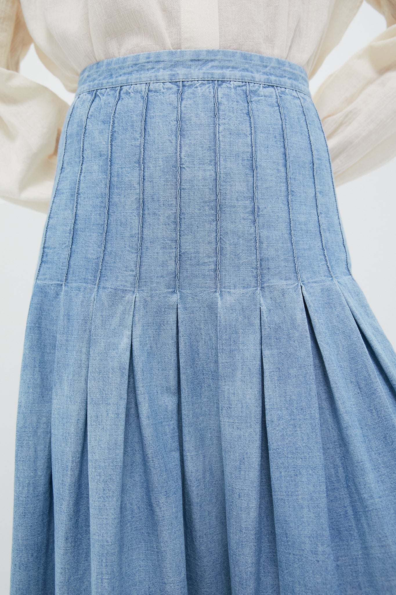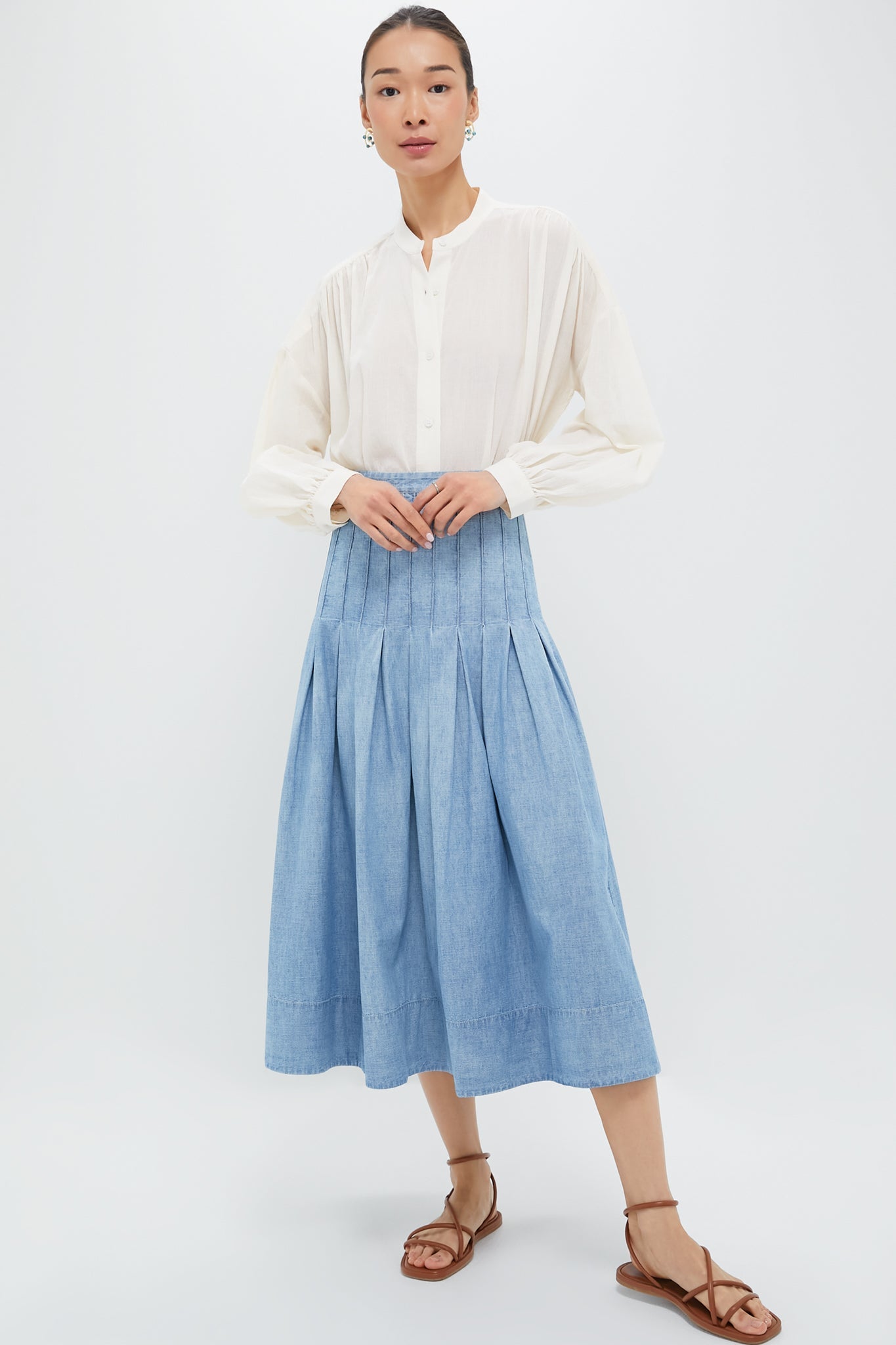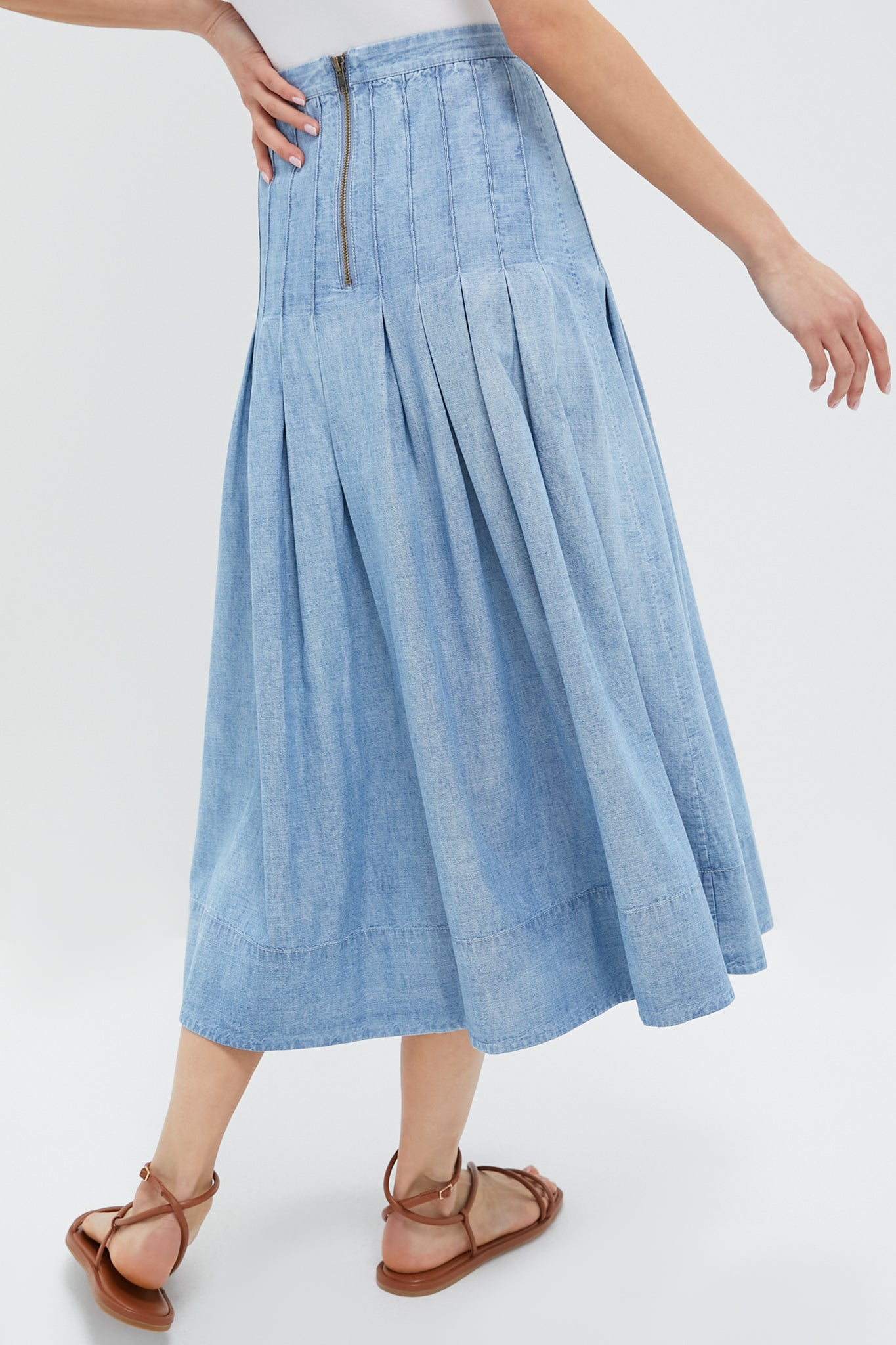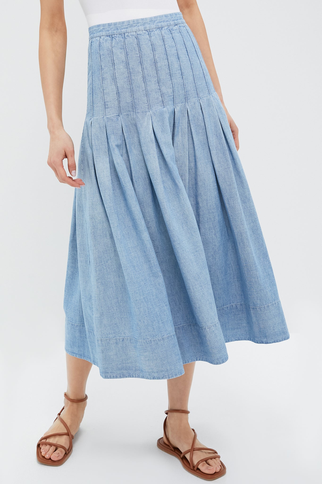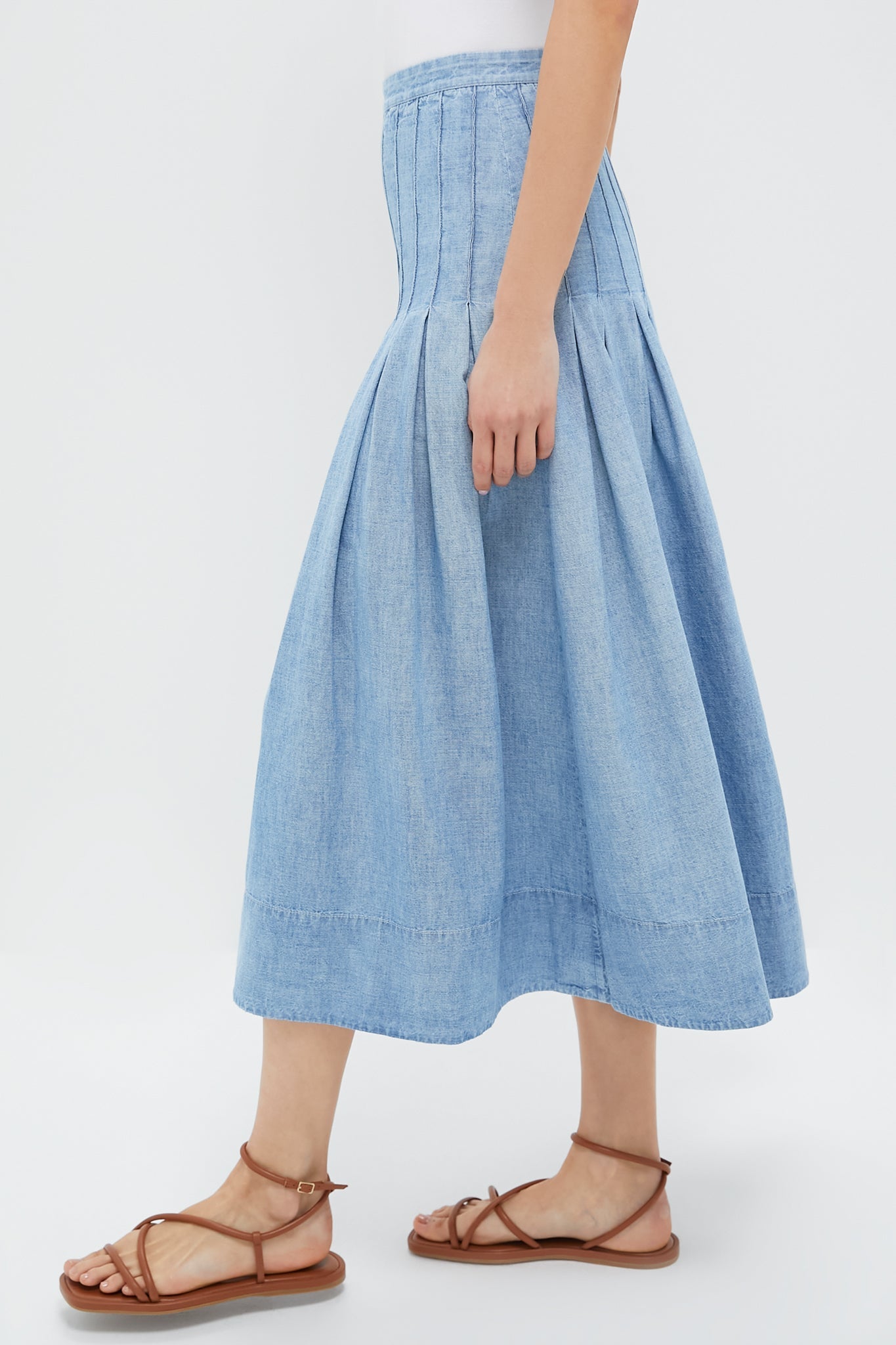 The Rhythm Skirt in Boiler Wash is cut from cotton chambray shirting and feels casual with a touch of drama. The midi silhouette features pleated pintucked details and a slim fit through the hips into a full swingy shape. Pair with sweaters, tanks, or blouses for an elevated everyday look.
