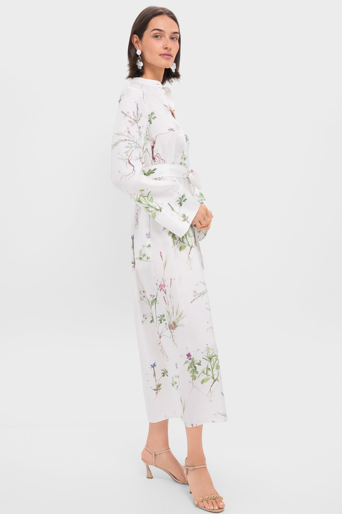 Botanical Garden White Long Sleeve Tie Waist Midi Dress
