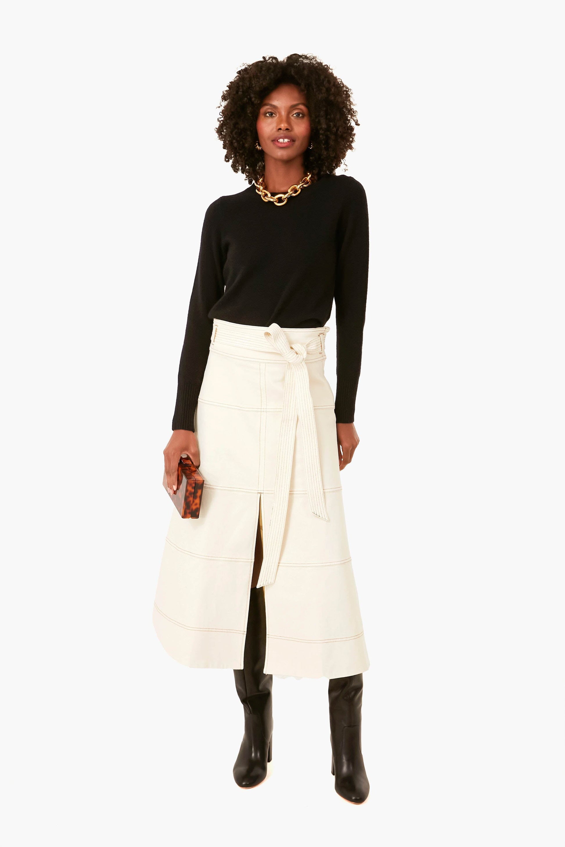 The Chalk Hudson Skirt is cut from a denim fabric in a rich, creamy neutral hue. Perfect to add to your wardrobe for a fall refresh, this high-waisted A-line silhouette features a self-tie belt and contrasting seam details. Style this chic piece with a chunky knit to wander around a new city, and add leather boots and gold jewelry to take your look from day to night.