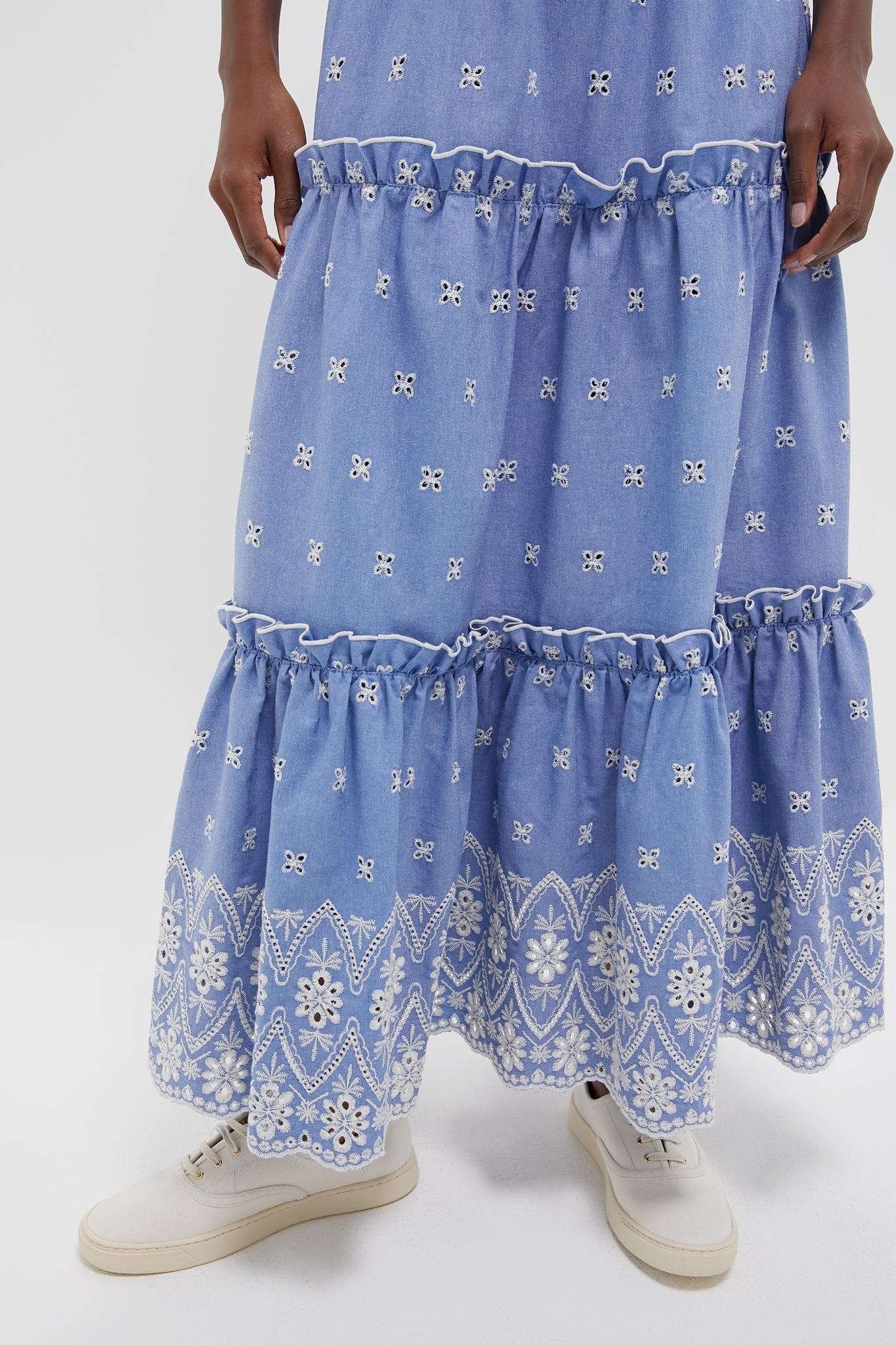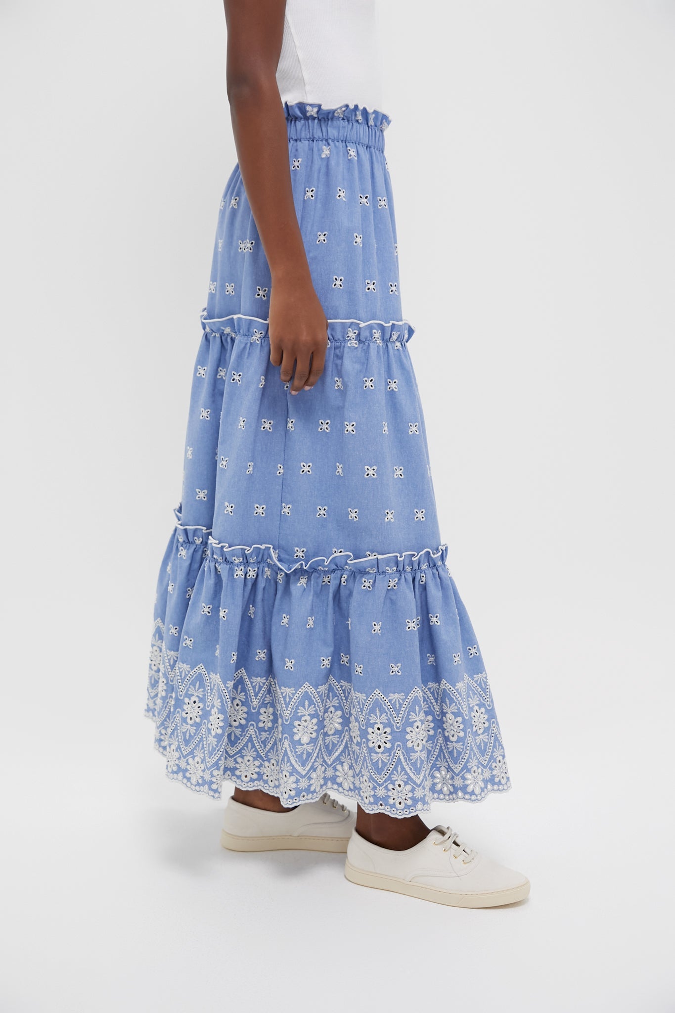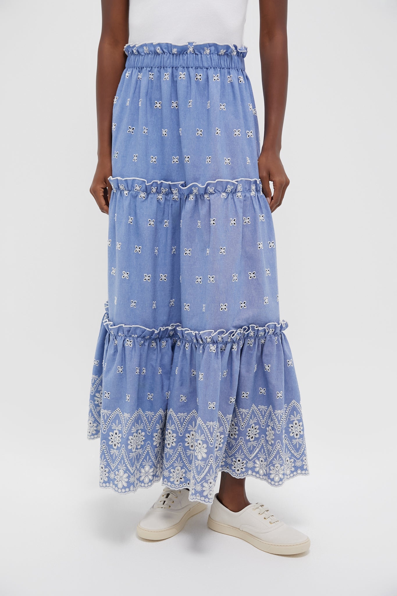Twirl worthy with its tiered layers and ruffle detailing, the Chambray Prado Skirt slips on with minimal effort while bringing maximum style. Adorned with delicate white eyelet embroidery, style this pull on maxi with the matching Chambray Embroidered Fontalina Blouse, gold hoops and sandals for a chic look.
