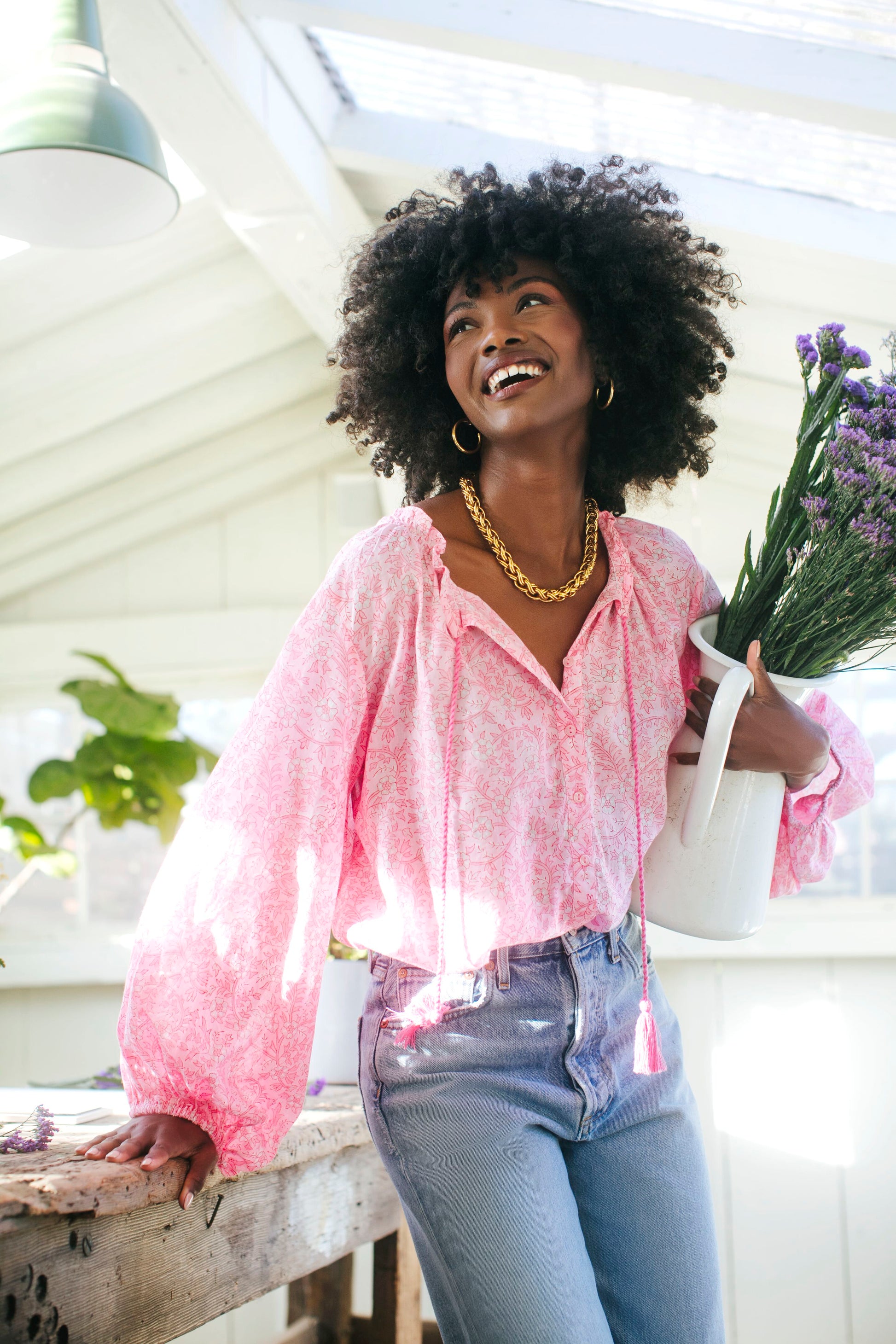 The Crocus Bardot Top is made from breezy block printed cotton. This style features a split neckline, button front placket, oversized blouson sleeves, and tassel tie details. Pair with denim and a leather belt for a trip to the farmersâ market.