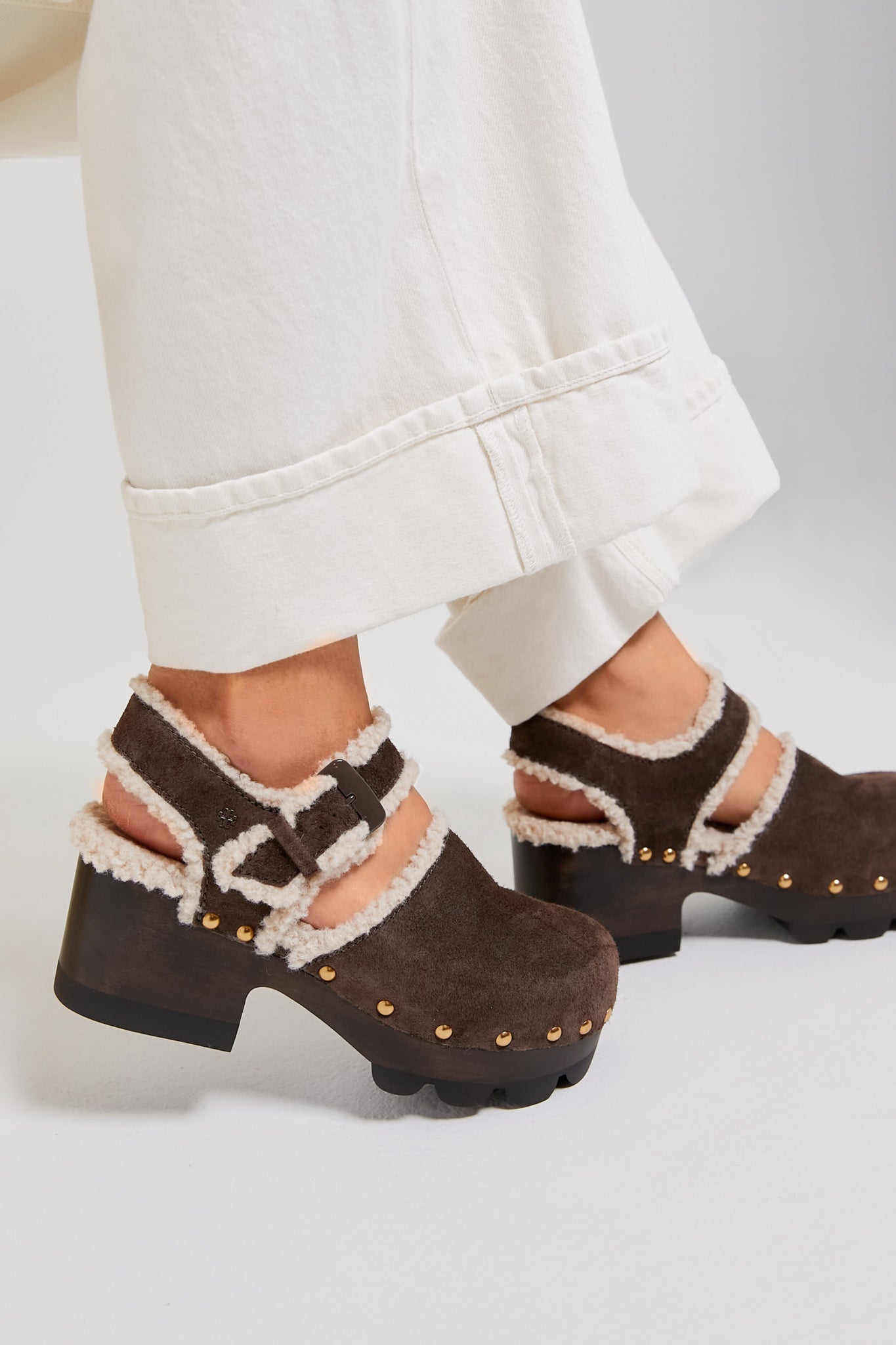 This '70s-inspired clog is reimagined to be a warm boot alternative to wear through the cold-weather months. Featuring a studded suede upper with cozy faux shearling lining, the effortless style is set on a wood heel and chunky lug sole. Pair with wide leg denim and sweaters or sweater dresses and belts!