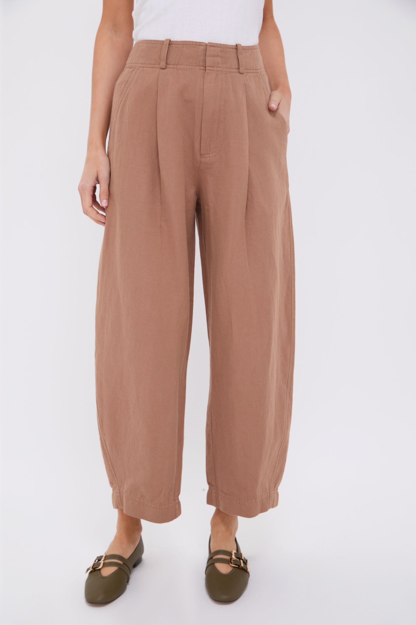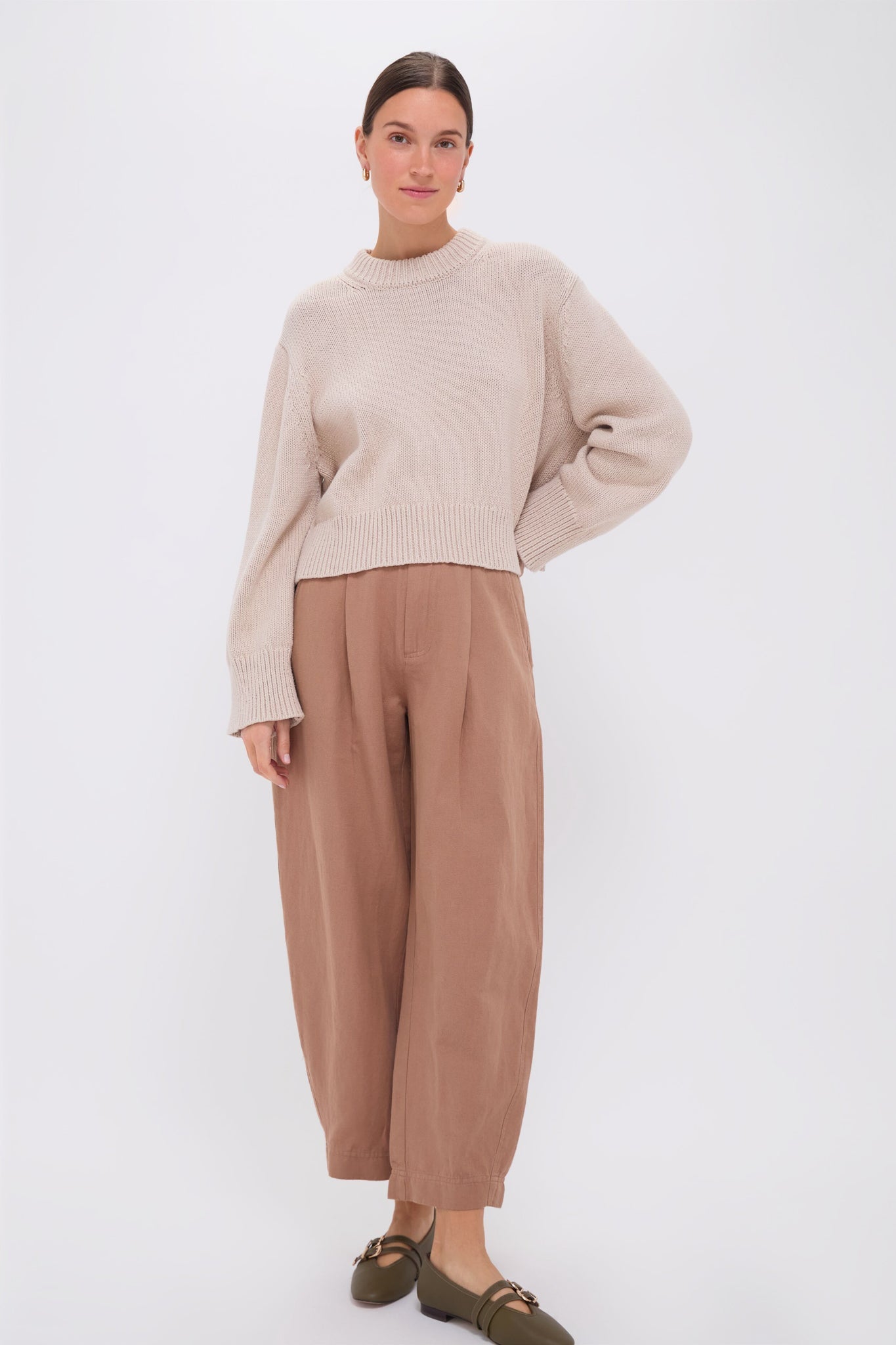The Bari Crop Trouser is a fun silhouette on a classic trouser. Featuring a high waist, cropped barrel leg, and slant pockets, these pants will take you from the office to drinks in no time! We recommend pairing with a sweater, ballet flats, and bag!