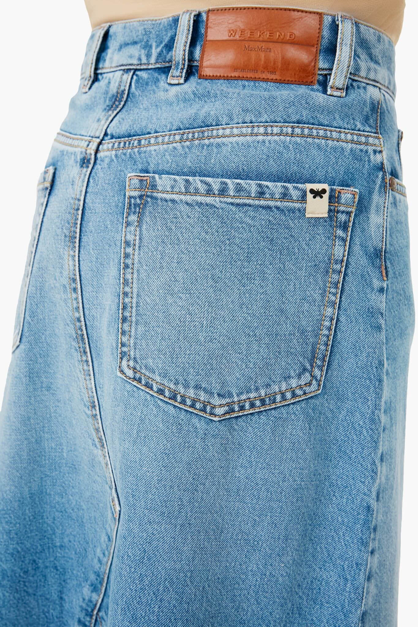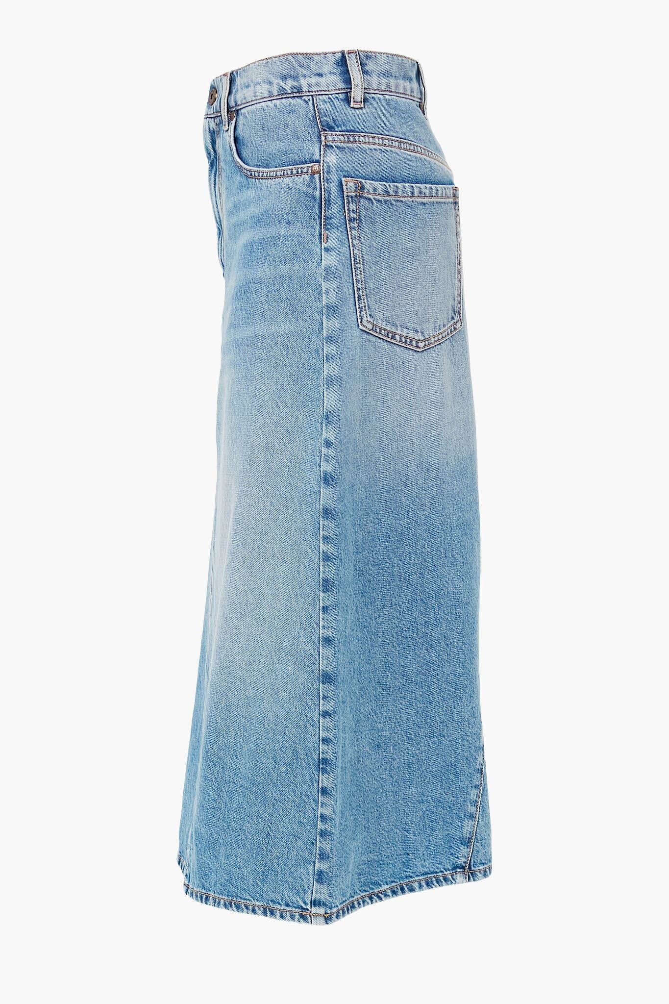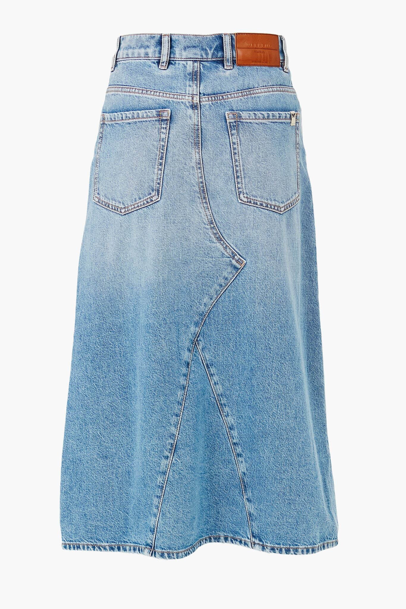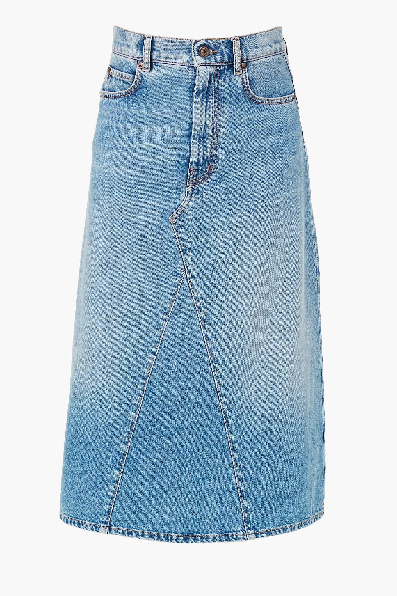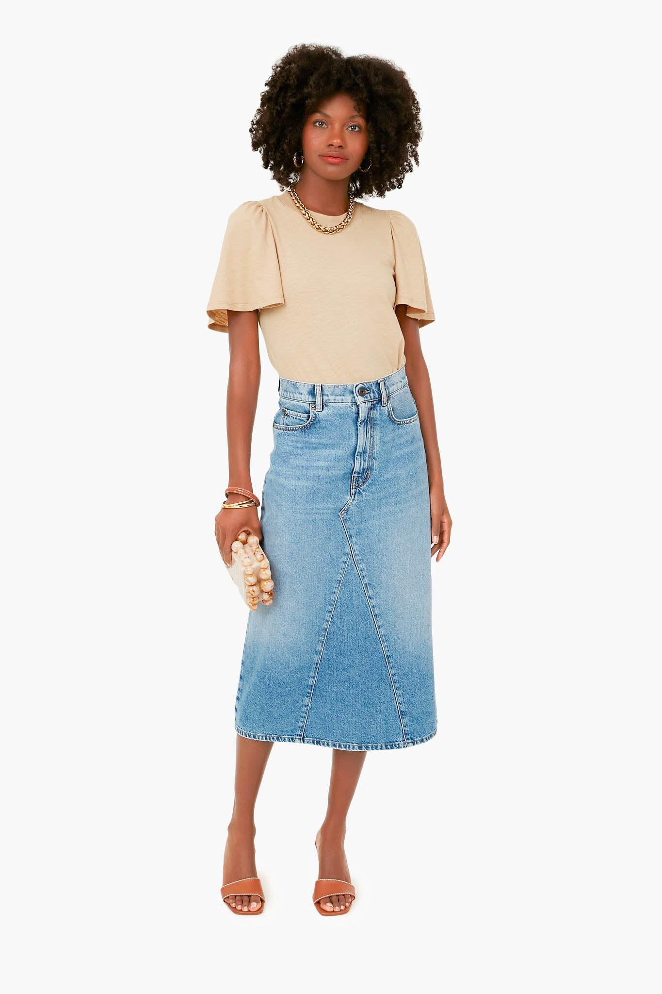 The Fiordi Skirt is a midi length, A-line cotton denim style. In a versatile silhouette, this piece can be dressed up or down to fit any occasion in your social calendar. With faded seams for a vintage feel and a high rise waistline, this piece will complete any outfit. Pair with a ruffled blouse for a feminine look, or with an easy tee for a casual day of running errands.