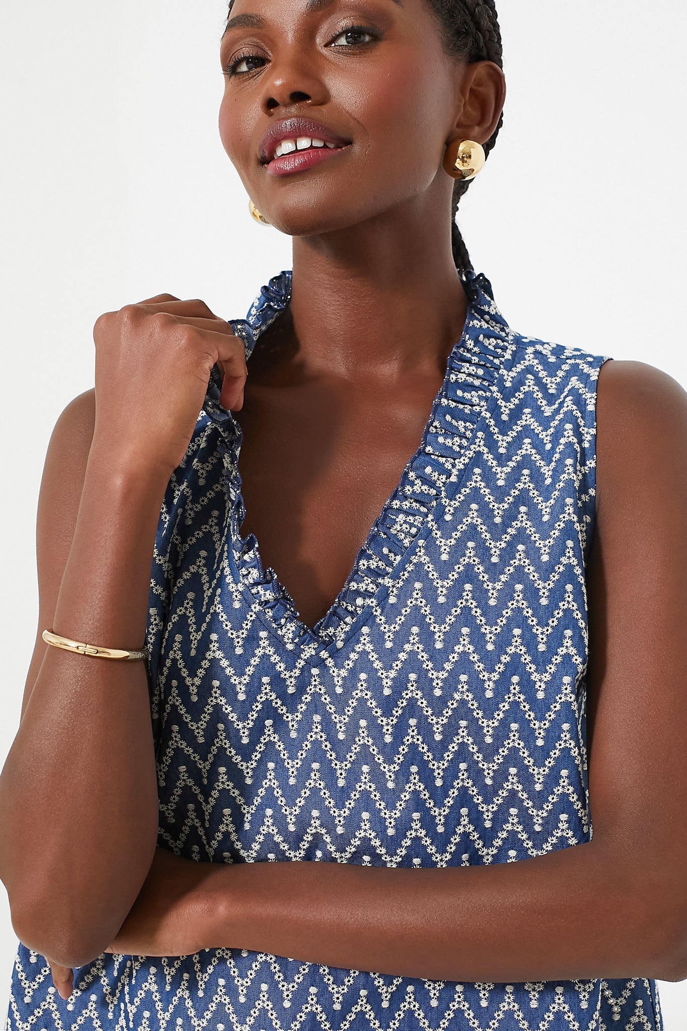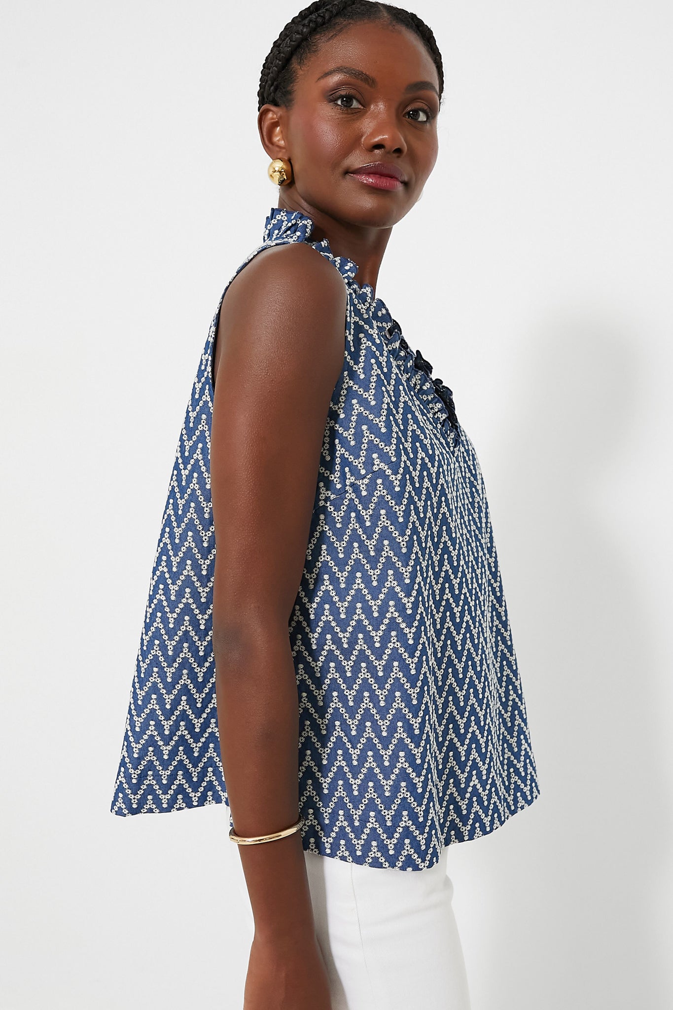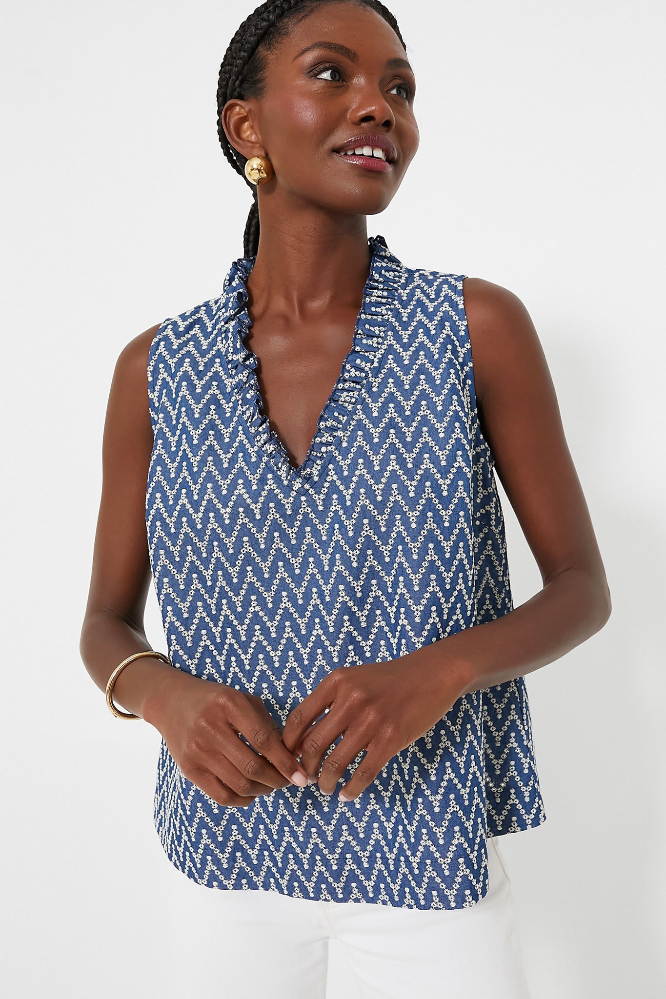 The Denim Stripe Veronica Top is a perfect warm-weather style for everything from work to play. This tank features a ruffle V-neckline, a slight A-line silhouette, and an eye-catching chevron pattern. Pair with denim for a monochromatic look, or with white jeans and sandals for a breezy summer style.