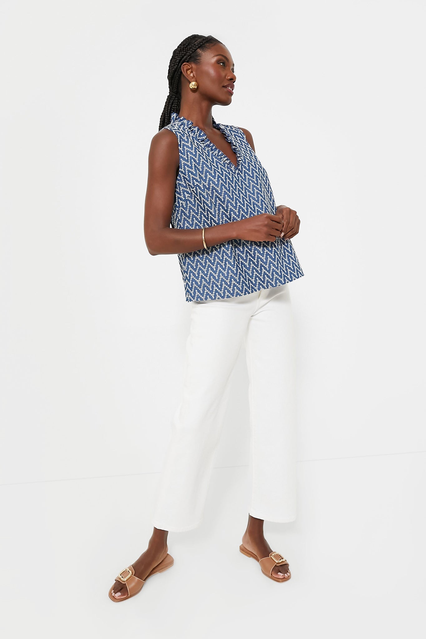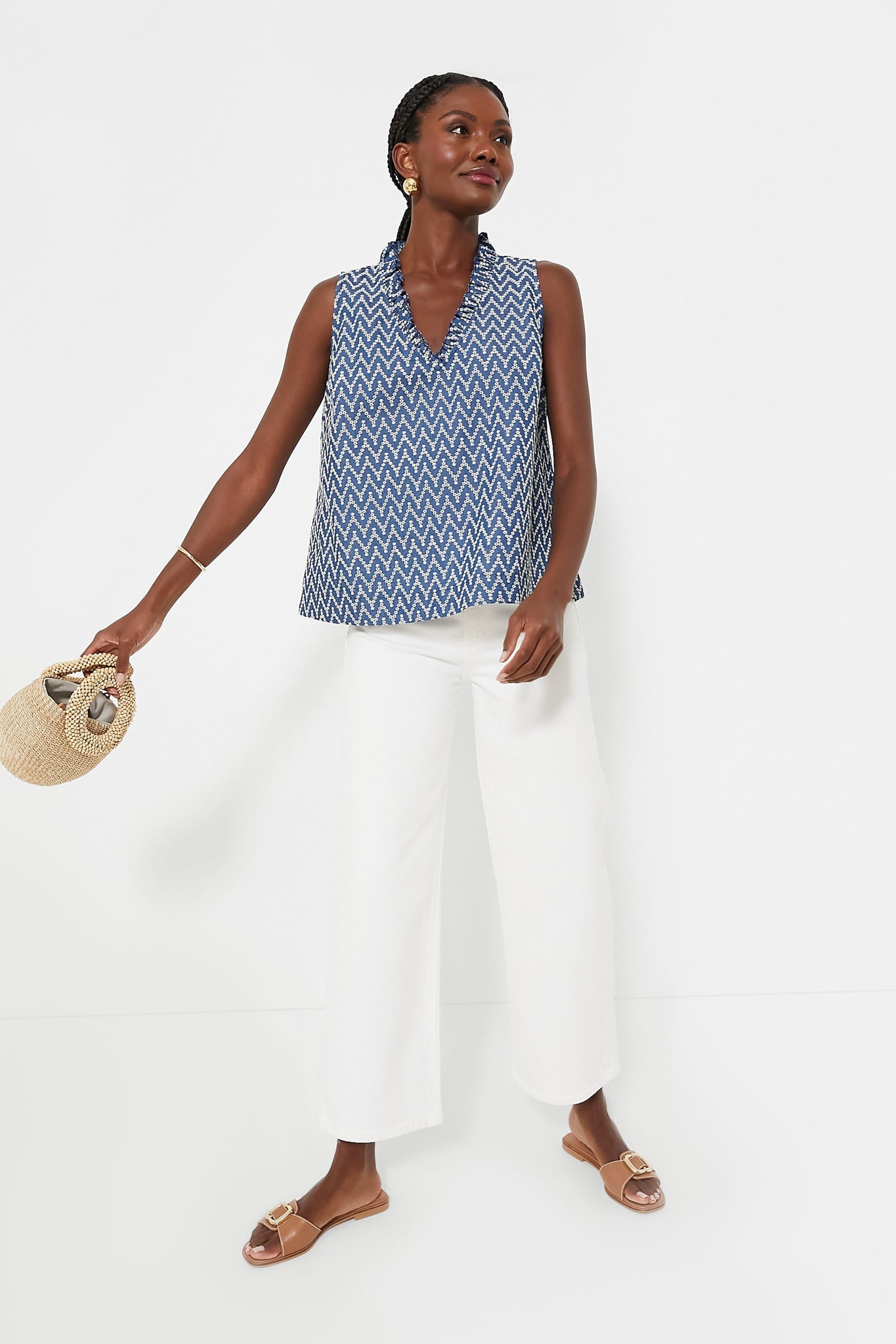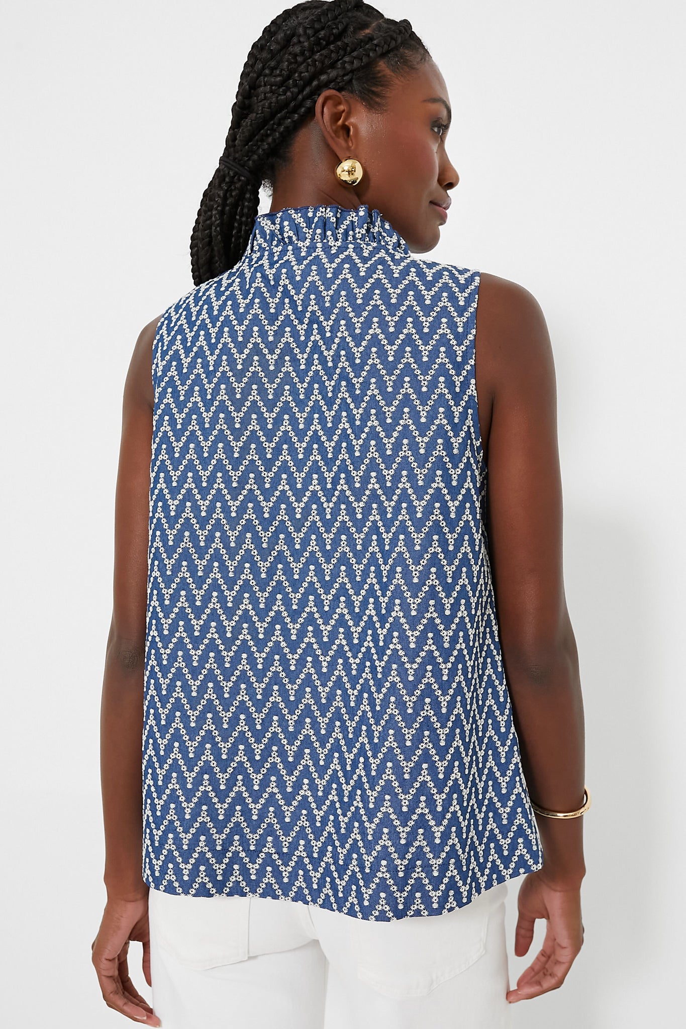 The Denim Stripe Veronica Top is a perfect warm-weather style for everything from work to play. This tank features a ruffle V-neckline, a slight A-line silhouette, and an eye-catching chevron pattern. Pair with denim for a monochromatic look, or with white jeans and sandals for a breezy summer style.