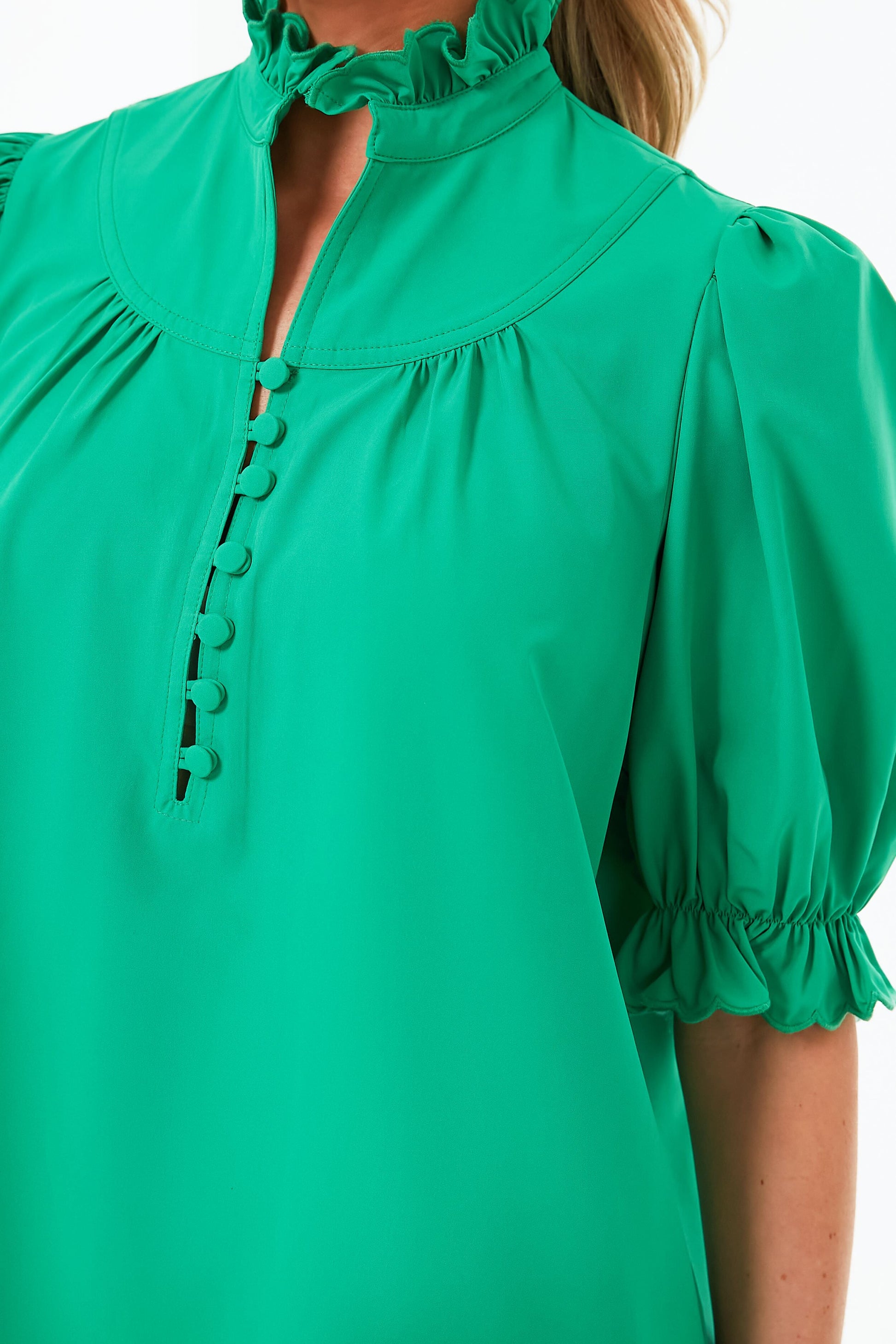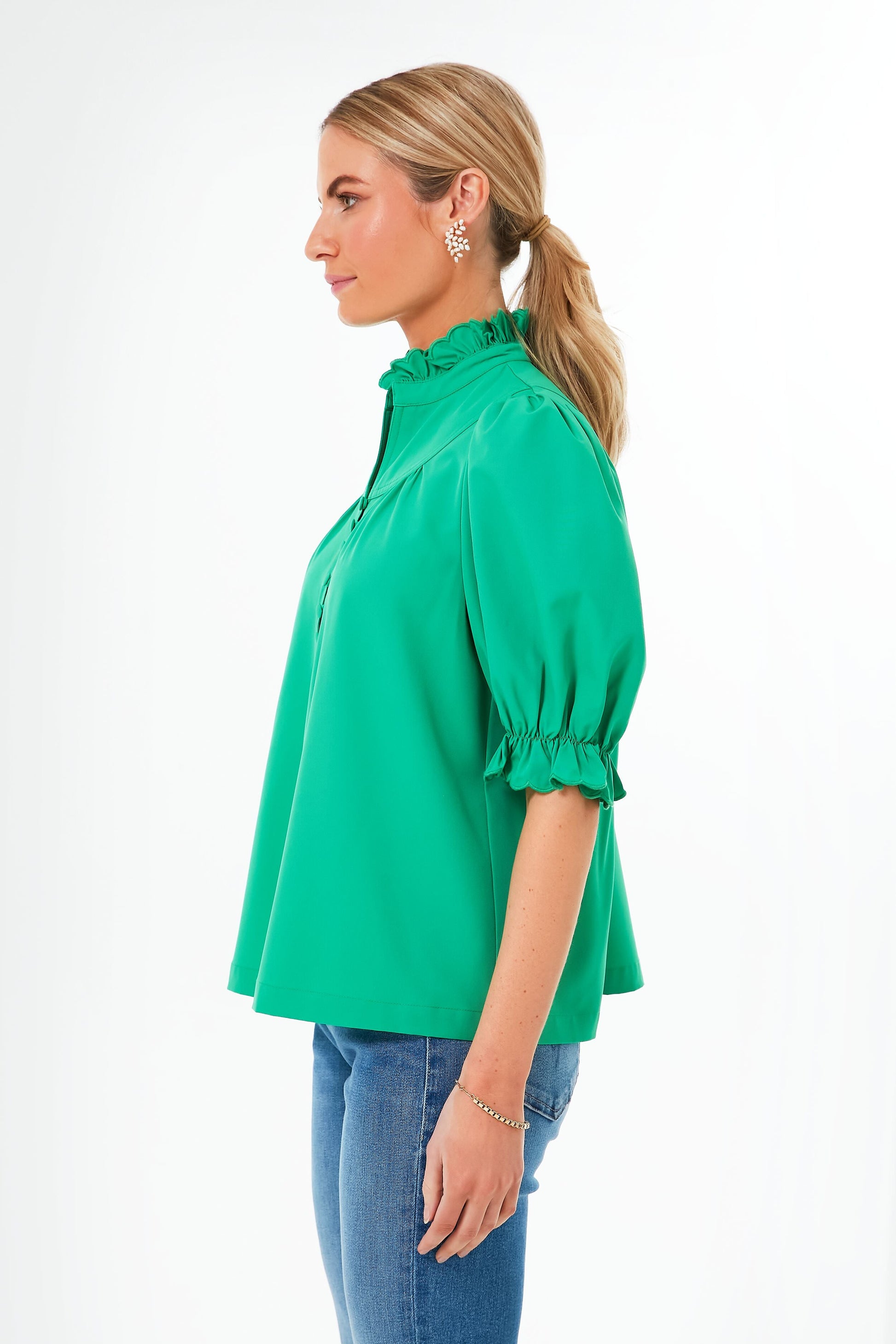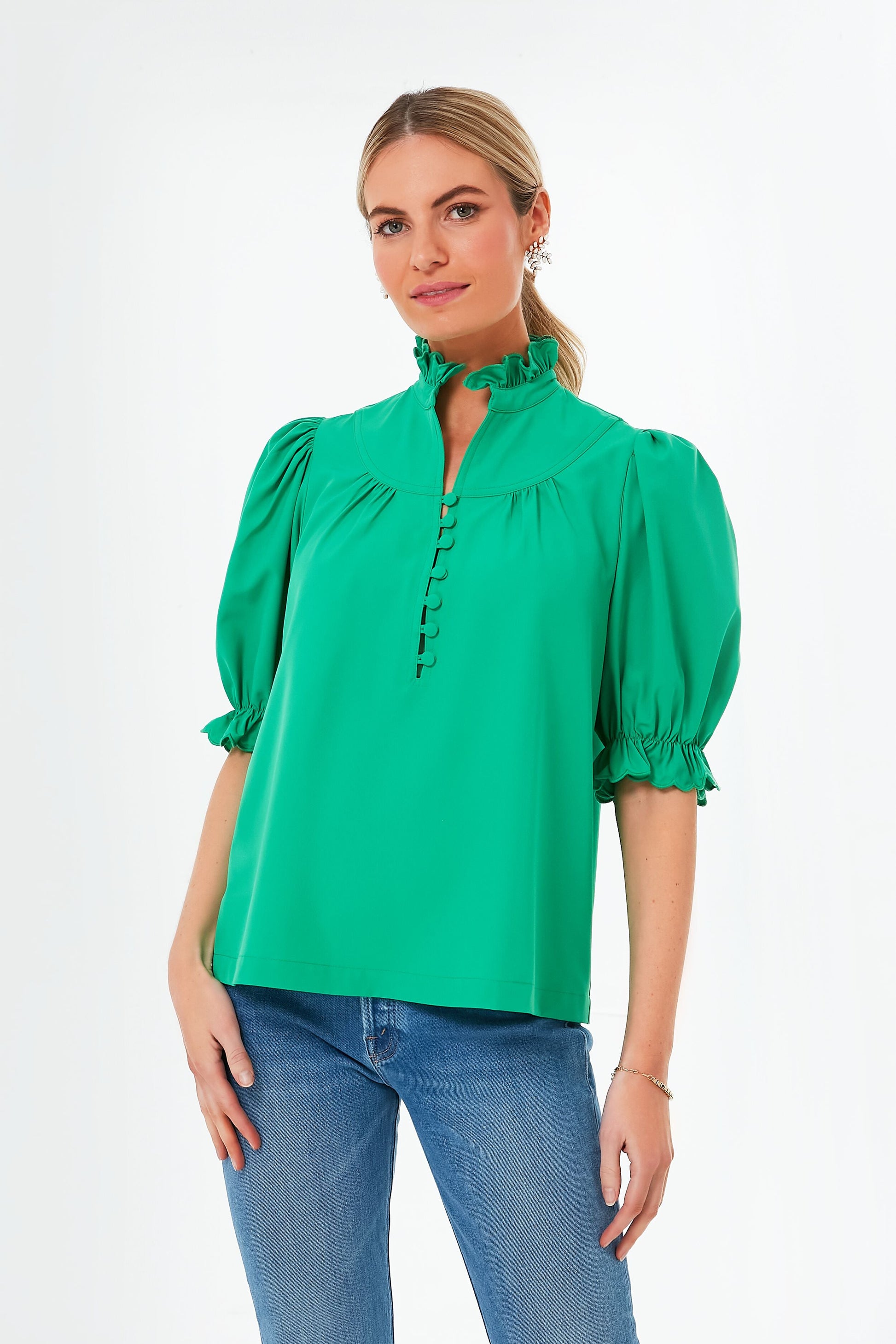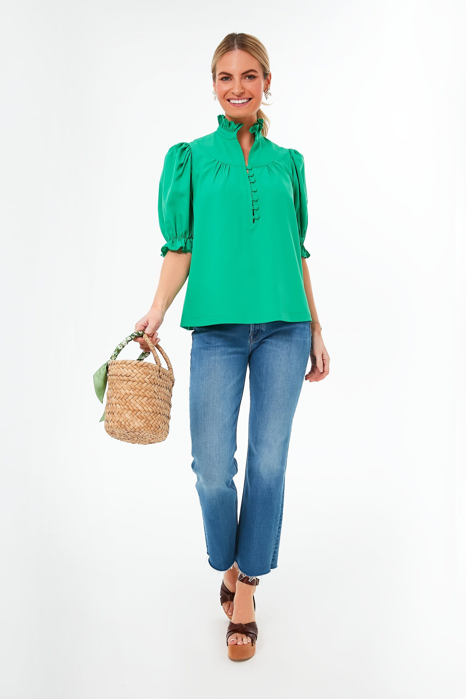 Your favorite top gets a flirty update - meet the Selena Blouse. Effortlessly chic, we love the emerald green shade and romantic details of this fun and feminine number. Featuring a ruffle stand collar and quarter length front placket with covered buttons, this puff sleeve piece pairs well with jeans and sandals for daytime and can be elevated with trousers and gold jewelry for dining out.
