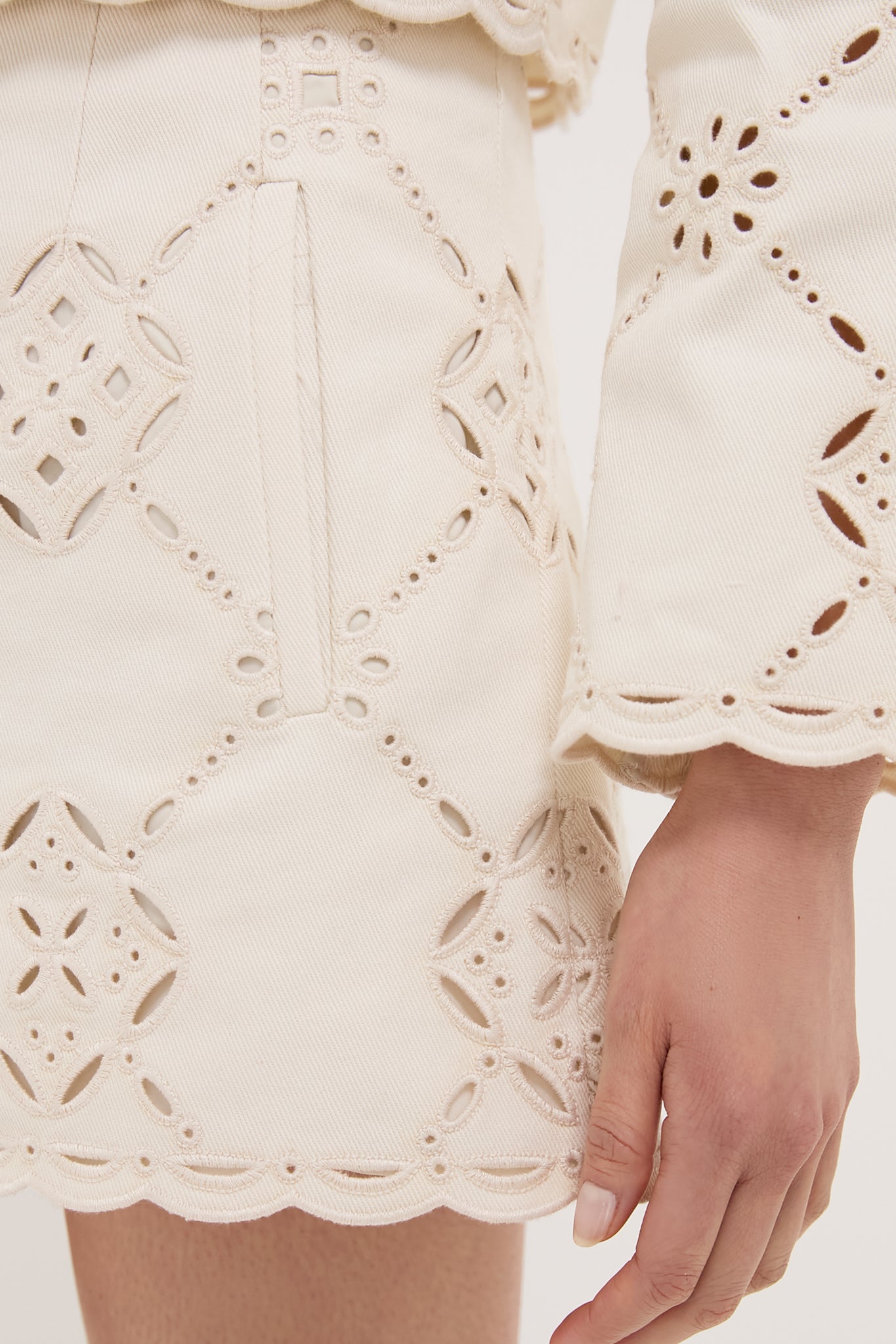 Expertly tailored from premium stretch cotton, the high-waisted Jazmin short is a clean, flat-front silhouette with graphic eyelets and charming scalloped edges. Pair these ecru eyelet shorts with the matching Ecru Adelaide Jacket for a chic weekend set.