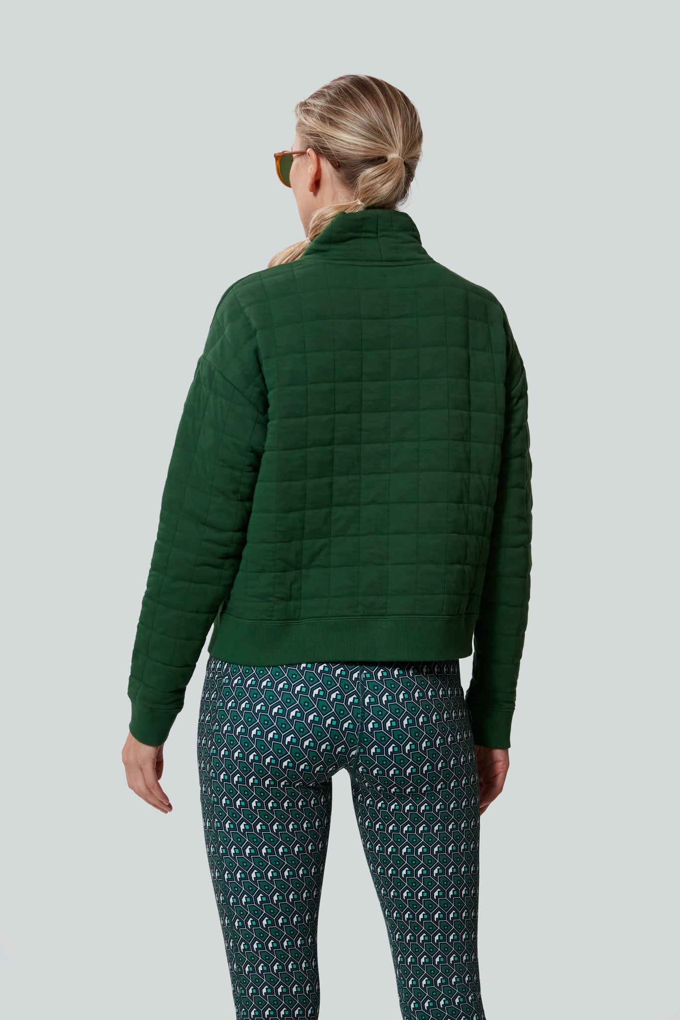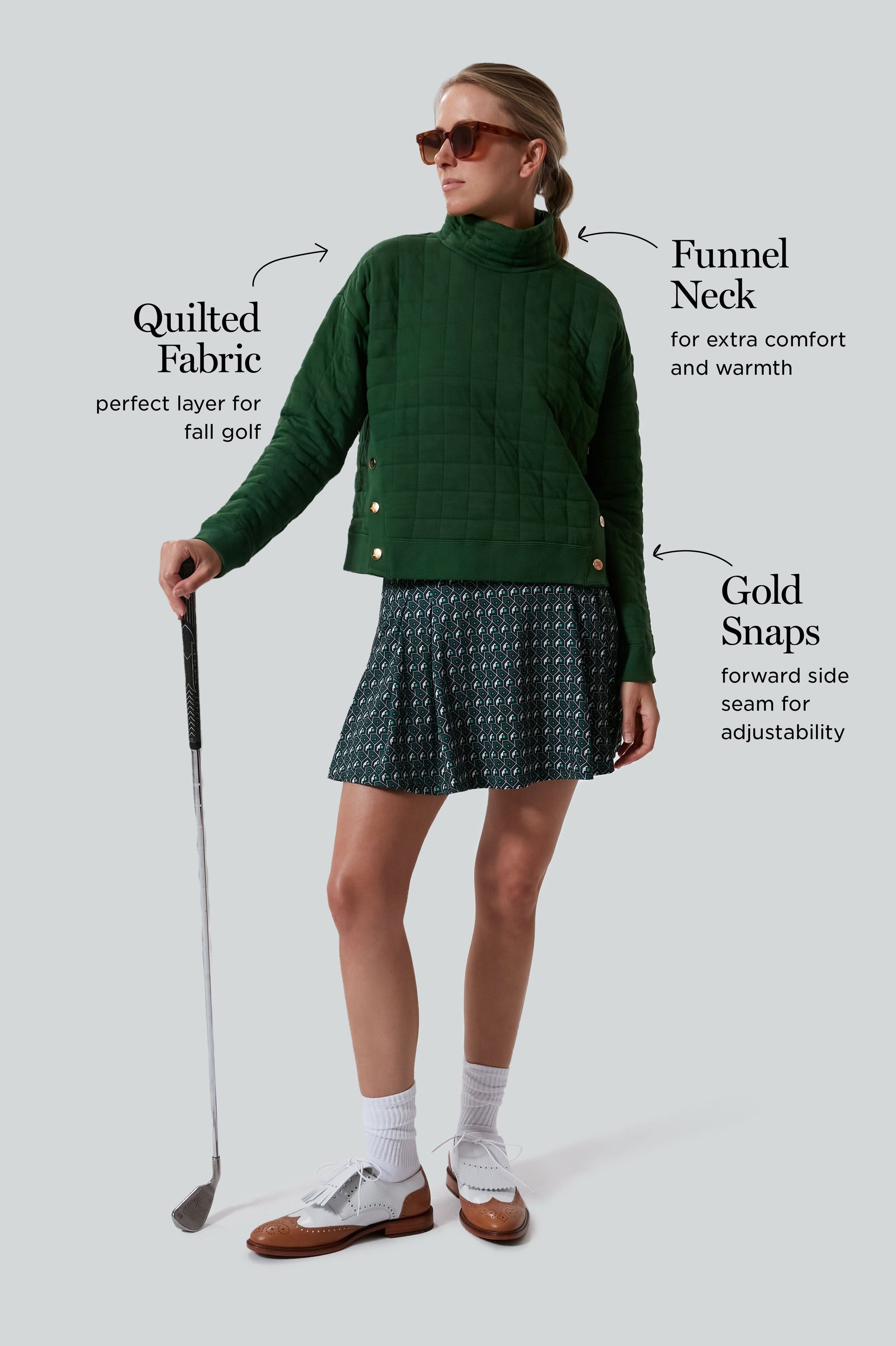 The Quilted Funnel Neck the comfy-cozy (yet elevated) style of our dreams! This chic pullover features a high neck, quilted body, and side snap closures for a look that can be worn with a tennis skirt or denim alike.