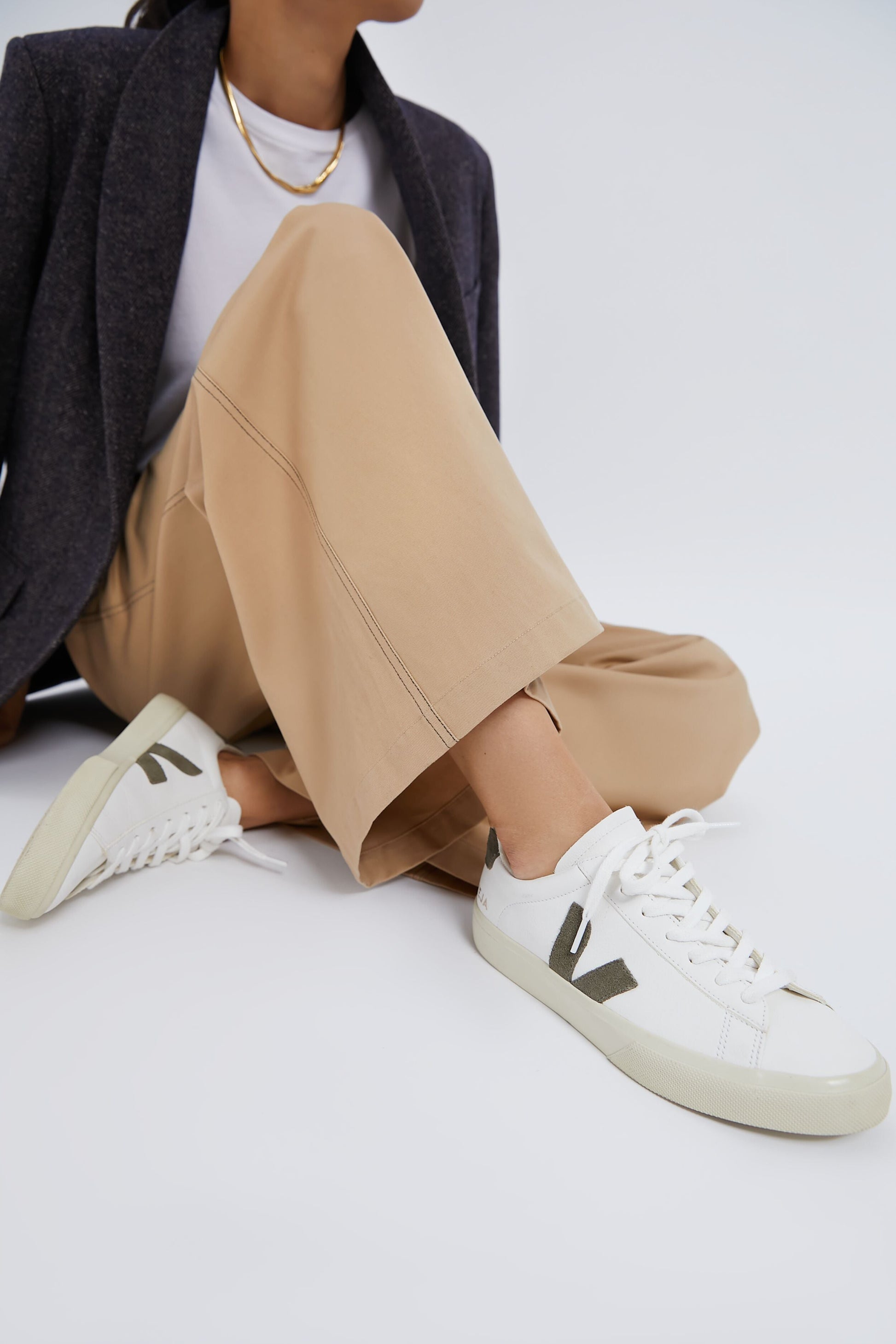 A white base with pops of neutrals, the Extra-White Kaki Campo Sneakers are a forever favorite. A staple in any closet, these lace up shoes feature a padded collar and footbed for comfort as you wear them all over town. The contrast coloring on the logo patch and heel create intrigue and make this white sneaker stand out from the rest. Pair with a day dress to meet friends for lunch, and wear with denim to run weekend errands.