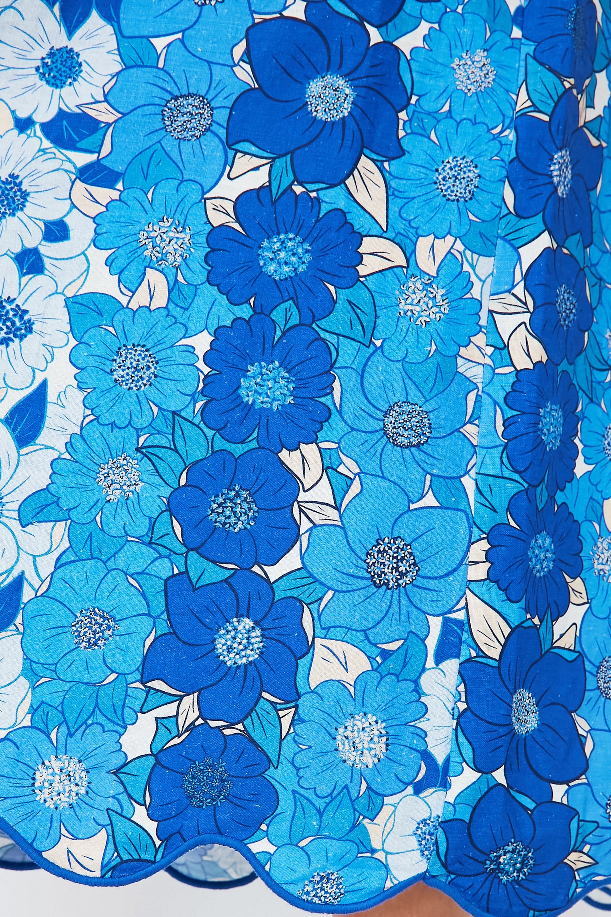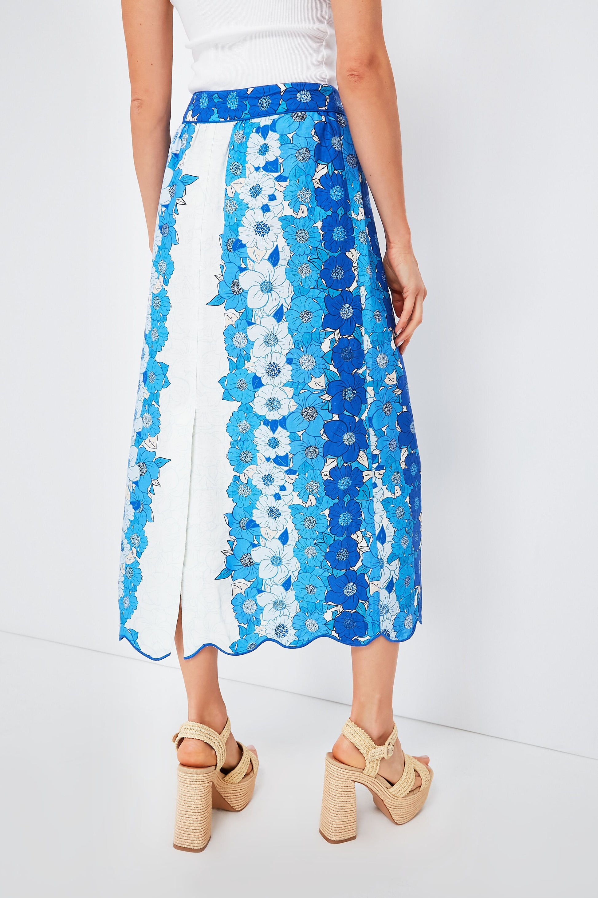 Get into a flowerful state of mind to bloom all season long. The Off White Skirt brings a springy and fresh silhouette that we can't stop "oohing" and "aahing" over. Boasting a floral striped print using various shades of blue, this midi pairs perfectly with many outfit toppers, from casual white tees to sweaters, but our favorite is the matching top to complete the set. Finished with a gorgeous scallop hem that adds a playful and thoughtful touch, we are opting for neutral sandals and blue accessories for a subtle monochromatic moment that'll garner plenty of compliments.