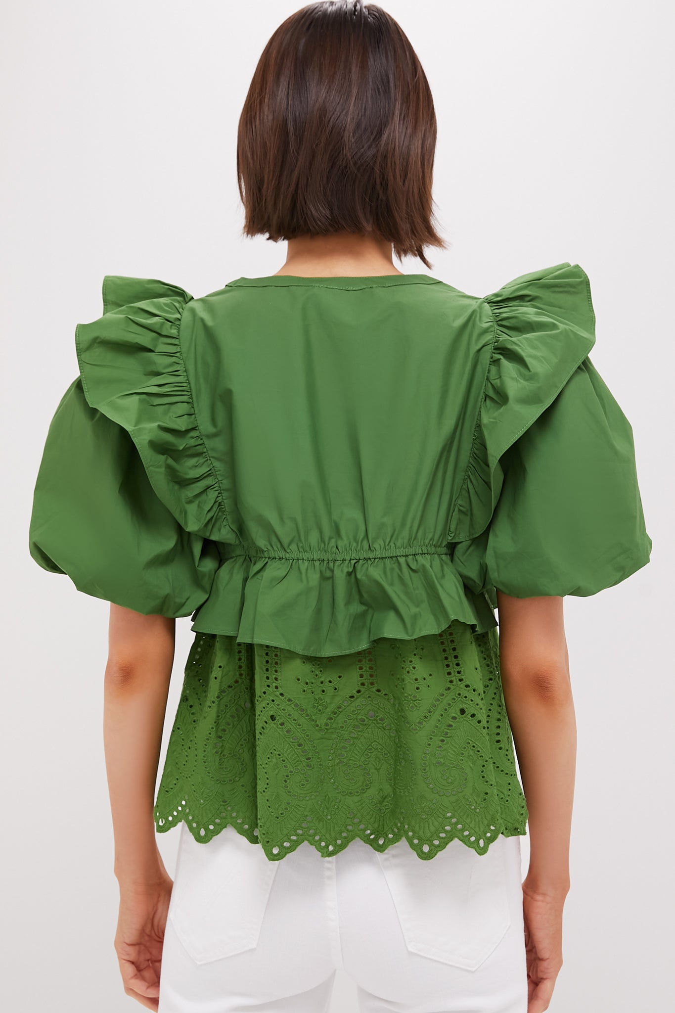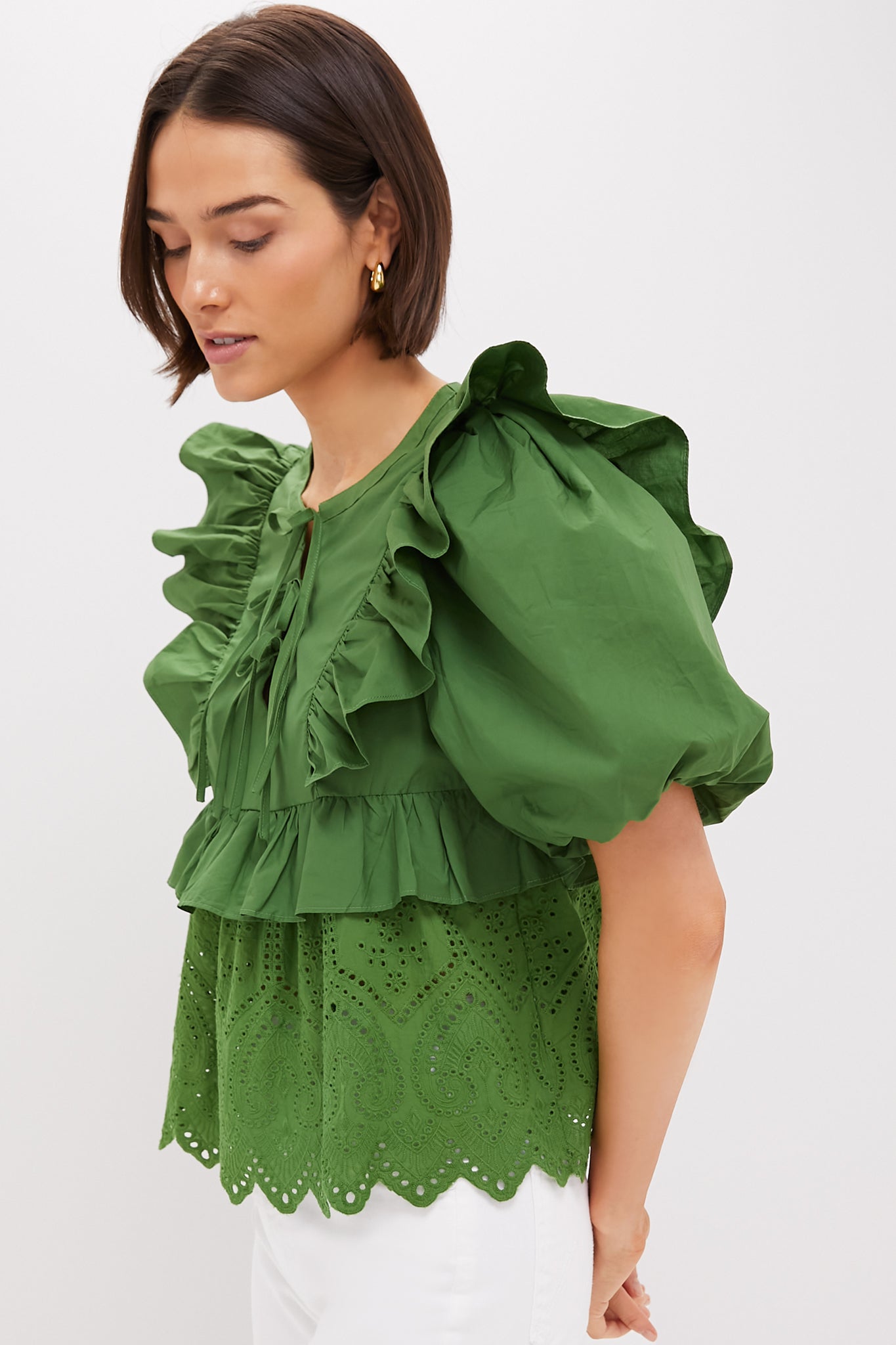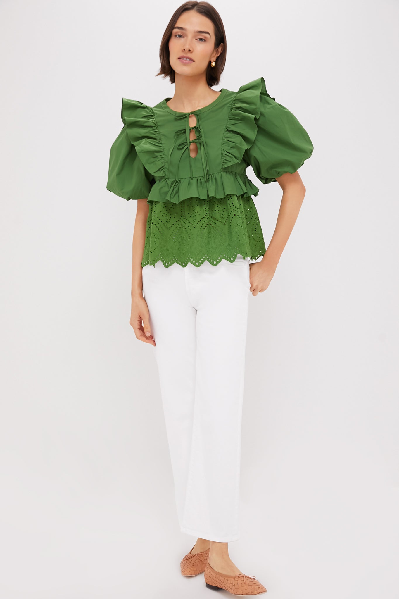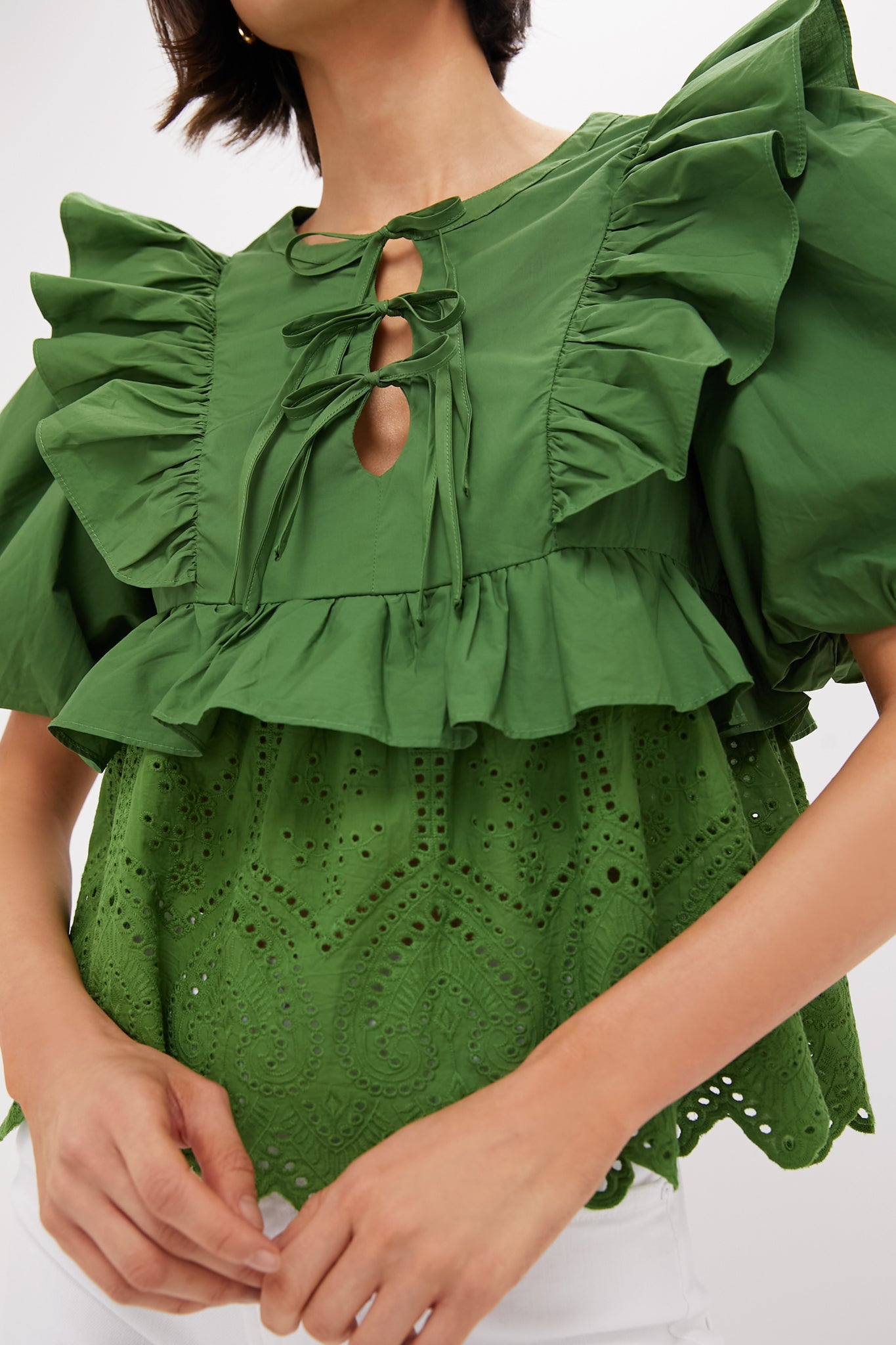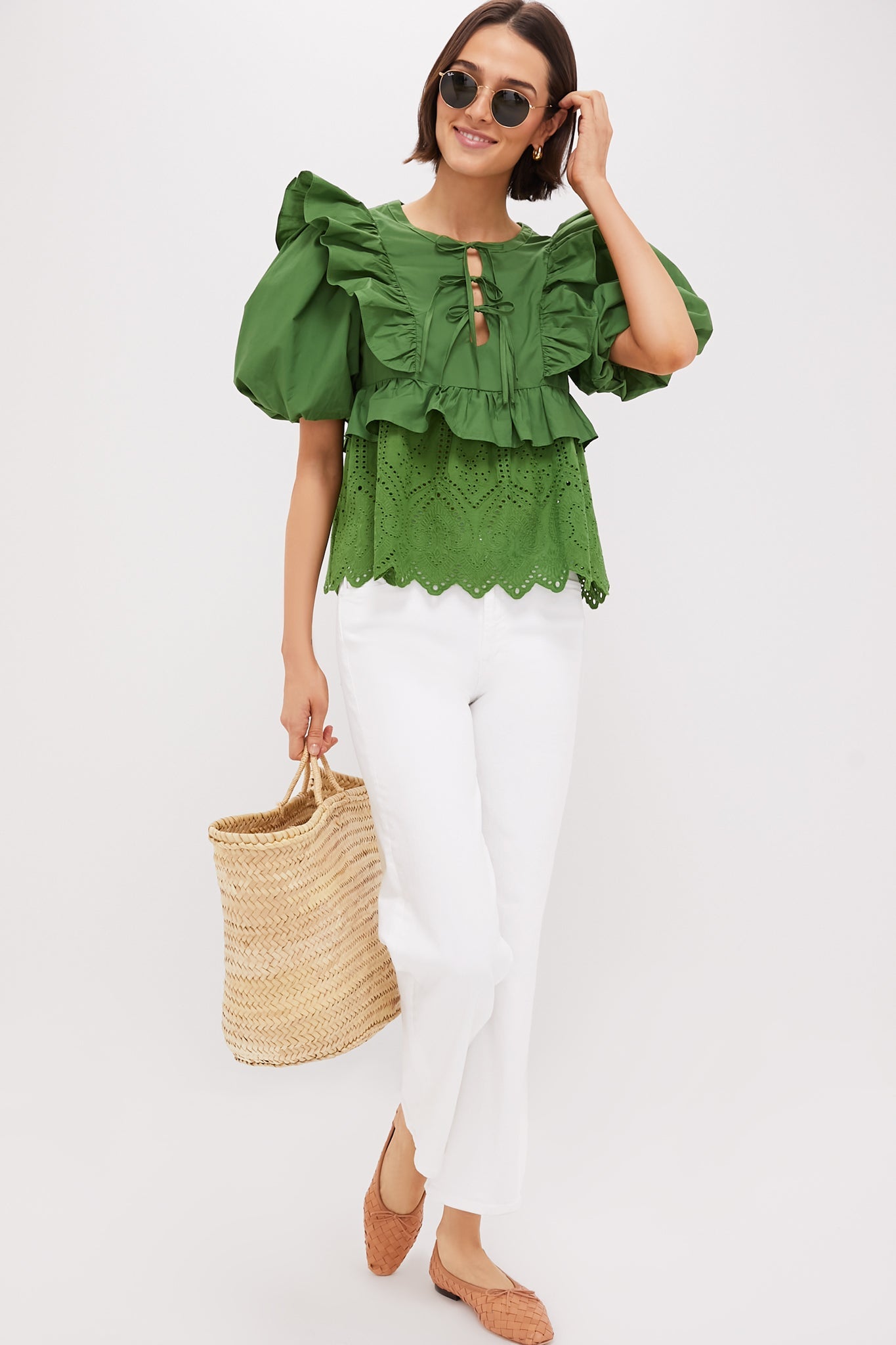 Somehow both sweet and sassy, the Forest Green Ruffle Nadia Blouse does it all. Short puff sleeves, ruffle features, and eyelet detailing on the hem make for a charming silhouette that's contrasted by the slightly sultry set of triple neckties with cutouts that line the bodice. Perfect for fall and beyond we are pairing this fun and feminine number with denim of all colors and sandals for a chic look that checks all the boxes.