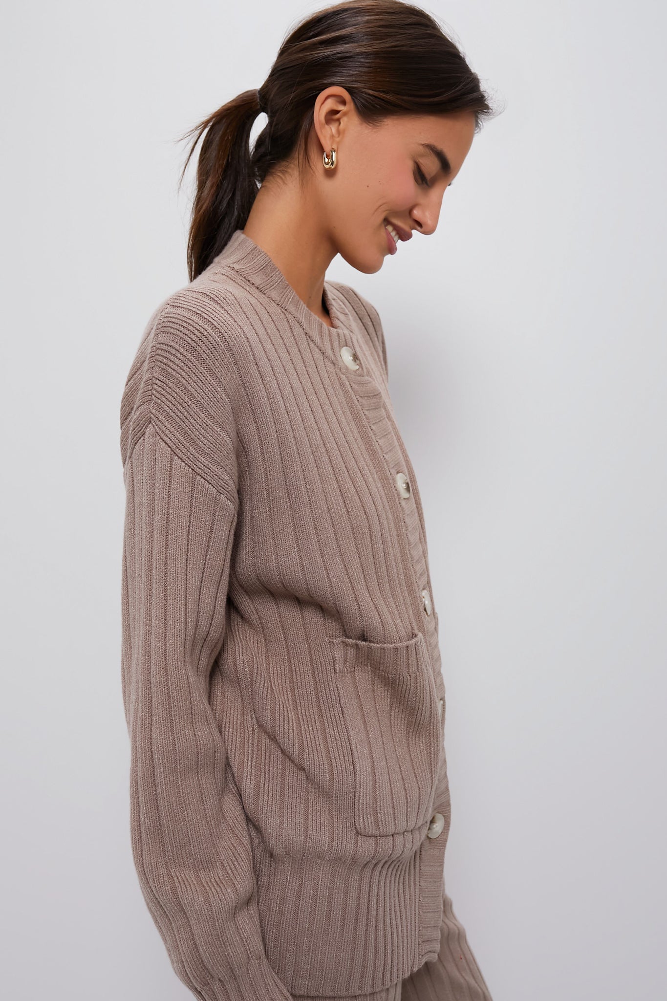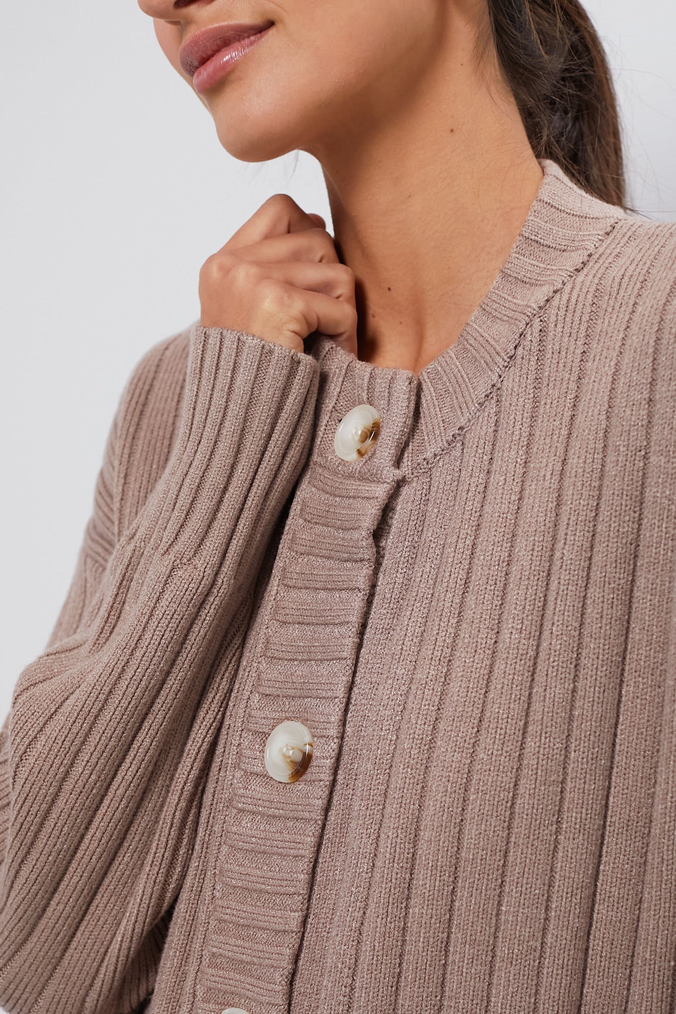 Made from soft viscose yarn, this longline cardigan features a chunky wide rib and a relaxed fit. Its button-through design and patch pockets blend style with comfort. Wear as a set with the Fungi Simeon Wide Rib Knit Trousers for a chic, coordinated look.