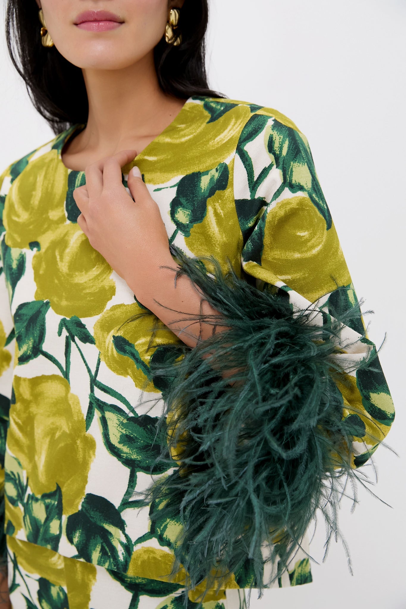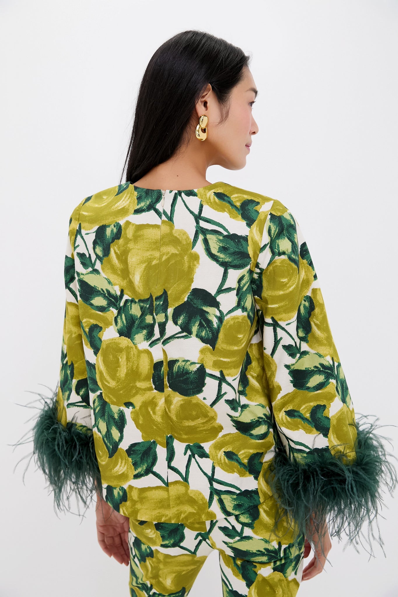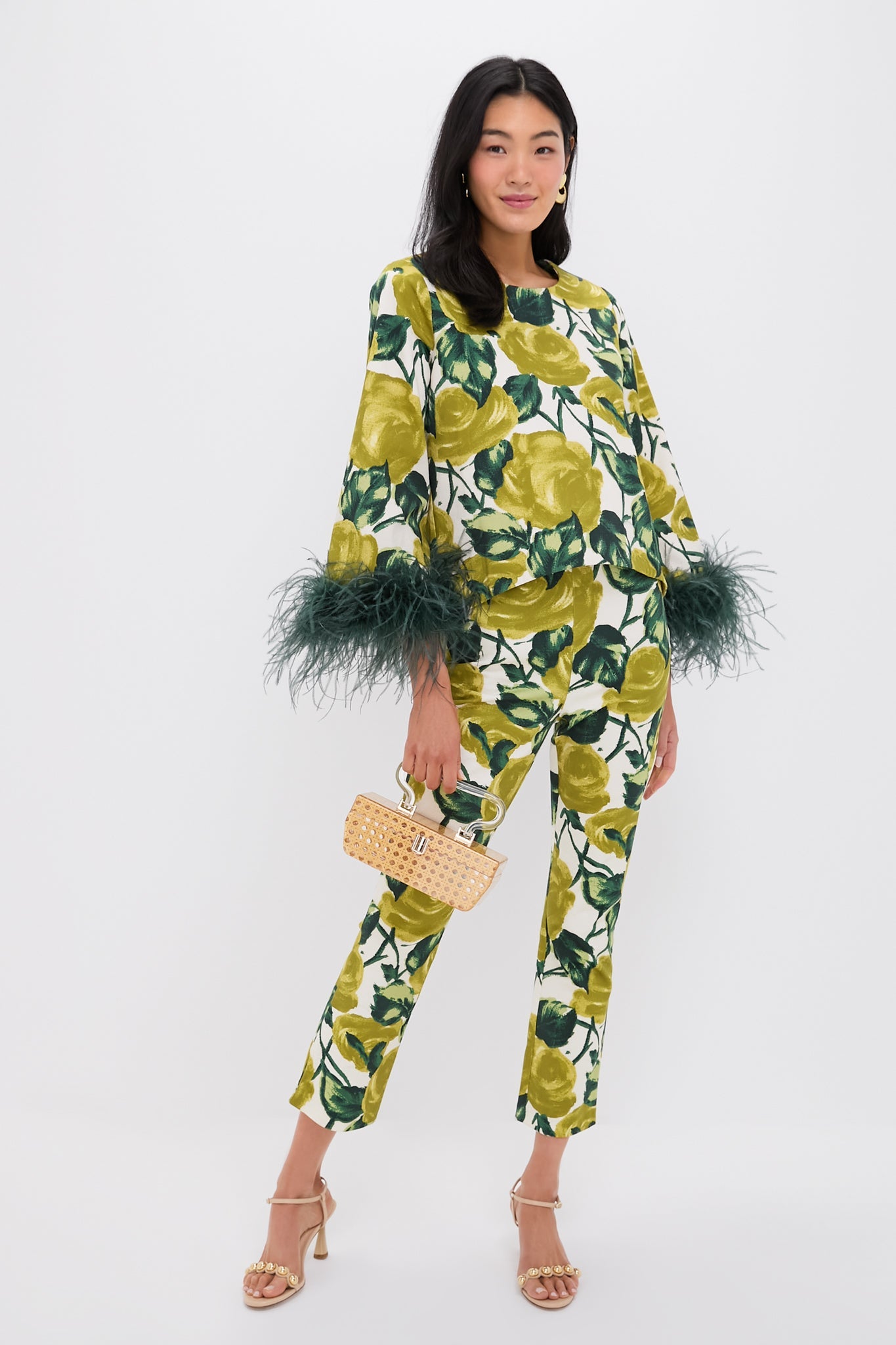 The Giverny Gardens Stretch Cotton Maxine Top is an elegant style that boasts a vibrant floral print and fabulous feather cuffs. Pair with the matching Giverny Gardens Stretch Cotton Ashford Pants and heels for a chic ensemble!