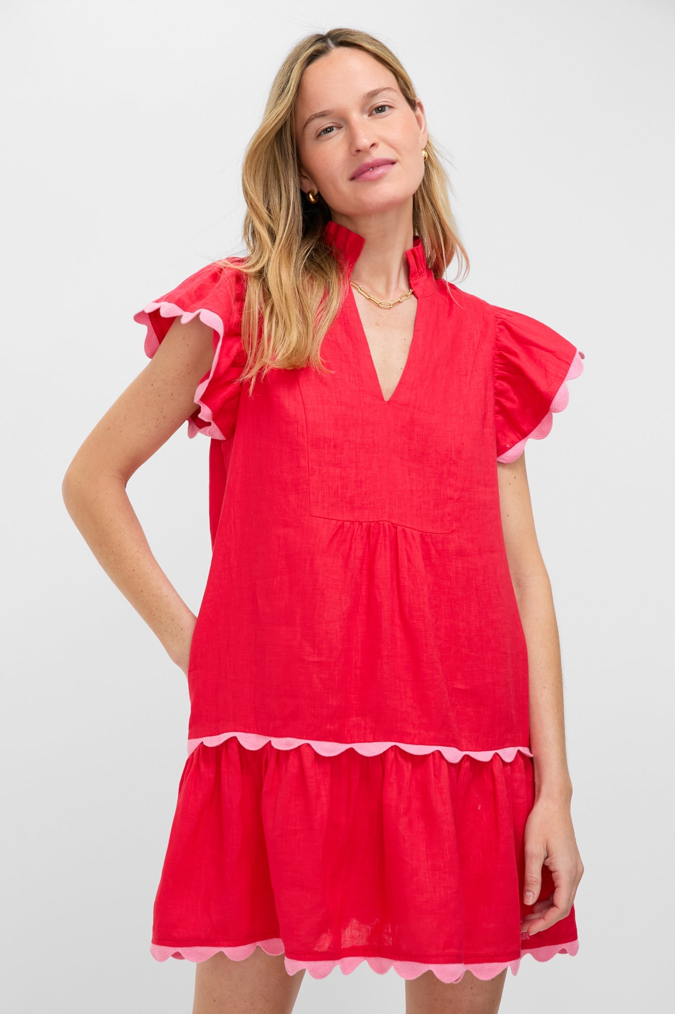 Hibiscus Red Linen Flutter Sleeve Bella Dress