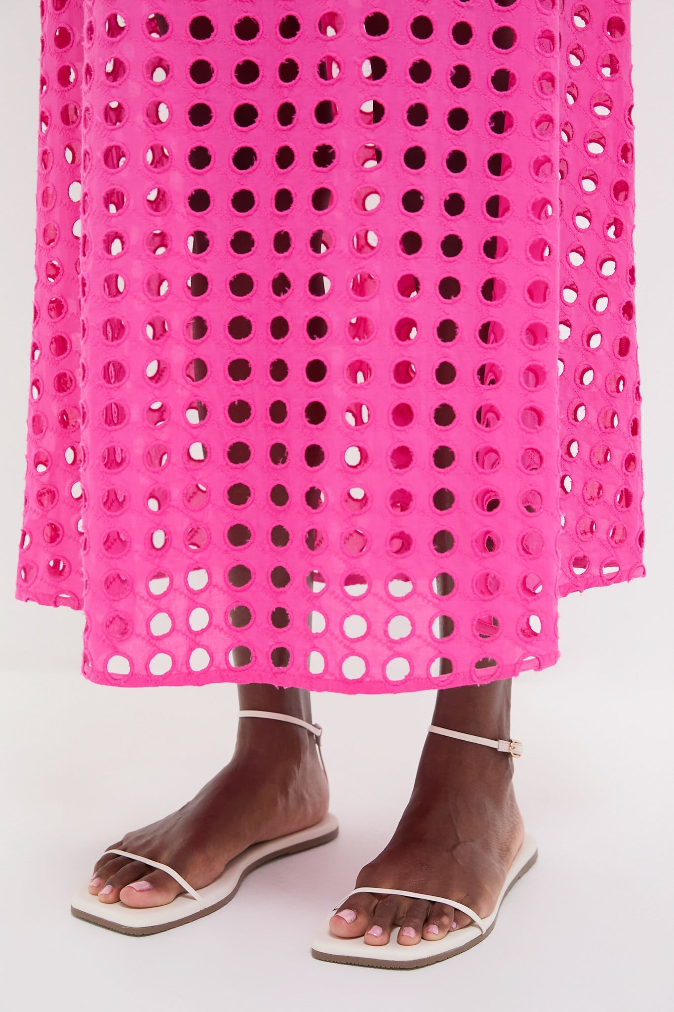 The Hot Pink Eve Skirt boasts a flattering A-line silhouette that flows effortlessly with every step. With a mini slip underneath, embroidered eyelet detailing and an elastic waistband, this chic maxi is ideal for warm-weather days, we are pairing this with a white tank and sneakers for strolling around town, or over a swimsuit and a raffia tote for a sunny day by the sea.