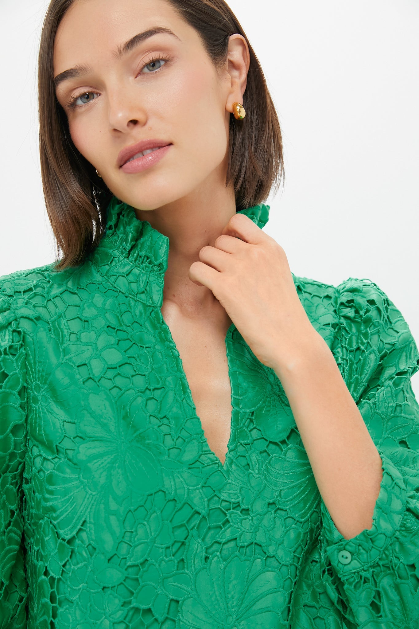 A feminine silhouette filled with movement and grace, the beauty of the Kelly Green Lace Cath Dress is all in the details. Featuring a gorgeous lace overlay, a ruffle collar, and slight puff sleeve this lightweight beauty is your go-to dress for garden parties, dinner out, or wherever your plans take you this season.