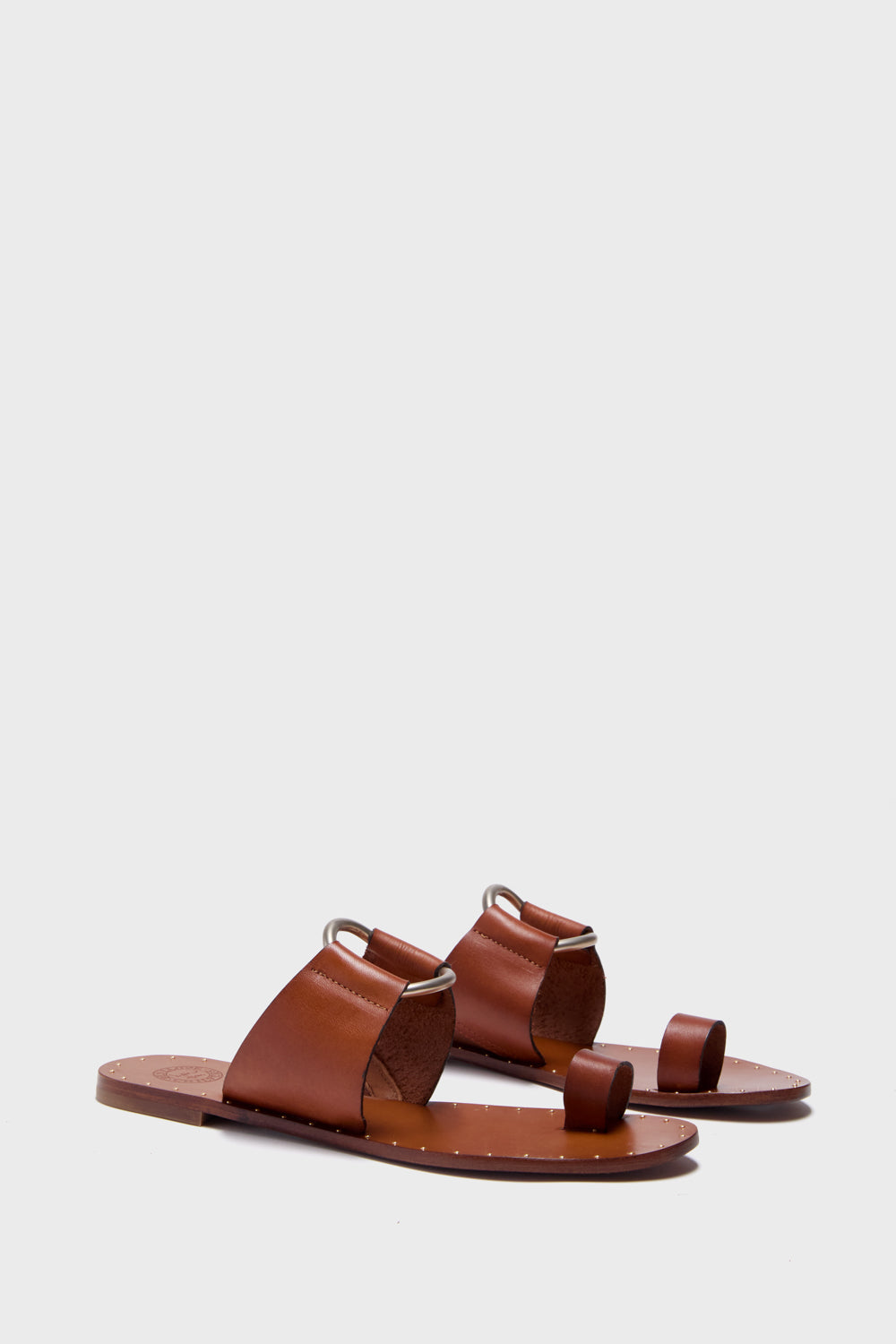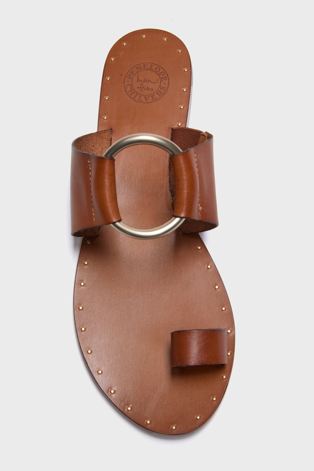 Inspired by the elegant Madame Ghani and her splendid stately home, this is a sandal with smooth edges, and a sleek silhouette. The curved gold ring adornment was added for decorative impact like so many moments found inside Madame G's home, Villa Verde.
