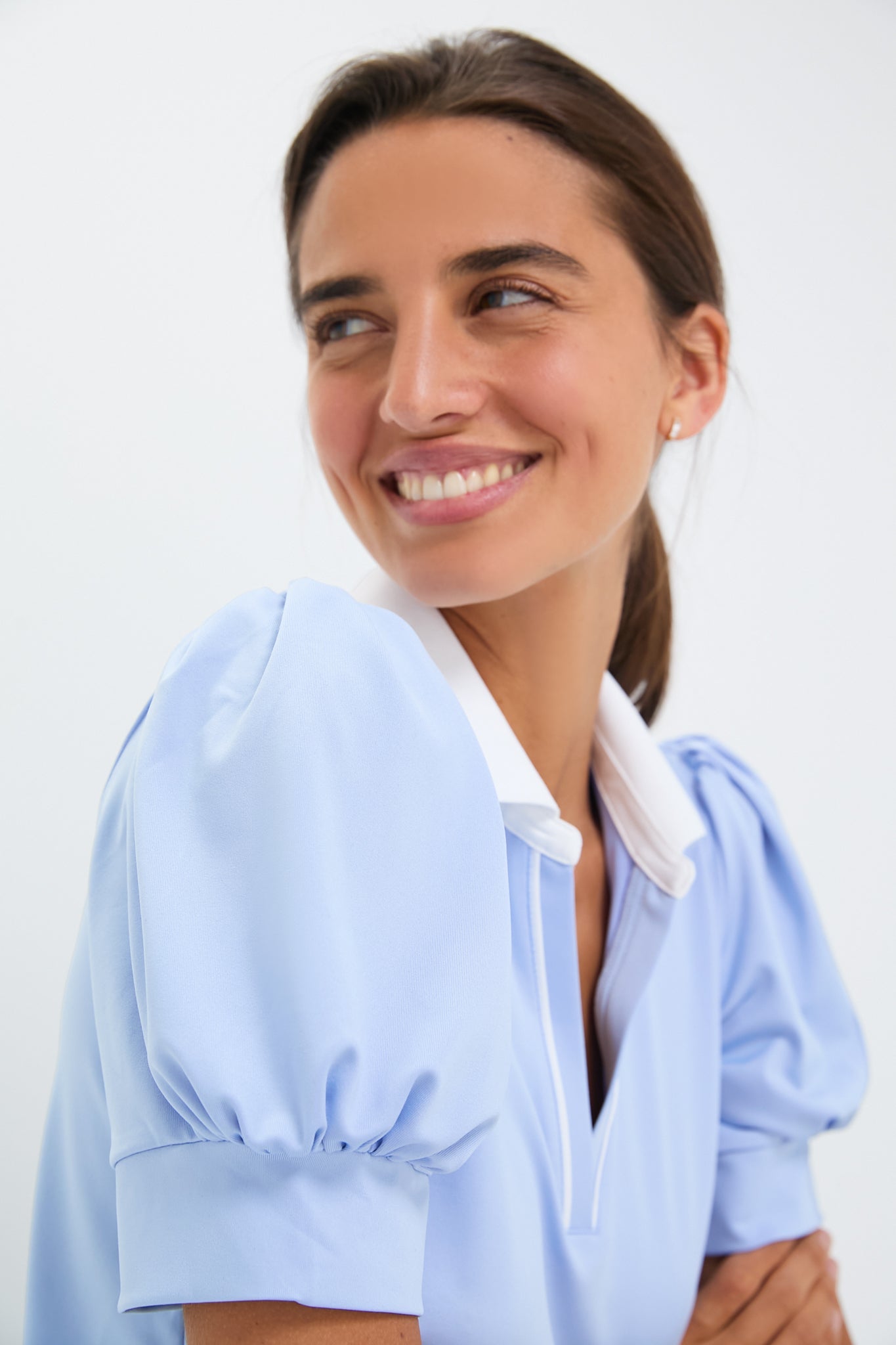 Prep for the U.S. Open (or a coffee run) in the Puff Sleeve Caroline Polo. With an open collar, puff sleeves, and a high low hemline it has feminine details that make this polo unlike any other.