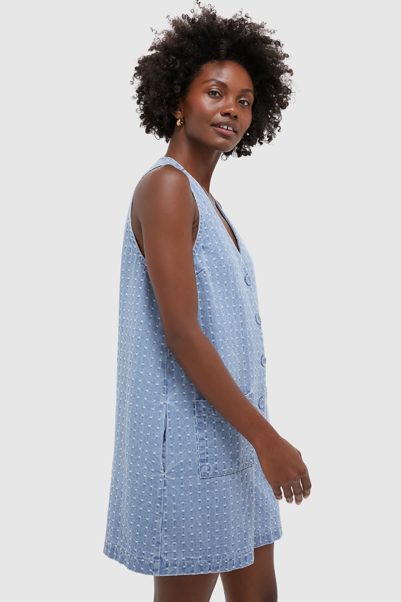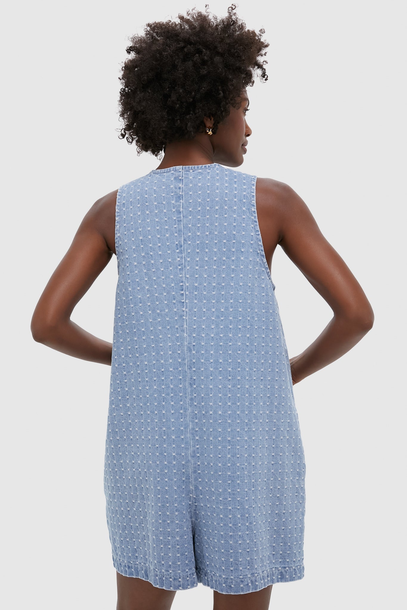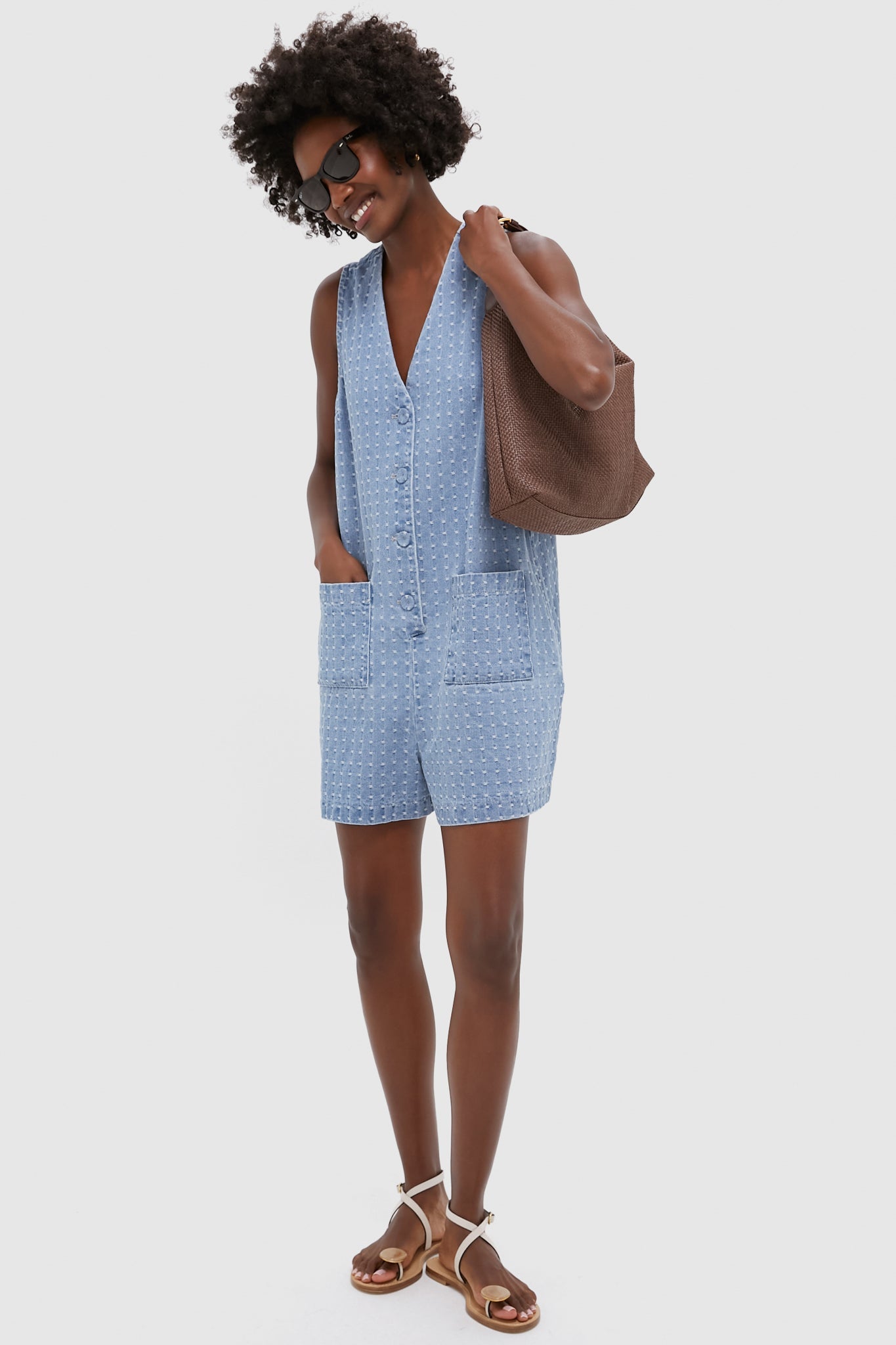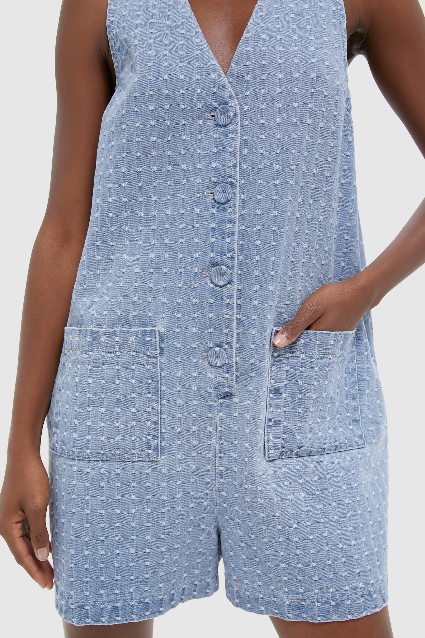 Effortlessly chic, this one-piece is perfect for anything and everything! From brunches and get togethers to happy hours and vacations, this easy yet elevated style has you covered. The Light Wash Denim Dot Myla Romper features two patch pockets, button front closure, and a textured fabric to create cool contrast. Pair with sandals or flats and a tote for easy, warm weather wear.