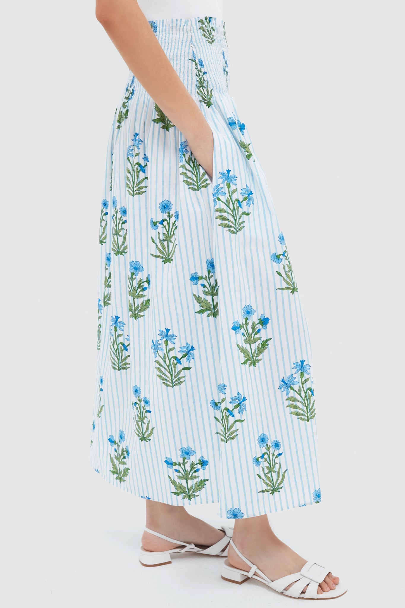 Meet the multitasker your summer wardrobe needs— the Lily Stripe Alba Skirt. This smocked beauty works as both a flowy skirt and a strapless dress. Hand block-printed on soft organic cotton in blue and green vintage-inspired buta prints, it's equal parts comfortable and charming. Pair it with a tank or the matching Alba Shirt for coordinated chic look.
